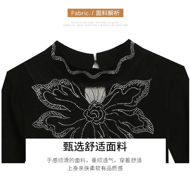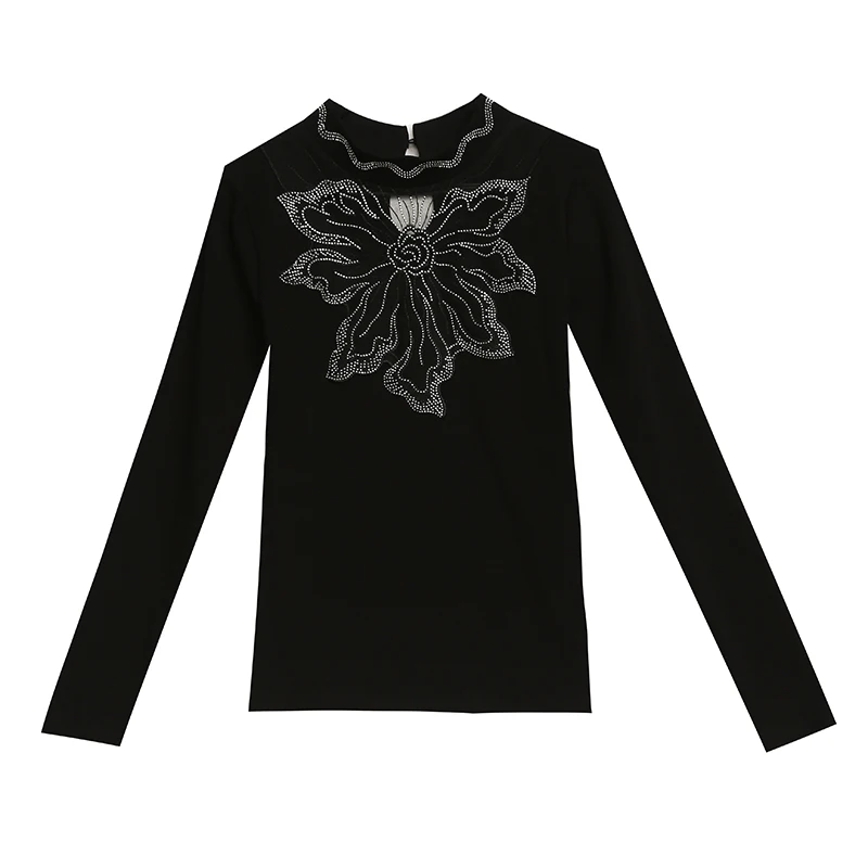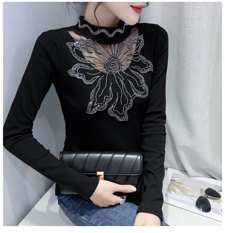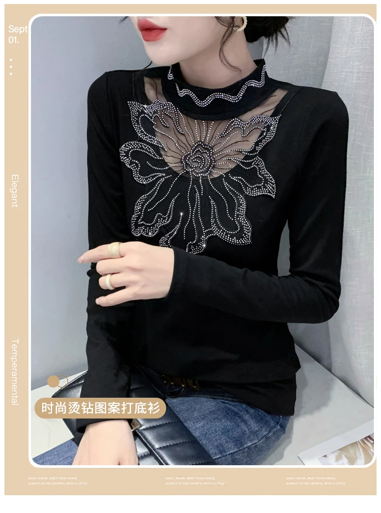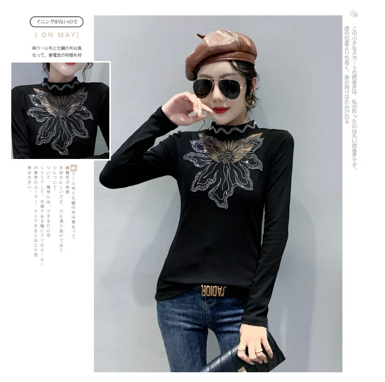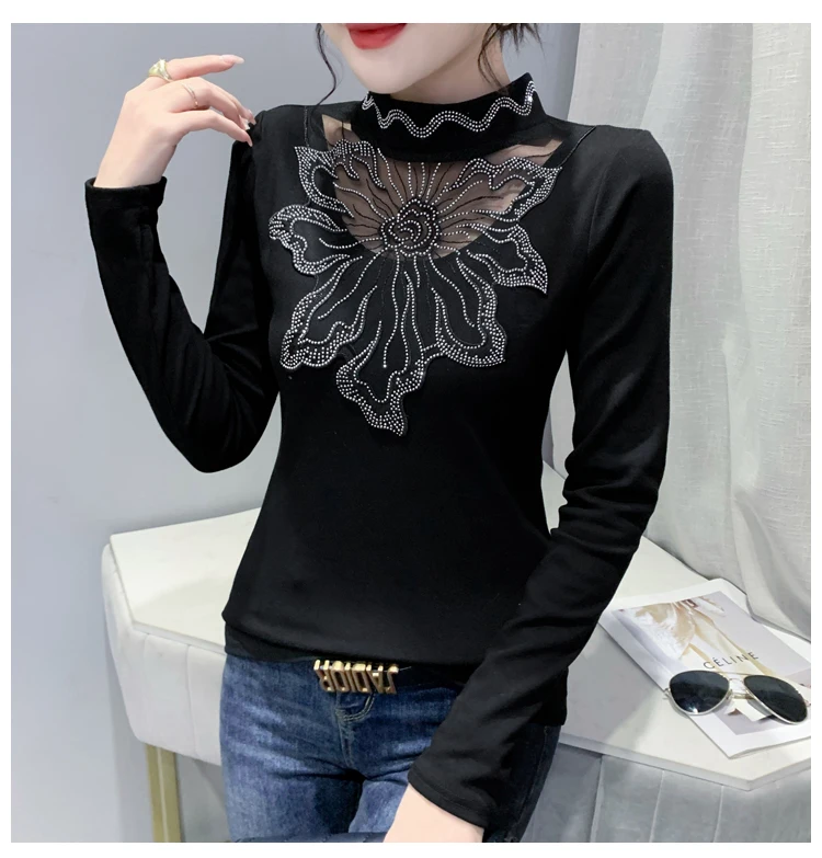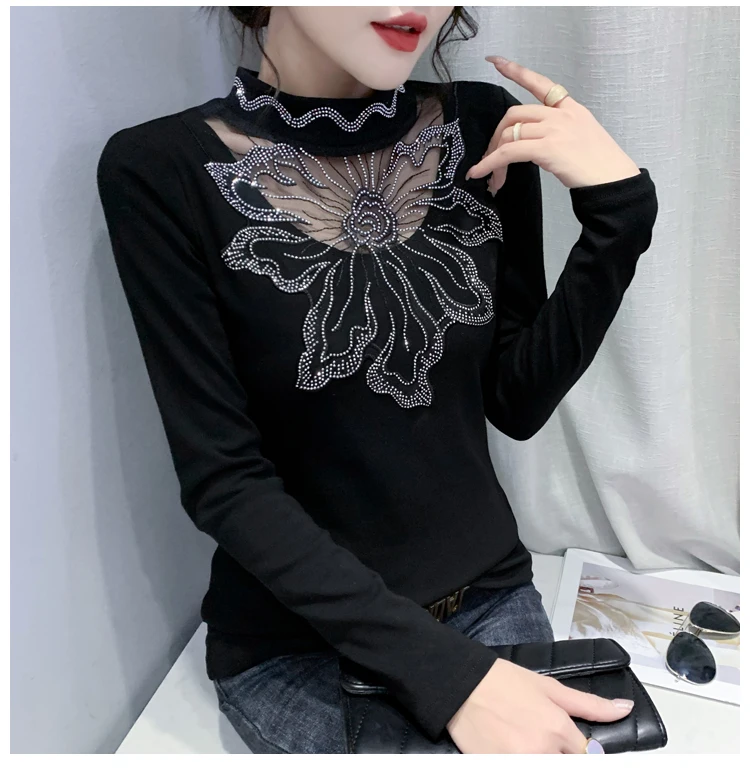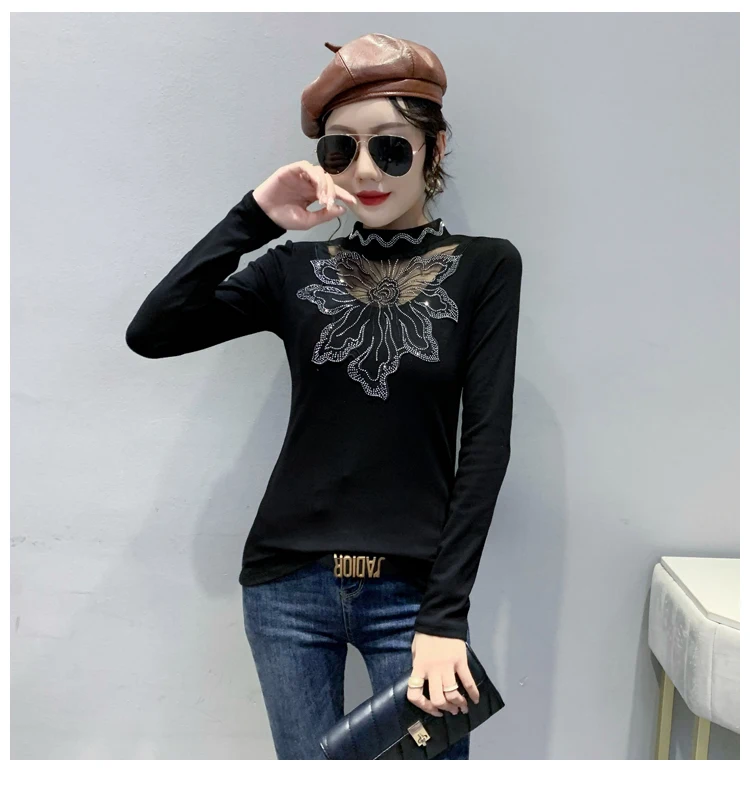 New 2021 Autumn Winter Velvet Warm Women T-Shirt Fashion Long Sleeved Bottoming Shirt Stitching Hot Drilling Black Tops
