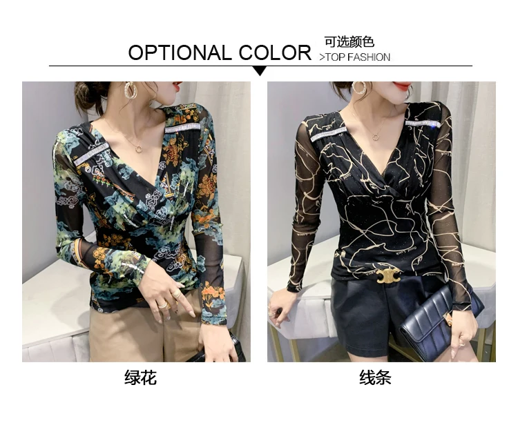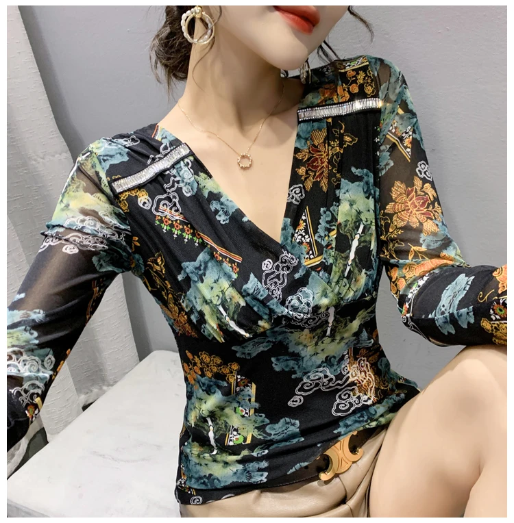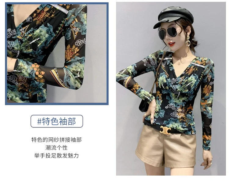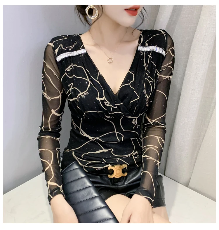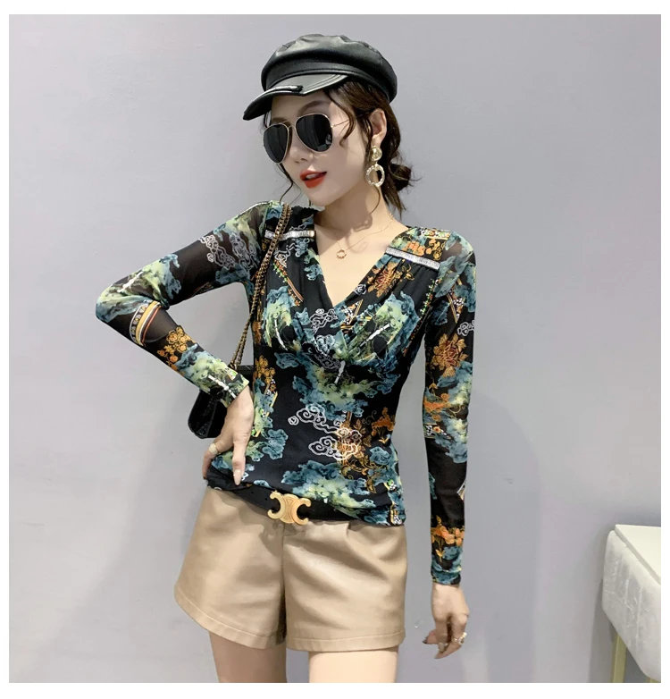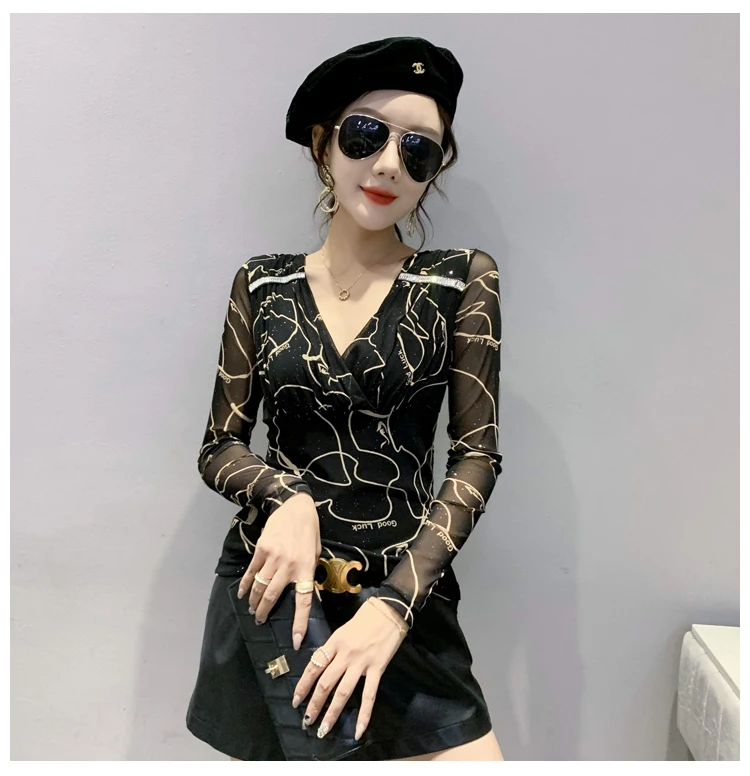 New 2021 Autumn Women Clothing Fashion Sexy V-Neck Print Mesh Tops Elegant Slim Women's T-Shirt
