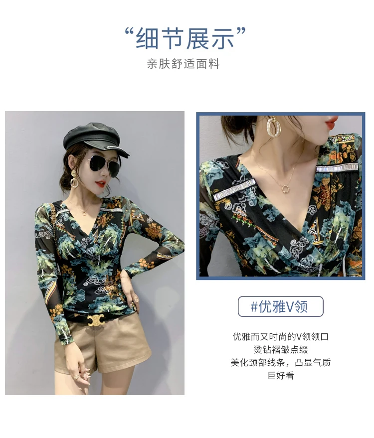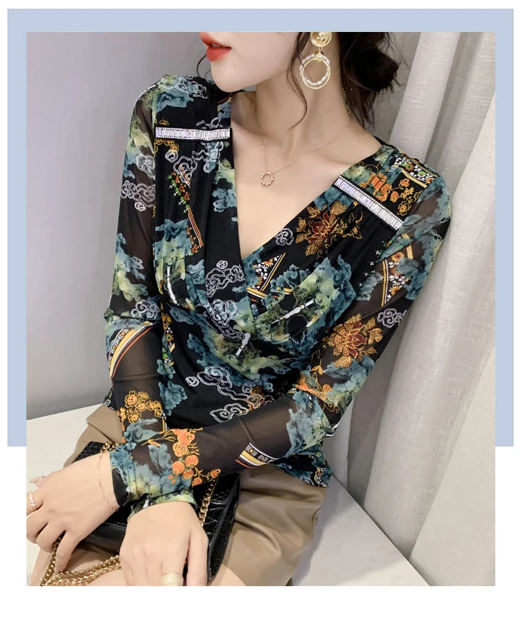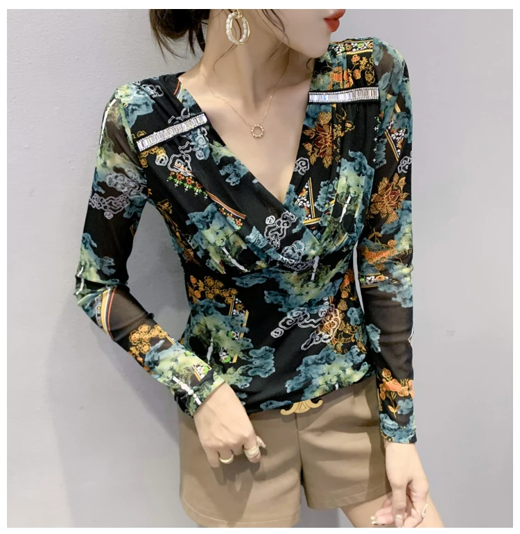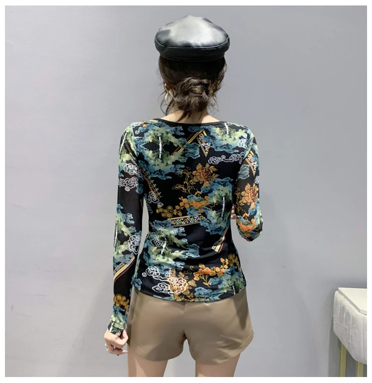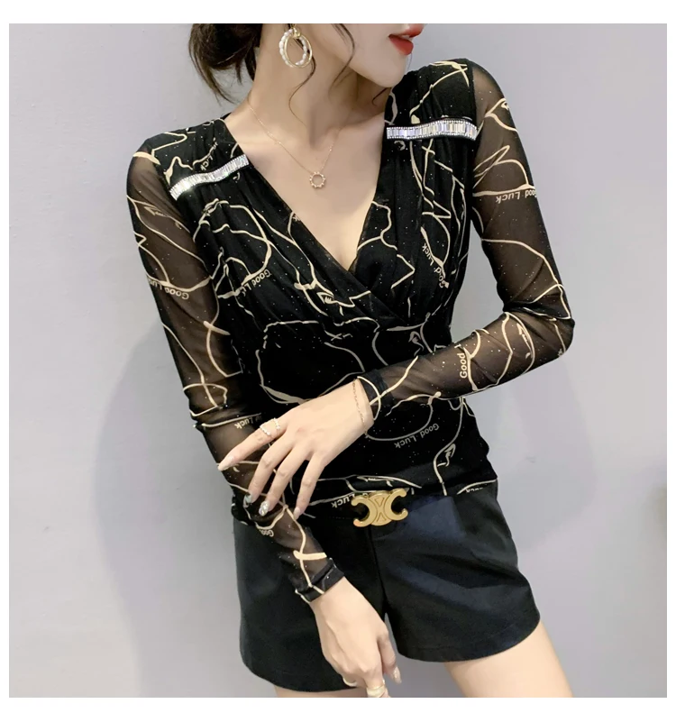 New 2021 Autumn Women Clothing Fashion Sexy V-Neck Print Mesh Tops Elegant Slim Women's T-Shirt