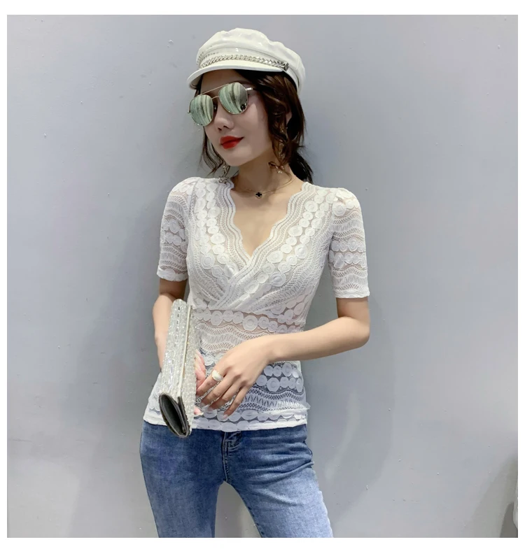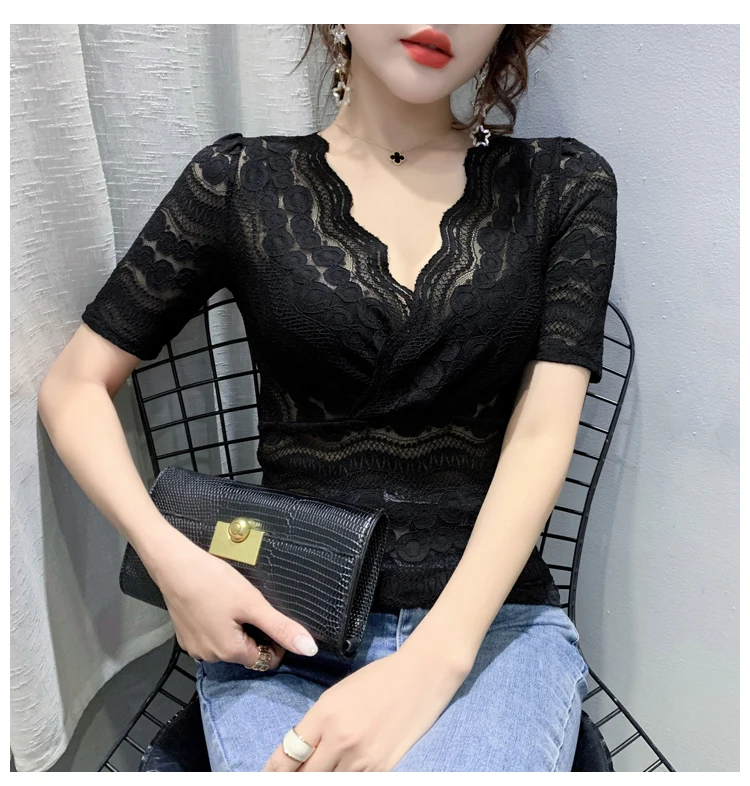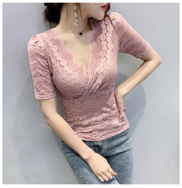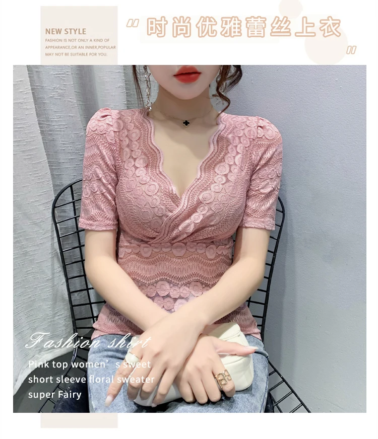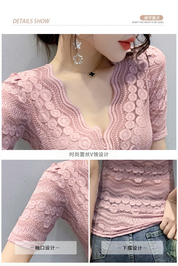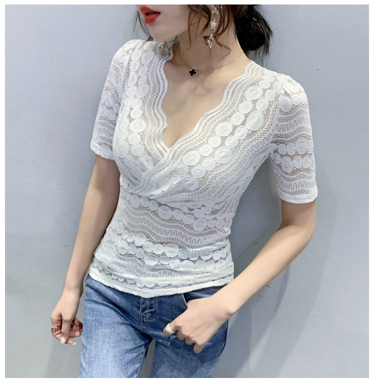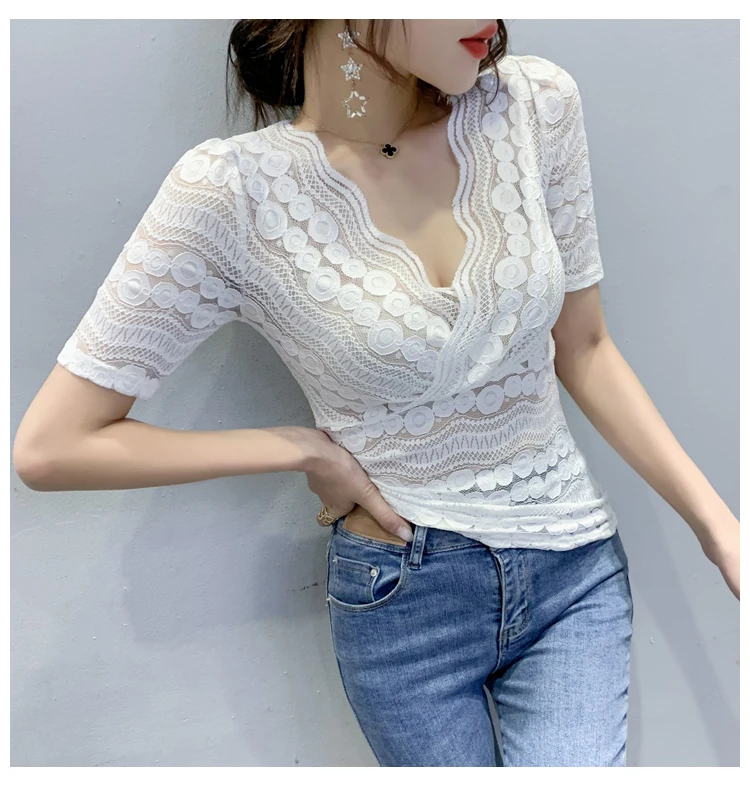 New 2021 Summer Women Lace Tops Fashion Casual Short-Sleeve V-Neck Women's tshirt Elegant Slim Hollow Out Female Blusas