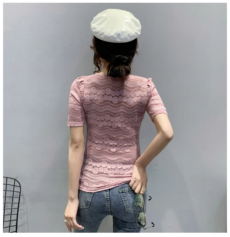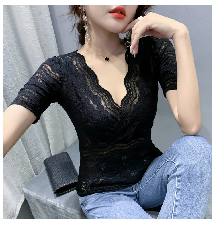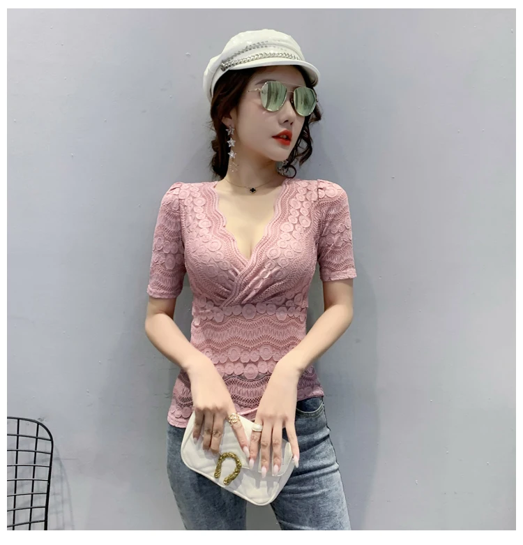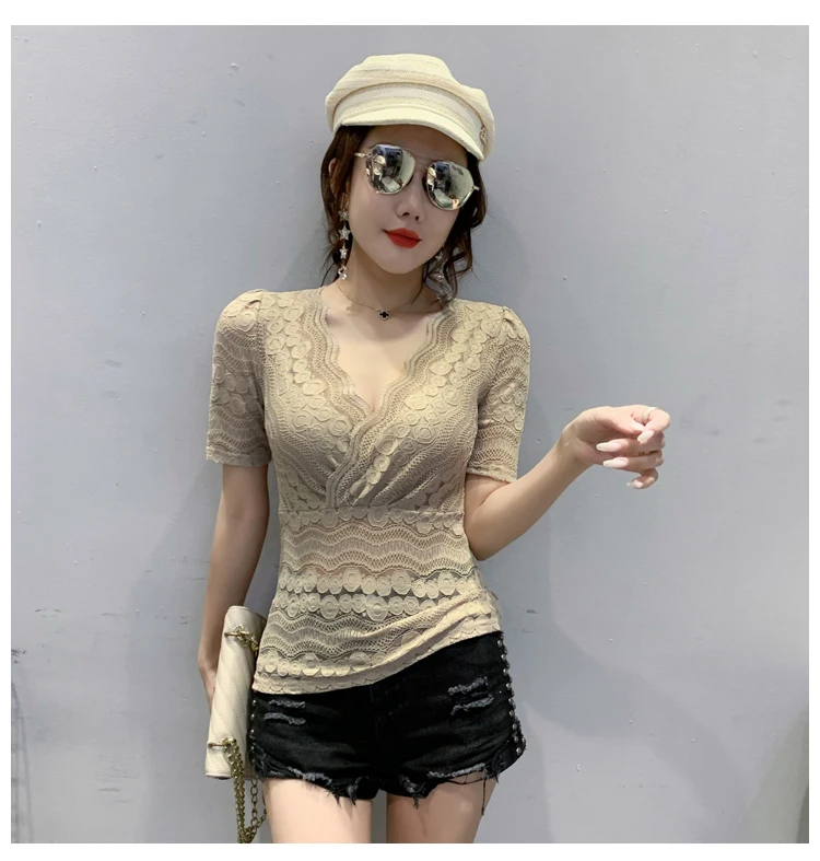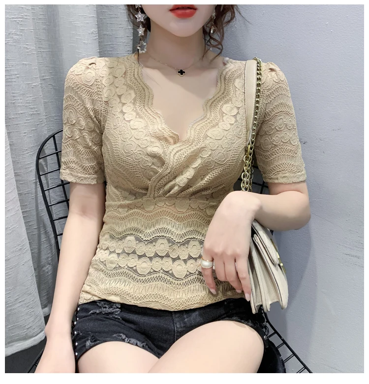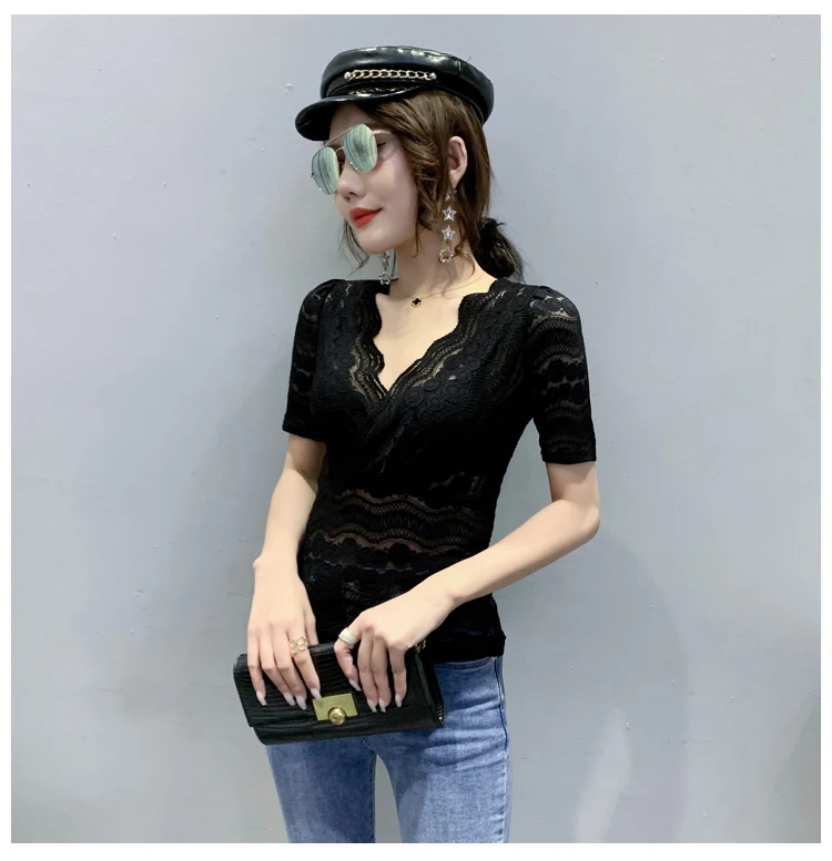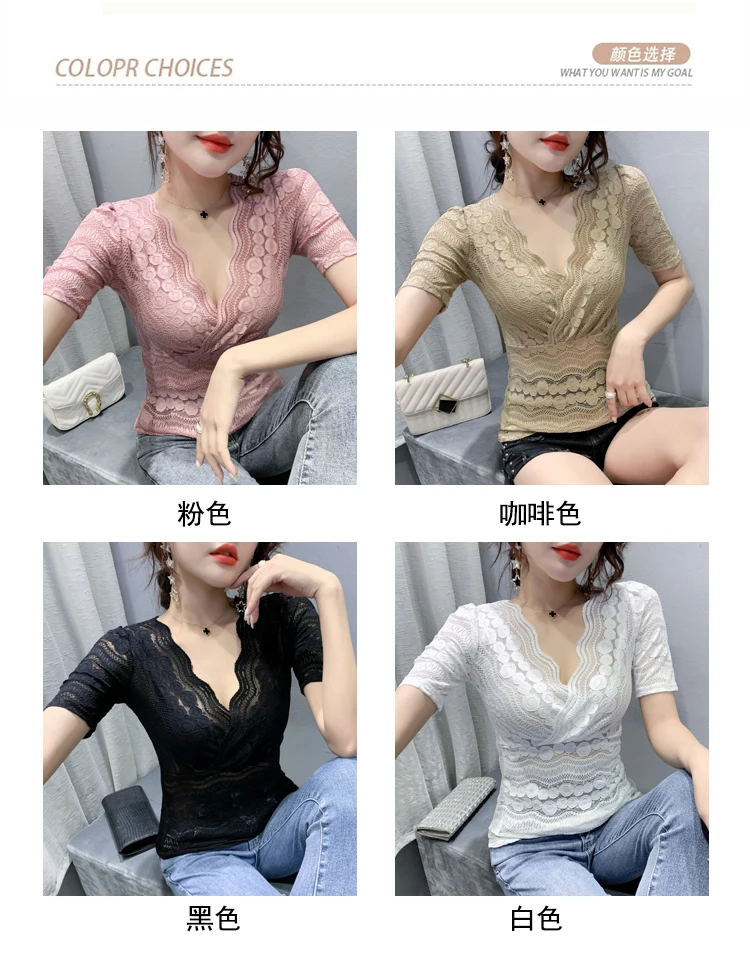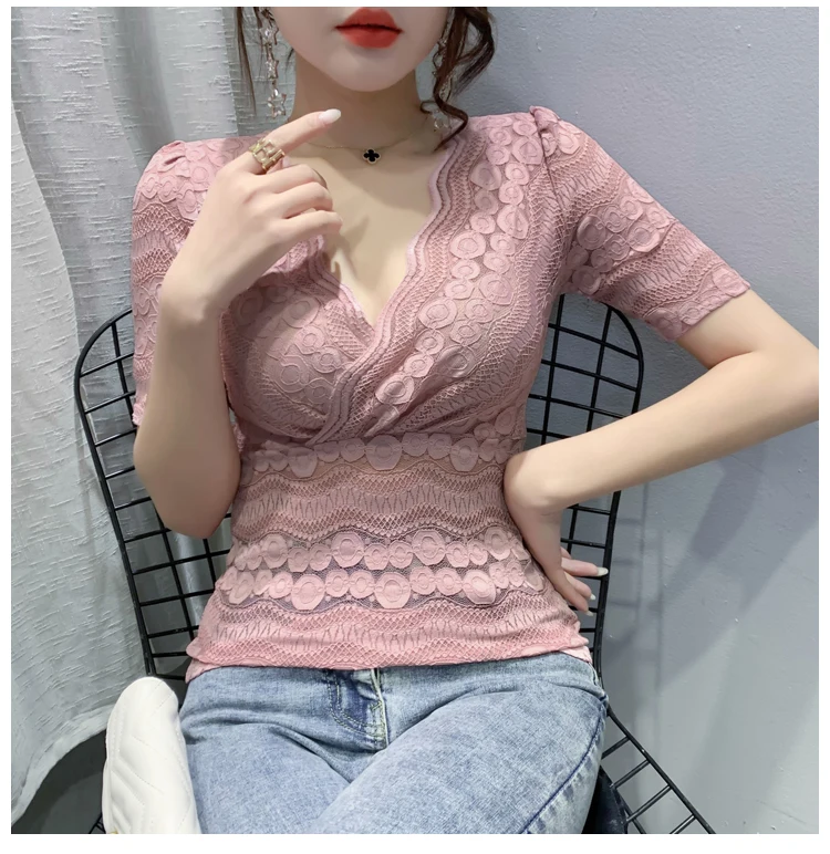 New 2021 Summer Women Lace Tops Fashion Casual Short-Sleeve V-Neck Women's tshirt Elegant Slim Hollow Out Female Blusas