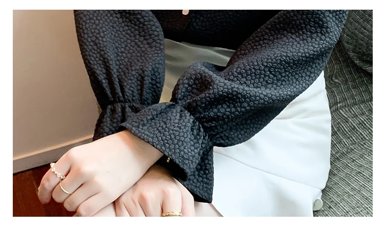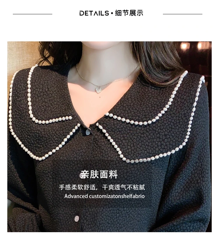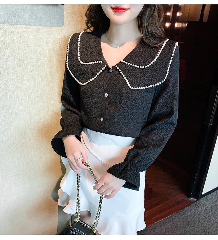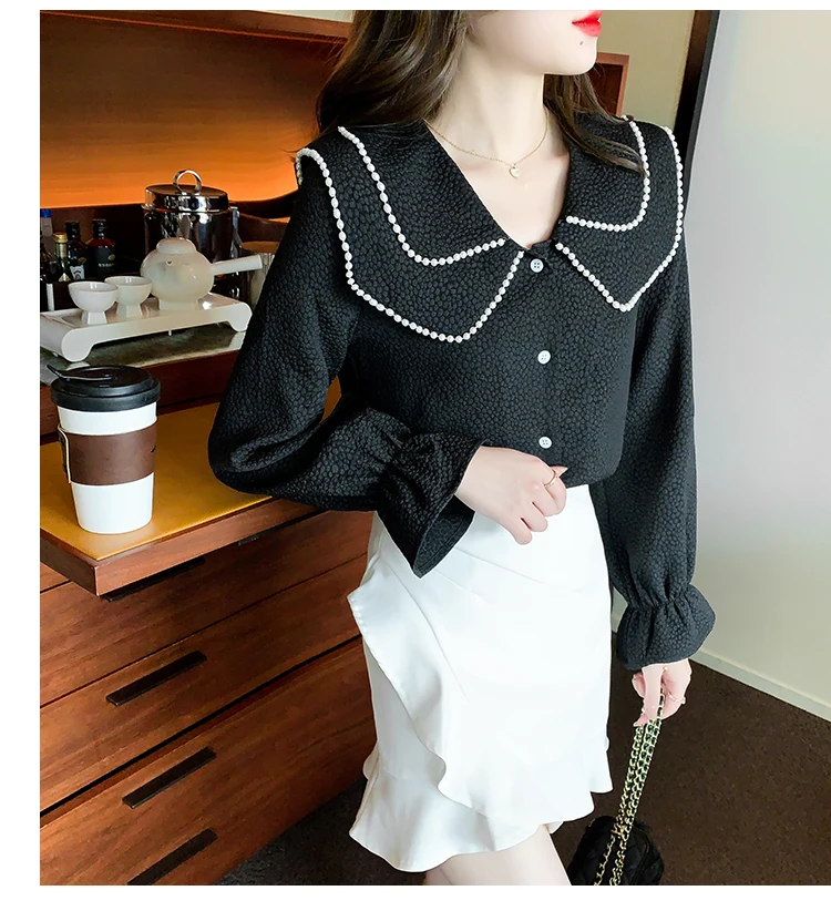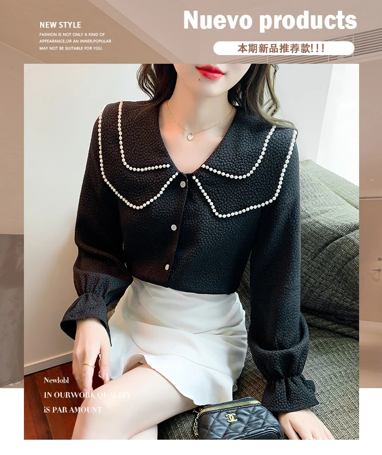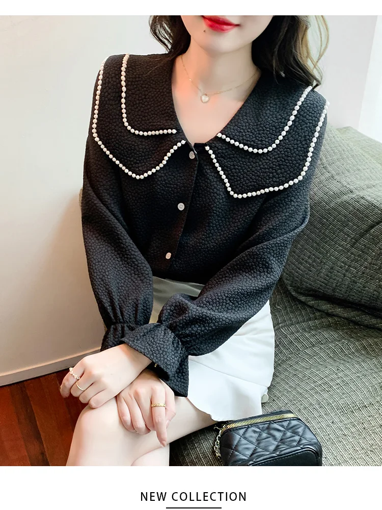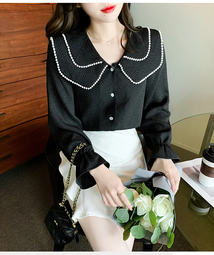 New 2022 Spring Women Blouse Fashion Casual Long Sleeved Peter Pan Collar Black Tops Elegant Slim Office Lady Shirt