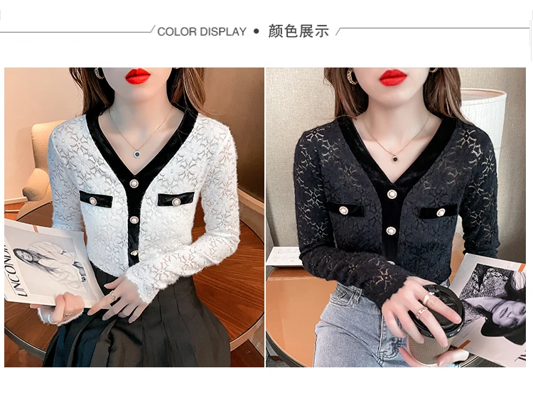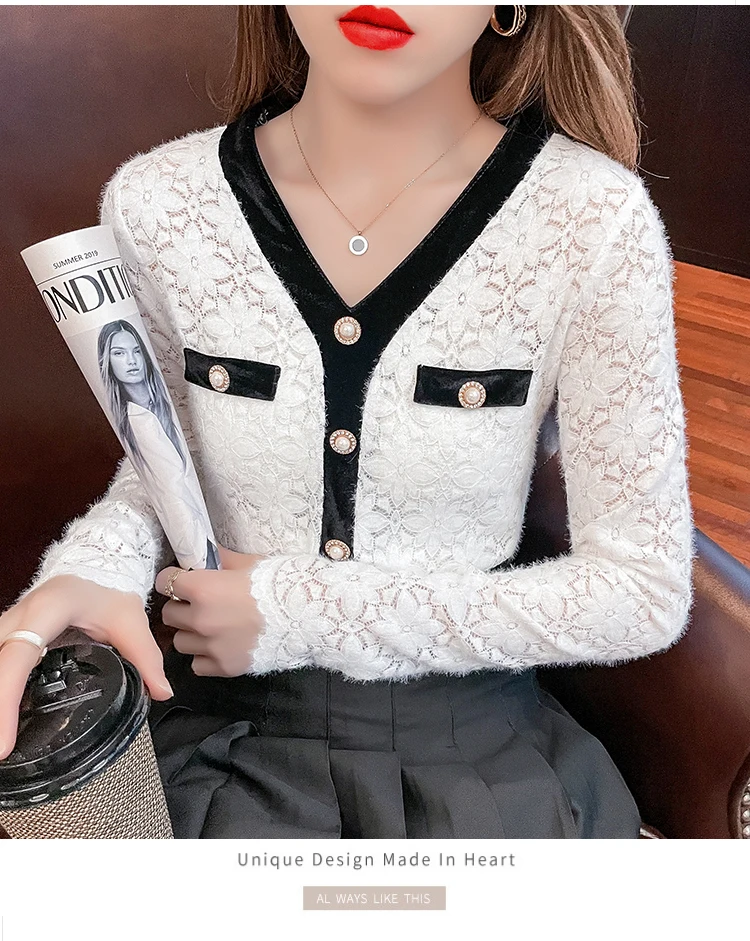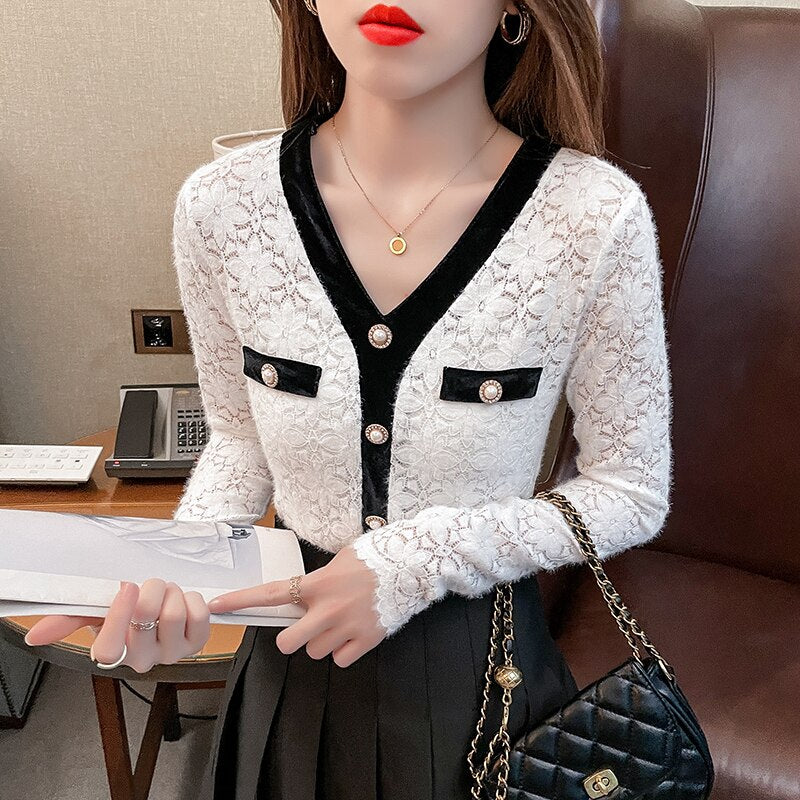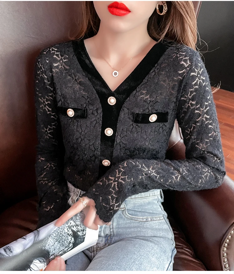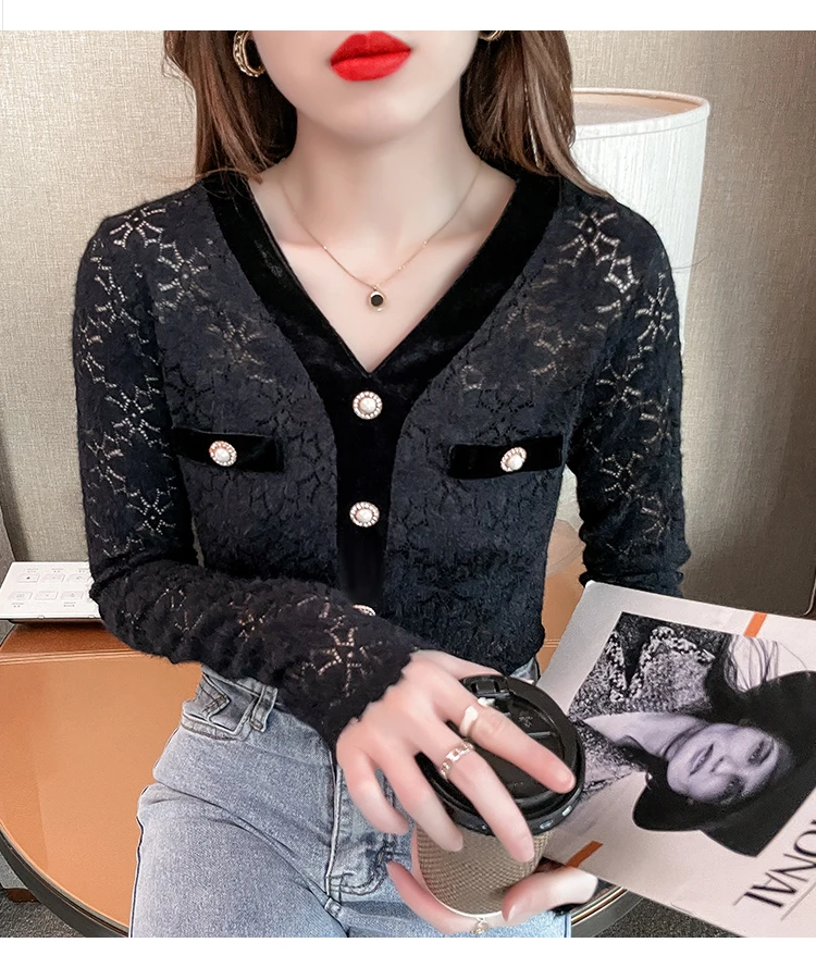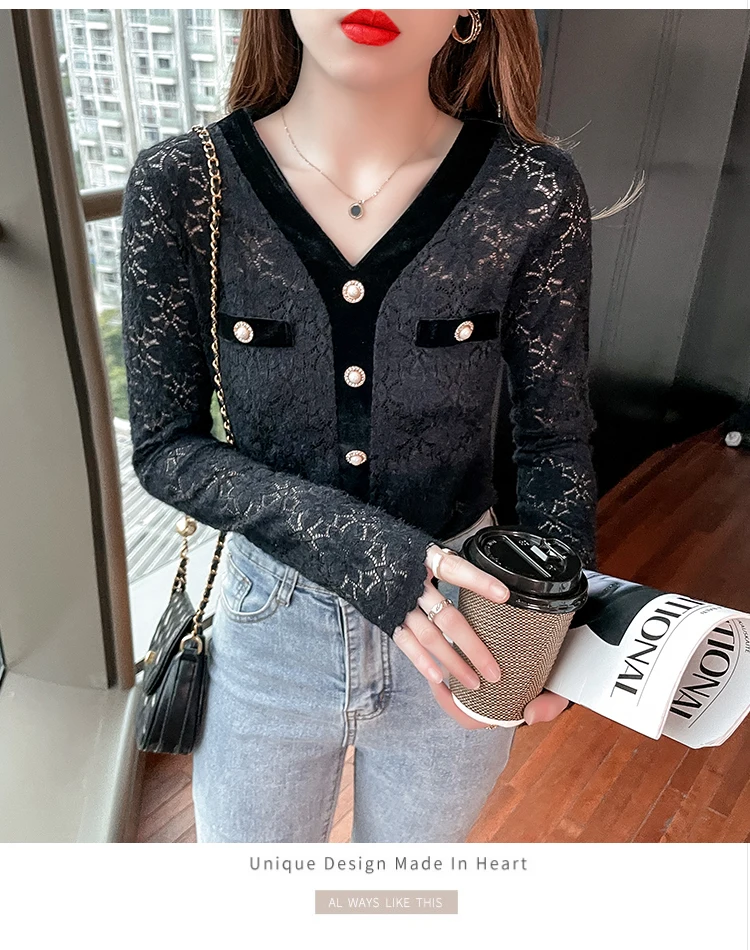 New Autumn Long Sleeve Women's T-Shirt Sexy V-Neck Hollow Out Lace Tops Elegant Slim Female Shirt
