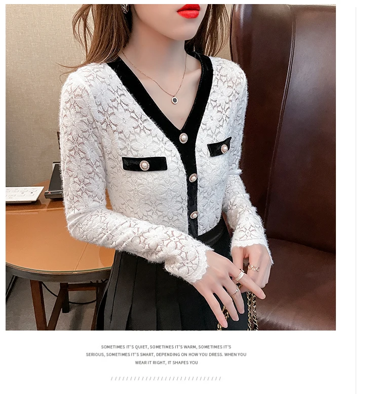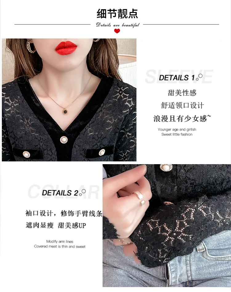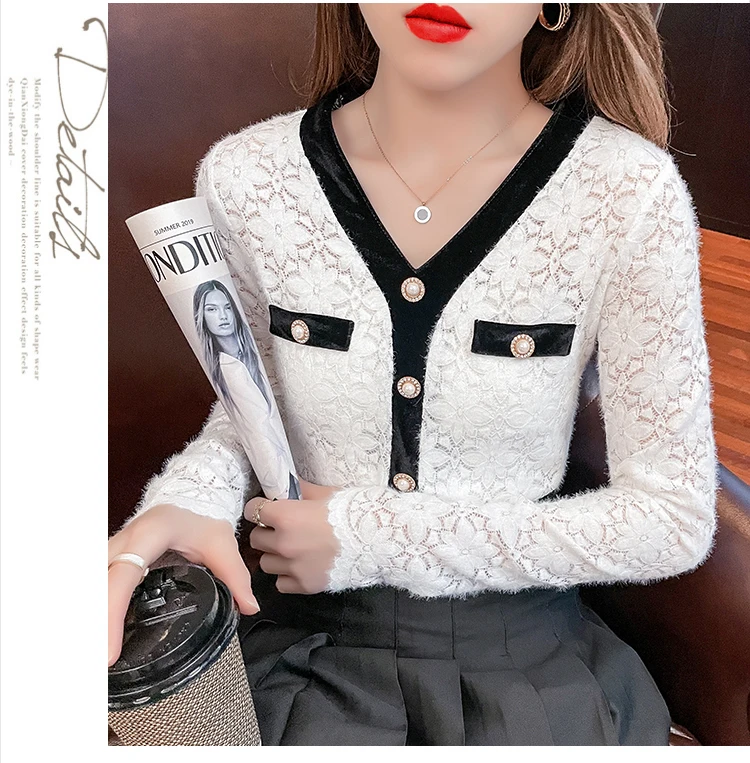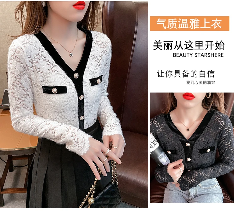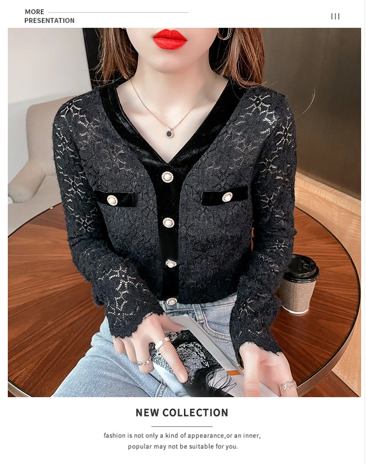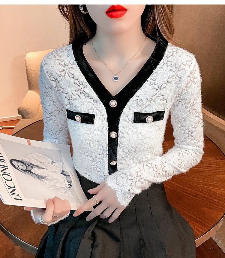 New Autumn Long Sleeve Women's T-Shirt Sexy V-Neck Hollow Out Lace Tops Elegant Slim Female Shirt