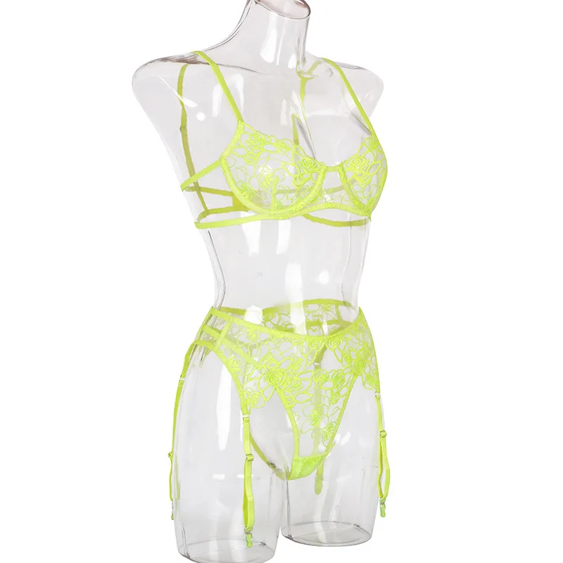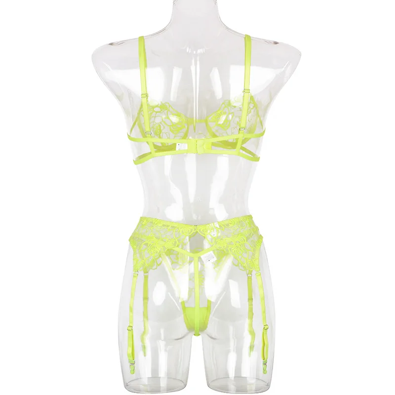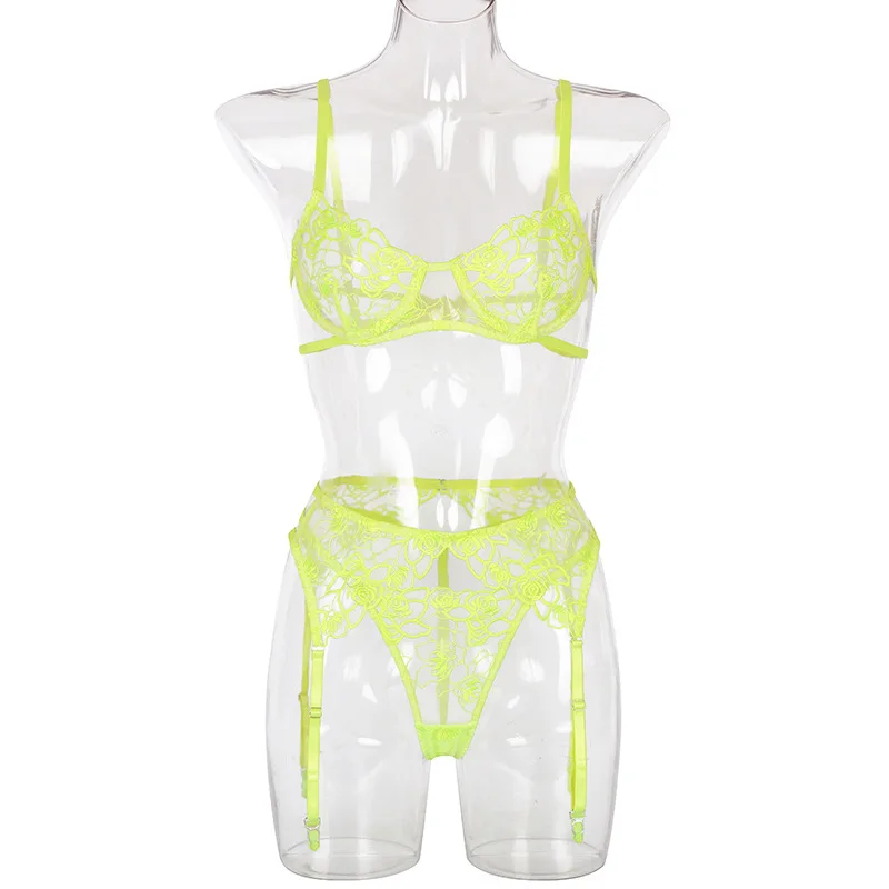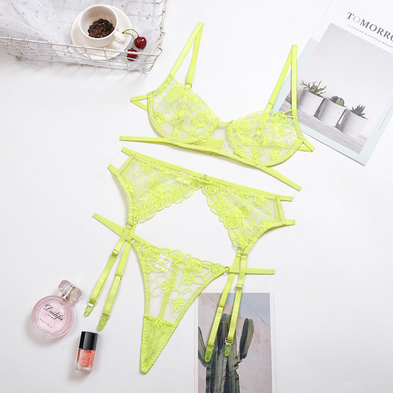 New Lace Embroidered Sexy Lingerie Set Underwire Garters Bra Panties Transparent Erotic Thong Suit Erotic Costumes 3PCS Set