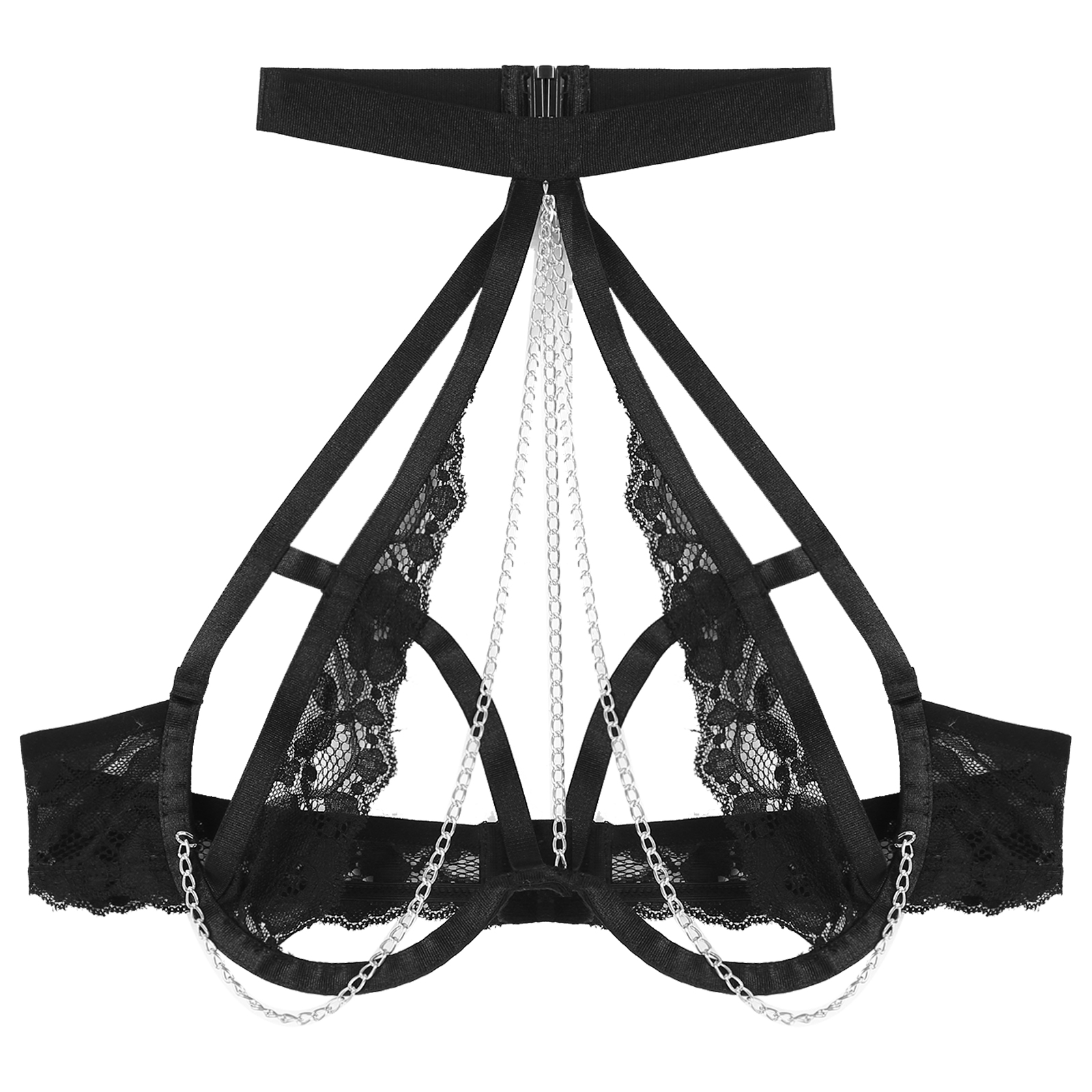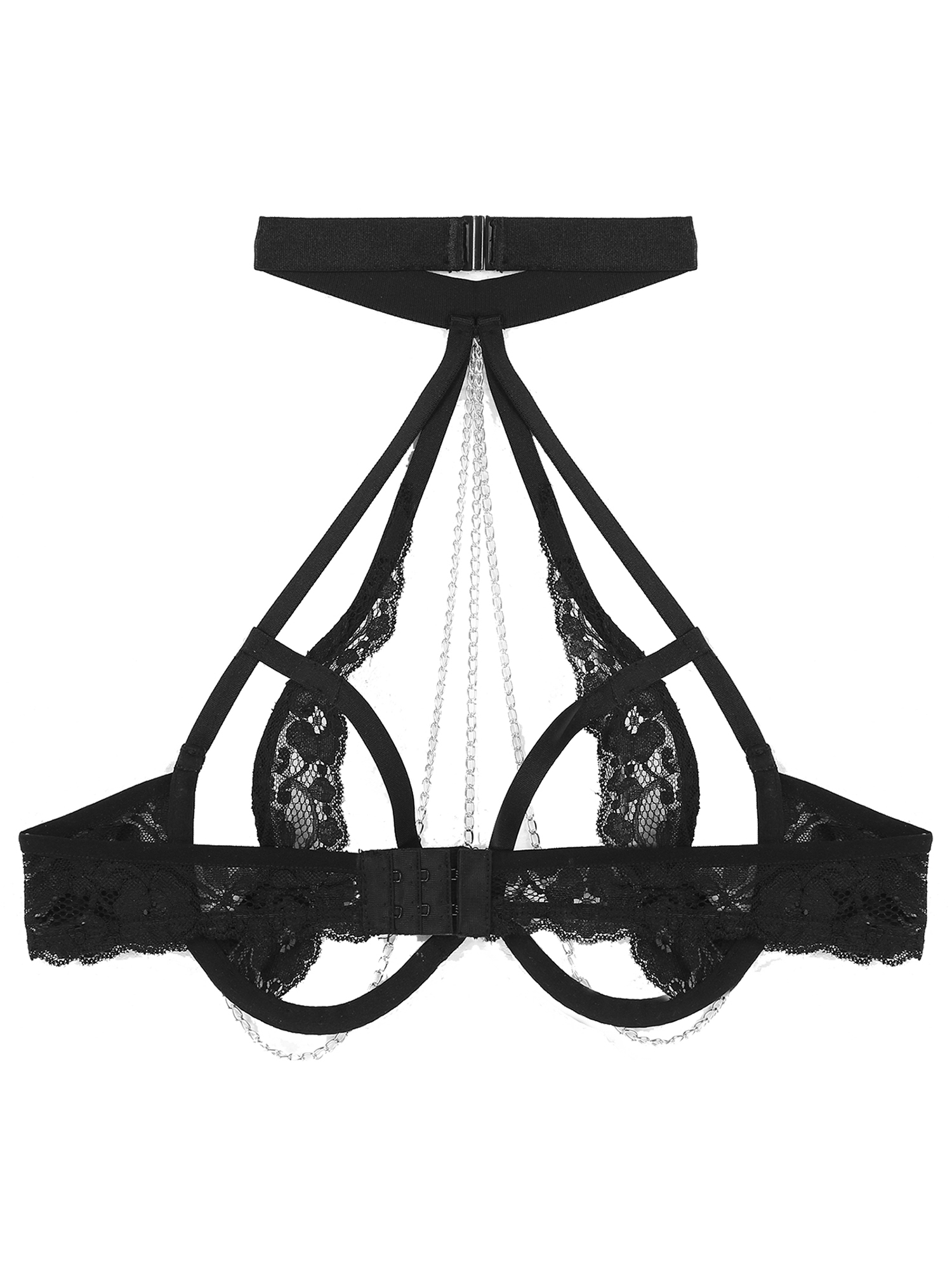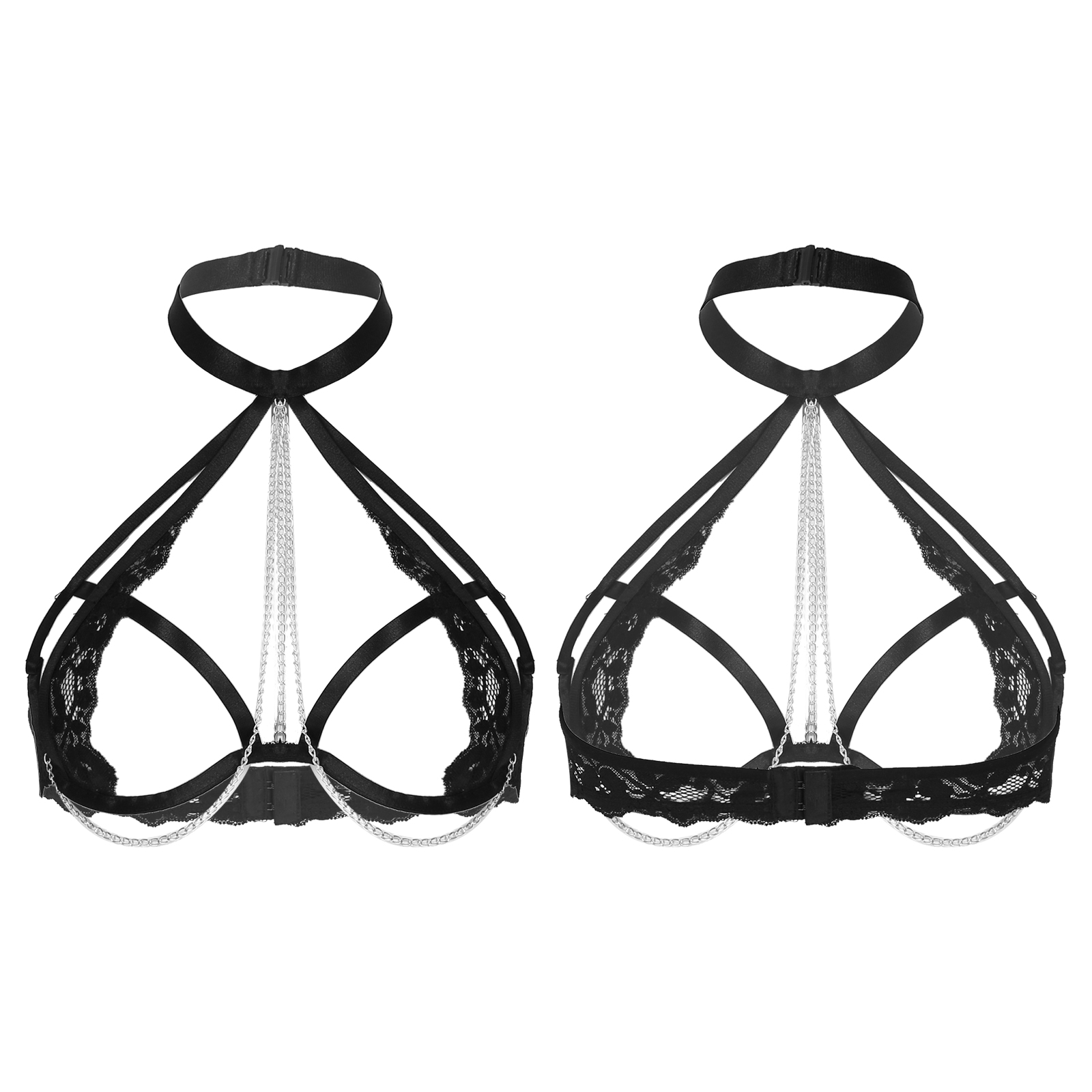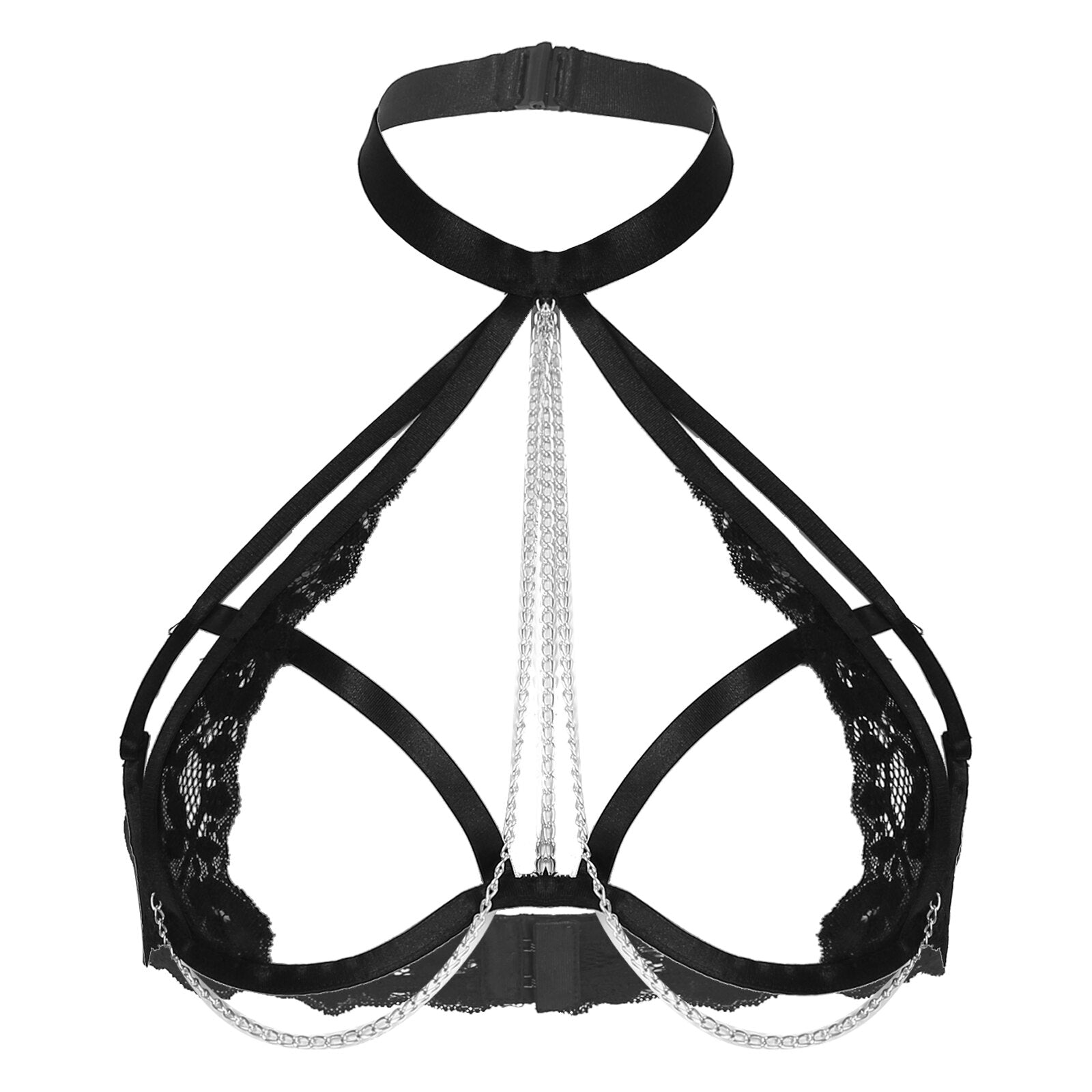 S-4XL Women Open Breast Extoic Bra Hollow Out Lace Halter Tops Metal Chain Decor Underwired Brassiere Sexy Lingerie Clubwear