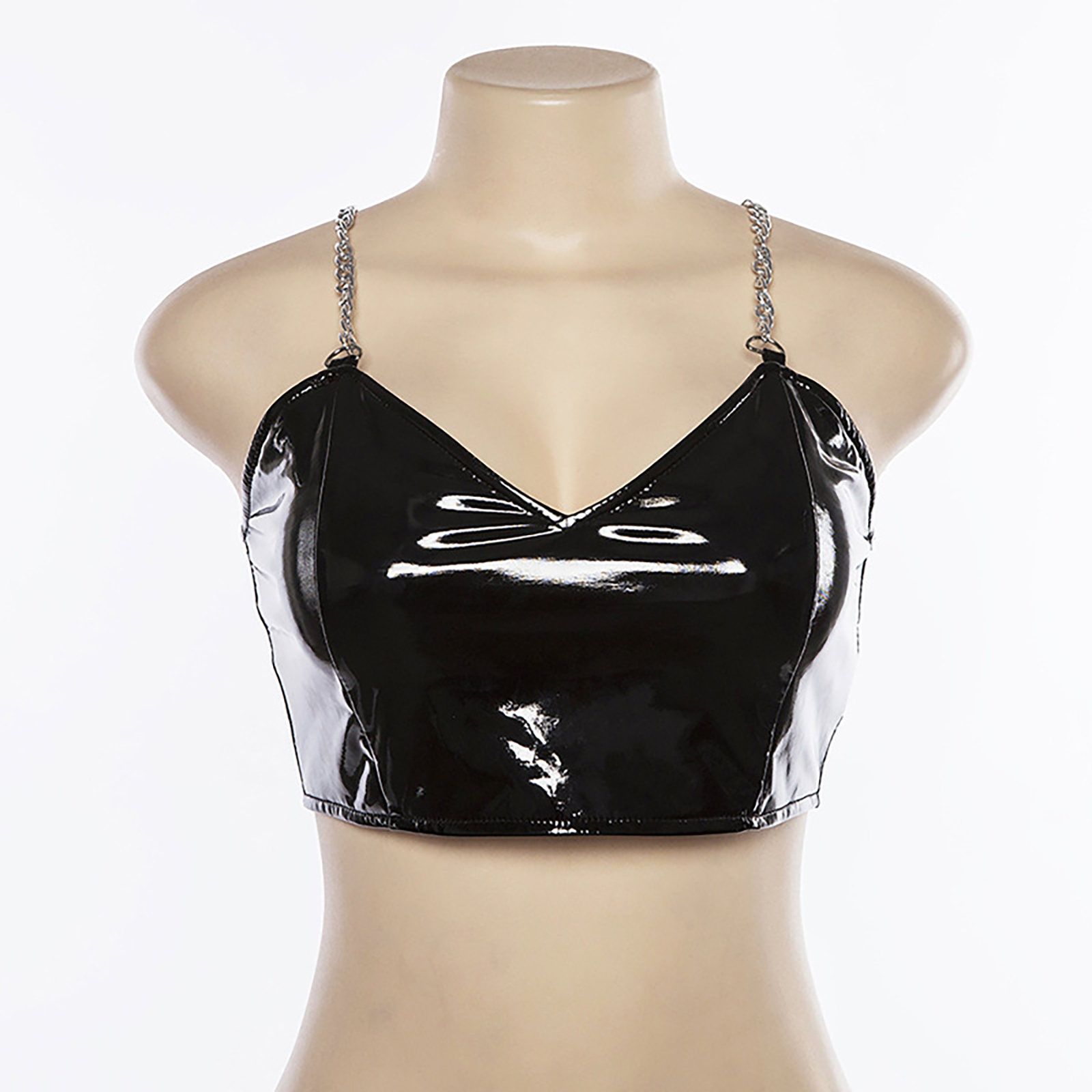 Womens Patent Leather V Neck Camisole Metal Chain Shoulder Straps Crop Top.
