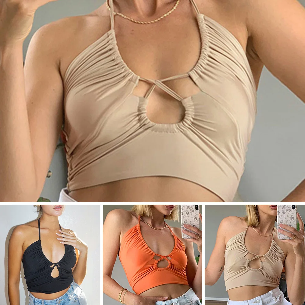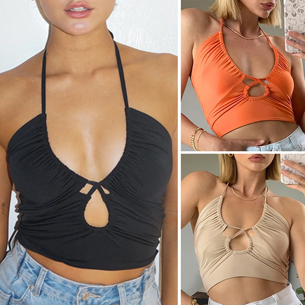 Sexy cropped top with open back, adjustable halter strap, plunge neck, and hollow out detailing. Pair it with jeans or shorts for party, nightclub, beach and holiday.