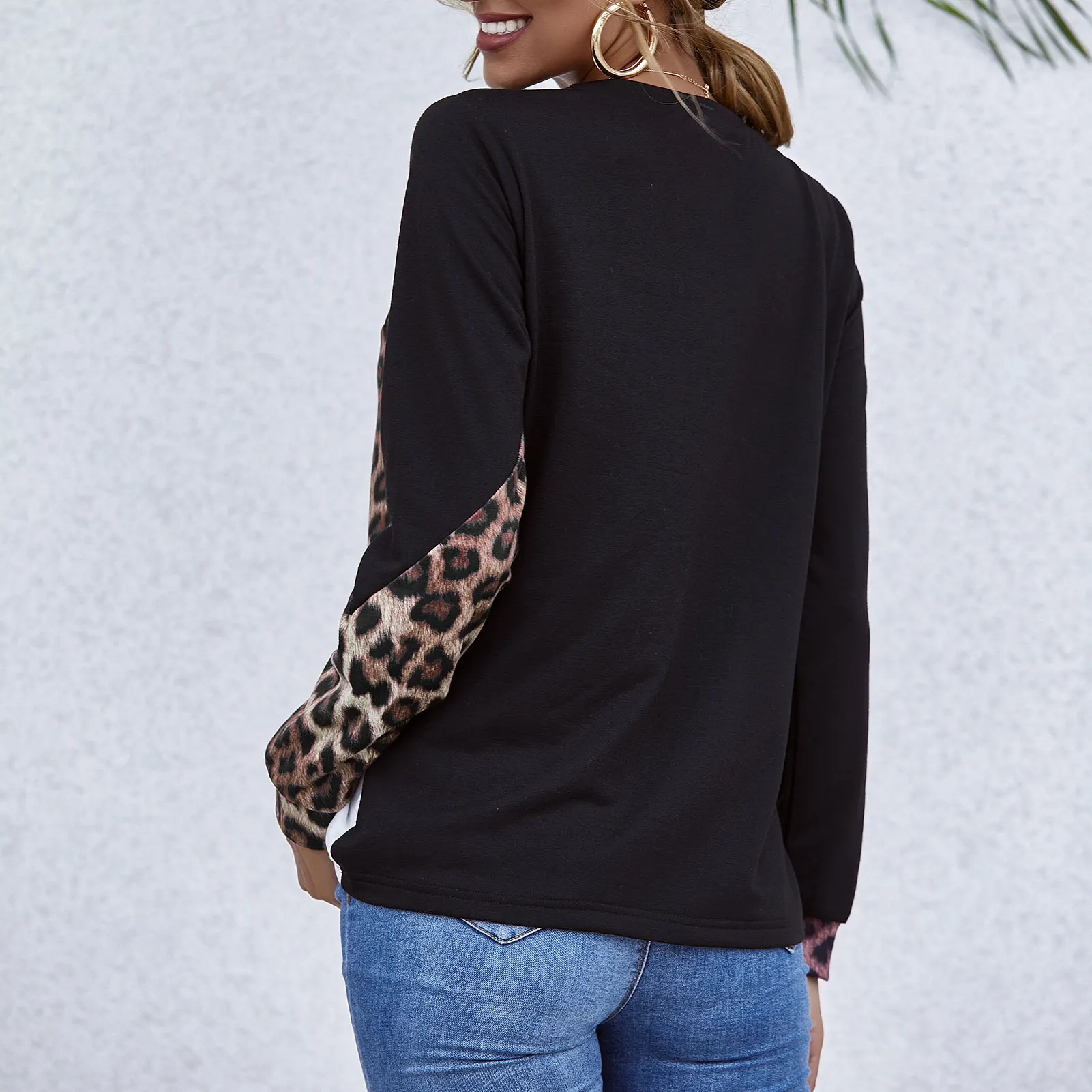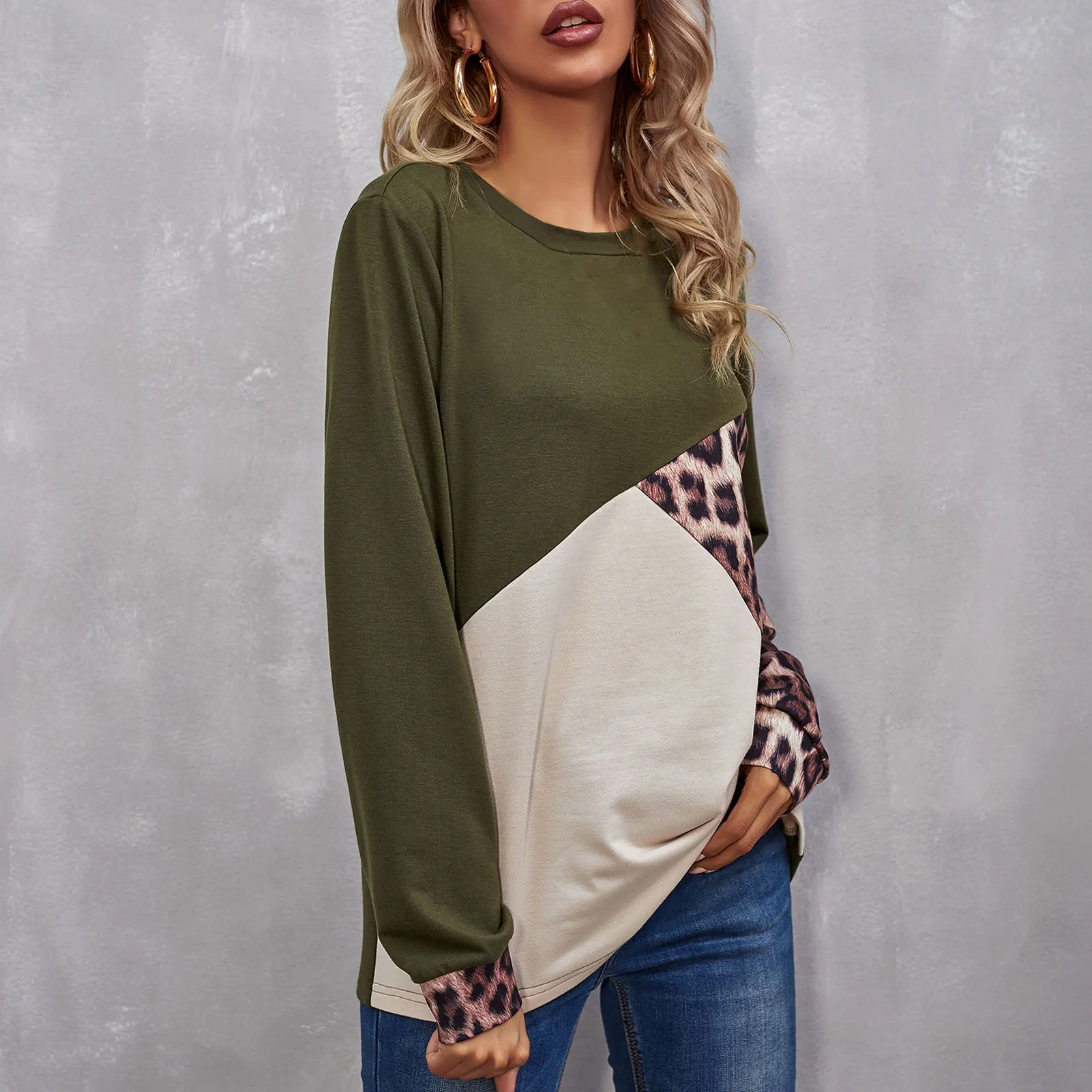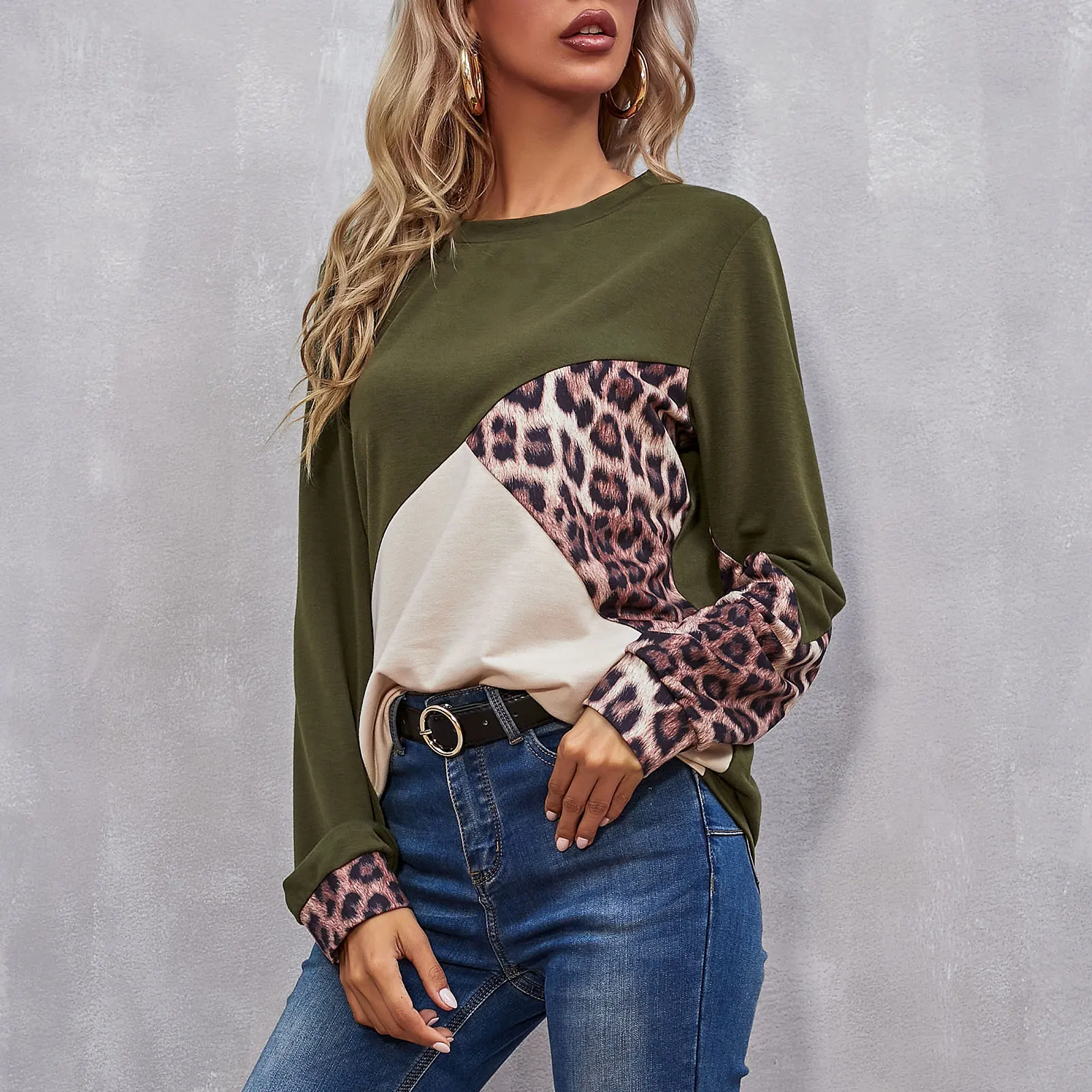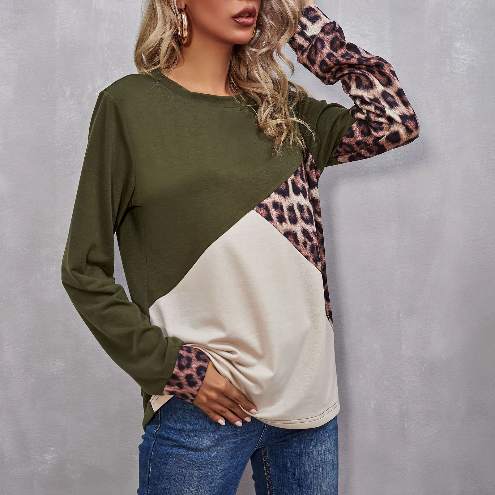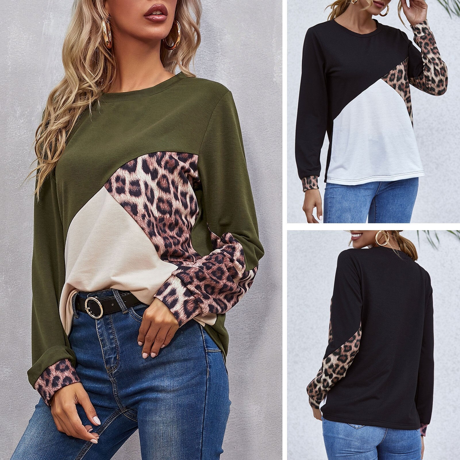 Long sleeves T-shirt with splicing finish for spring and autumn. It has round neckline, irregular leopard splicing design, bringing a chic feeling when paired with jeans or shorts. Have it for the streets or weekends.