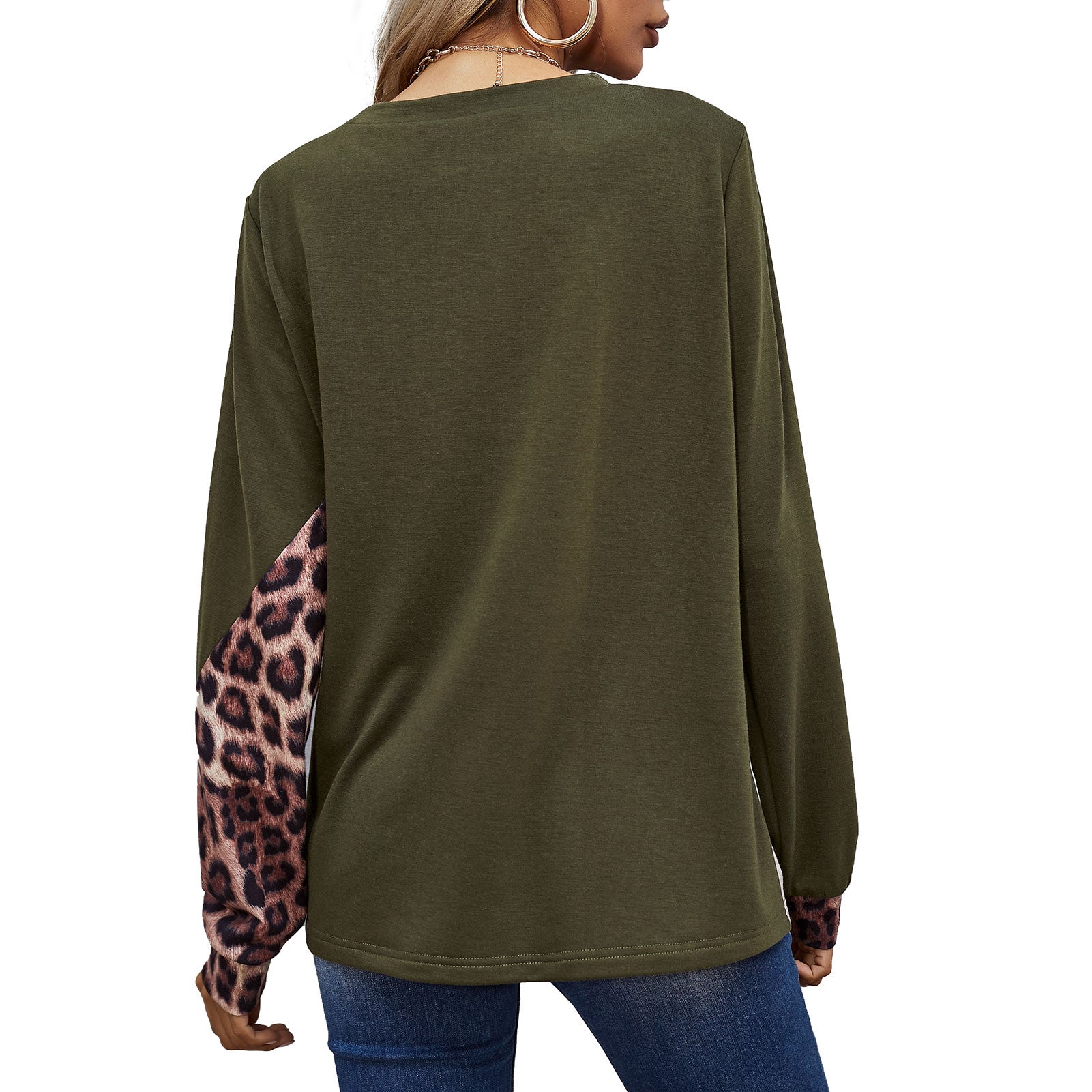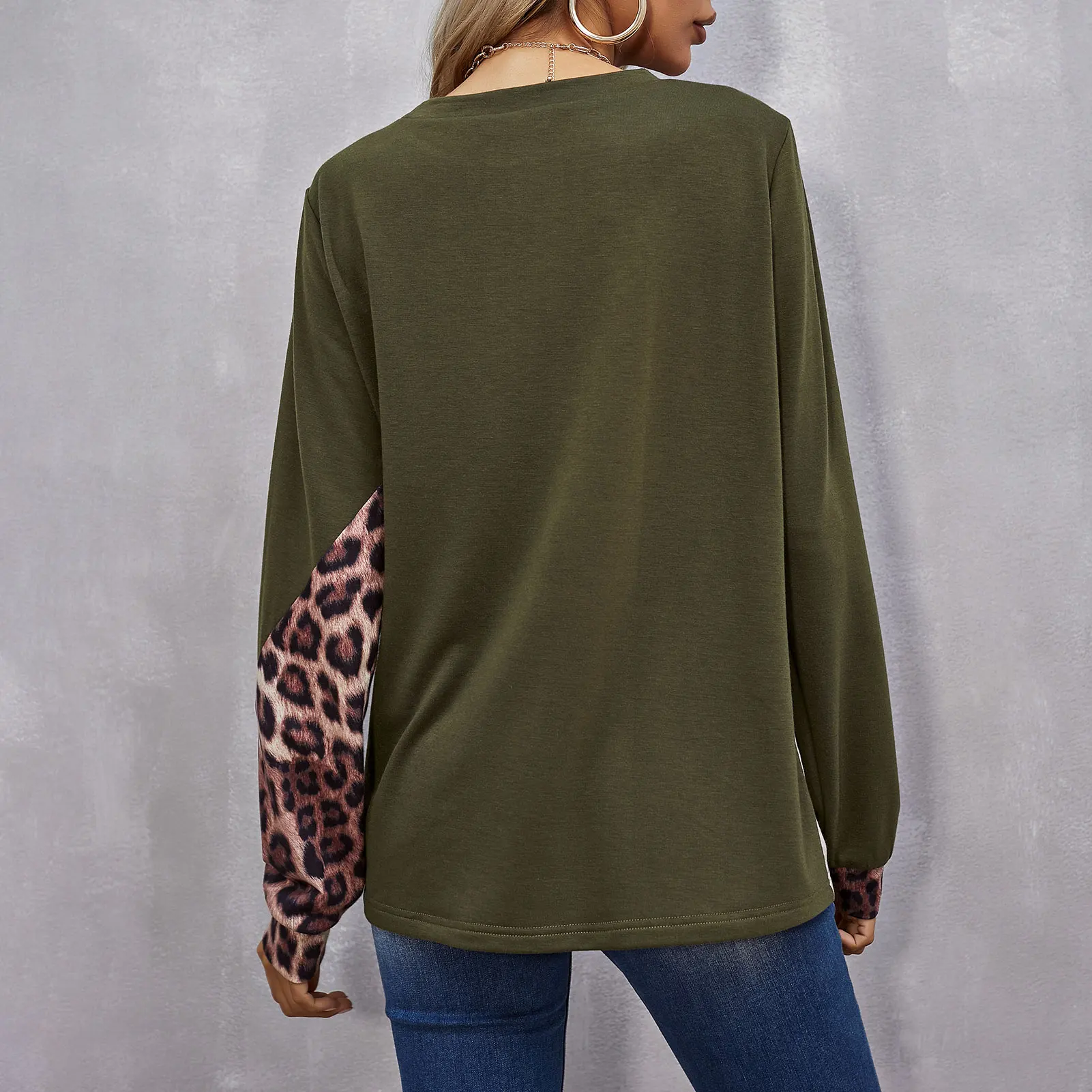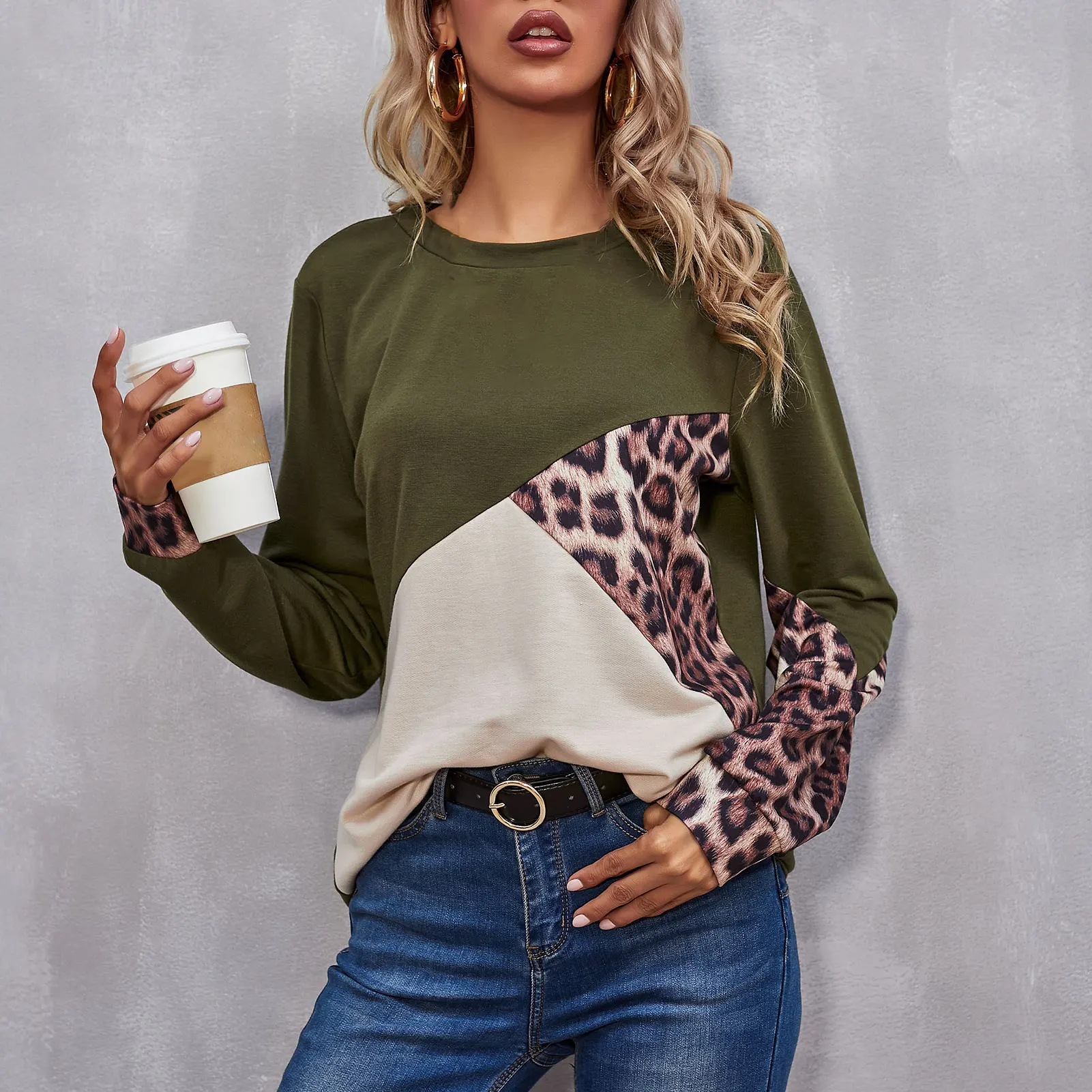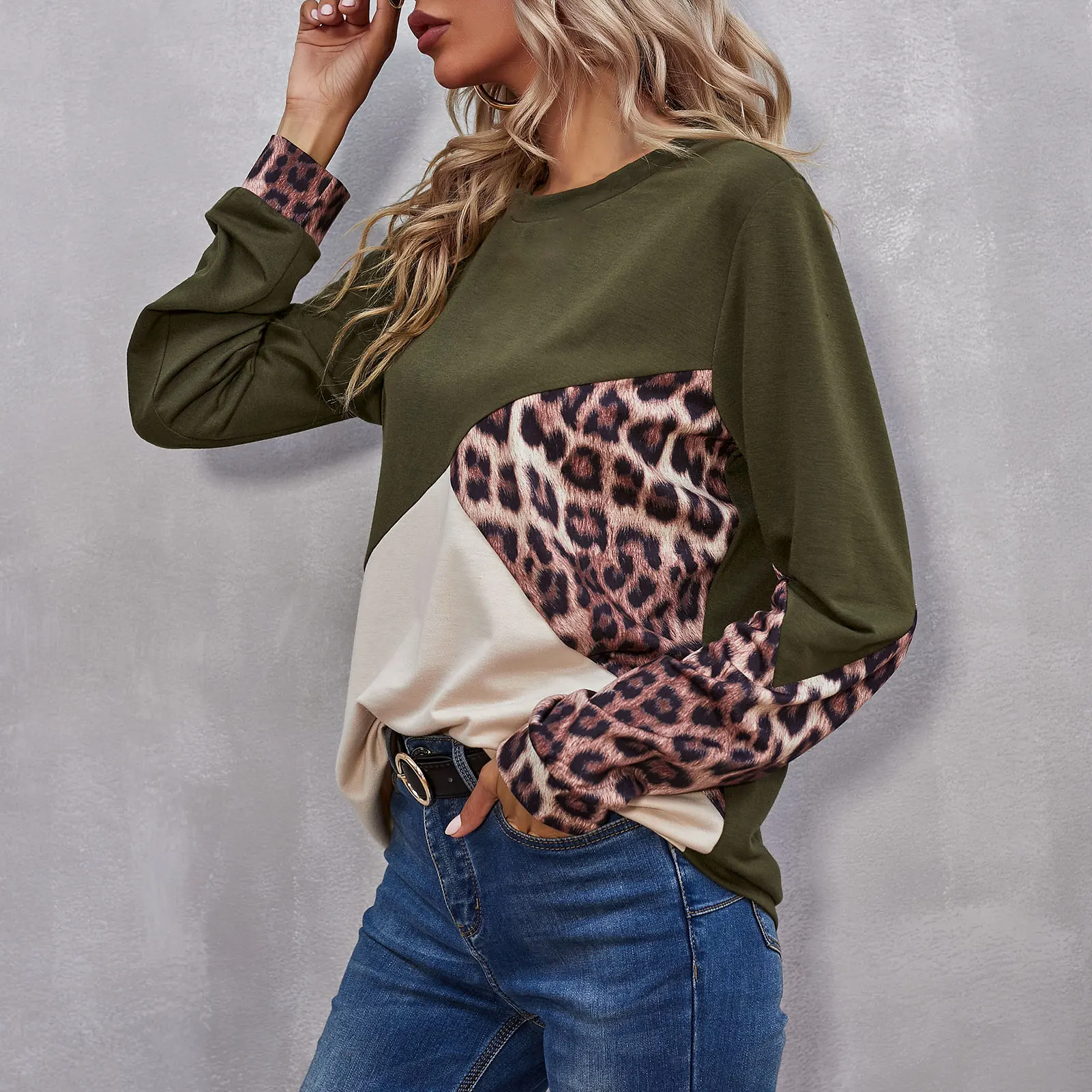 Loose silhouette with round neck, long sleeves. Irregular leopard print splicing design.