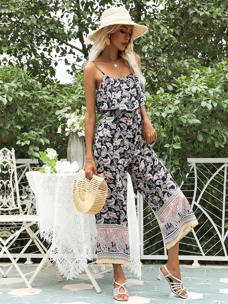 Summer Casual Women Jumpsuit Sexy Sleeveless Sling Print Halter Wrapped Chest Romper Loose Streetwear Jumpsuit