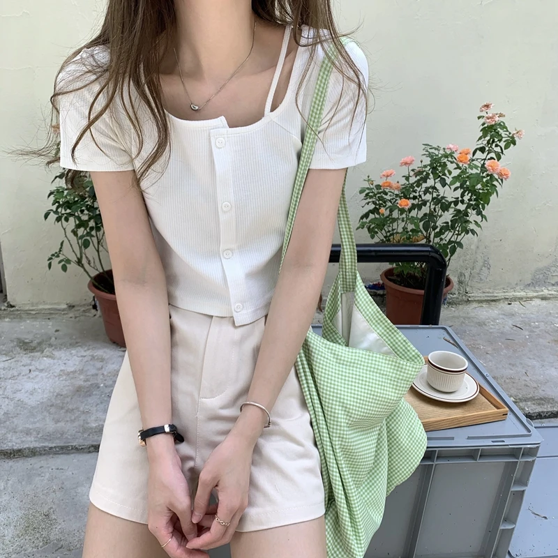 Summer Solid Kawaii Blouse Tops Women Korean Designer Fit Chic Casual Sweet Blouse Shirt O-Neck Asymmetric Outing Y2k Tops