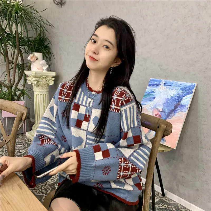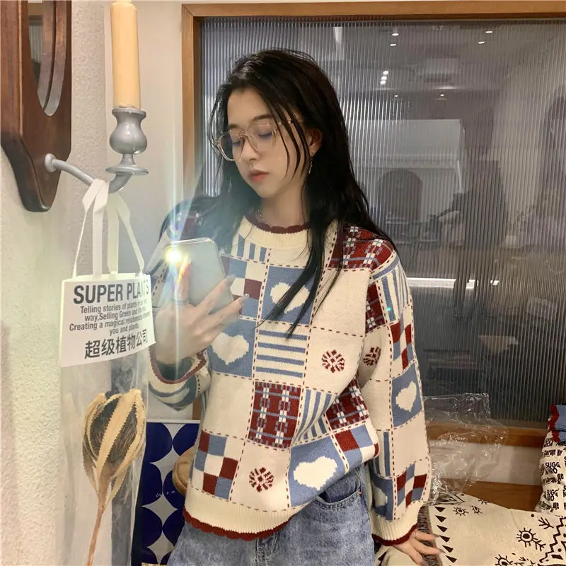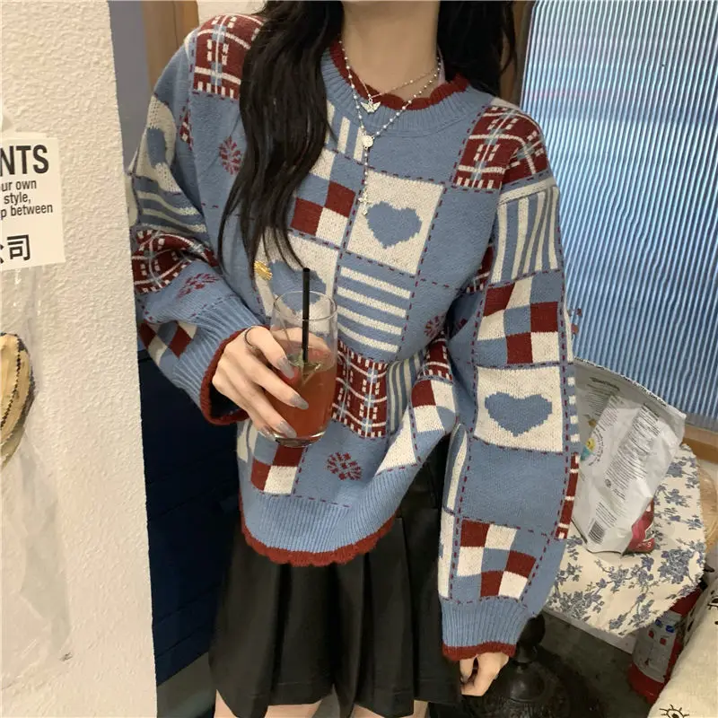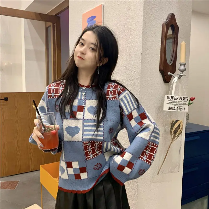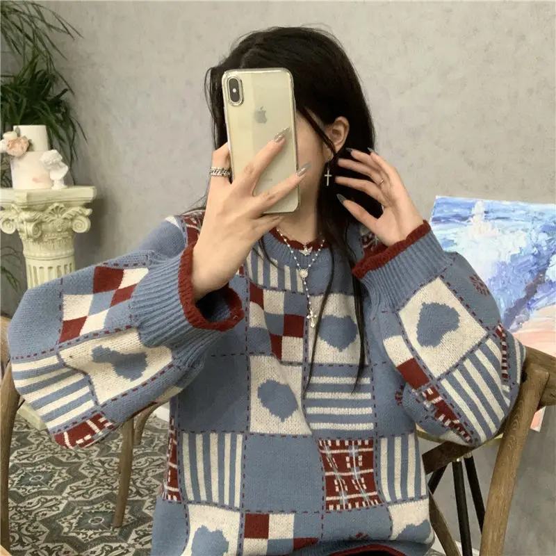 Thickened stitching love sweater women's loose fitting outer wear autumn and winter New Retro Plaid long sleeve T-shirt color co