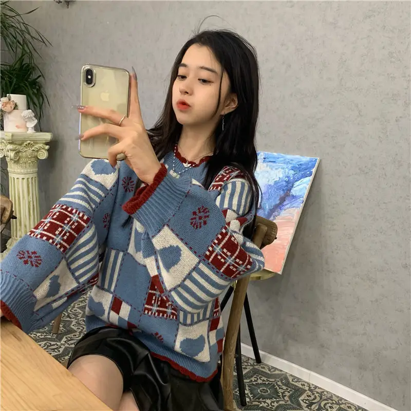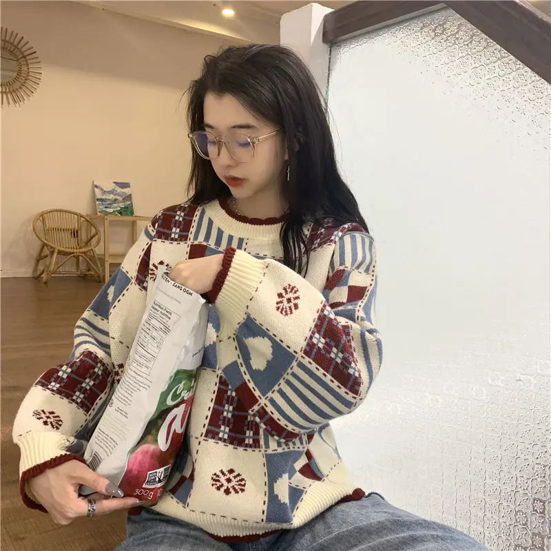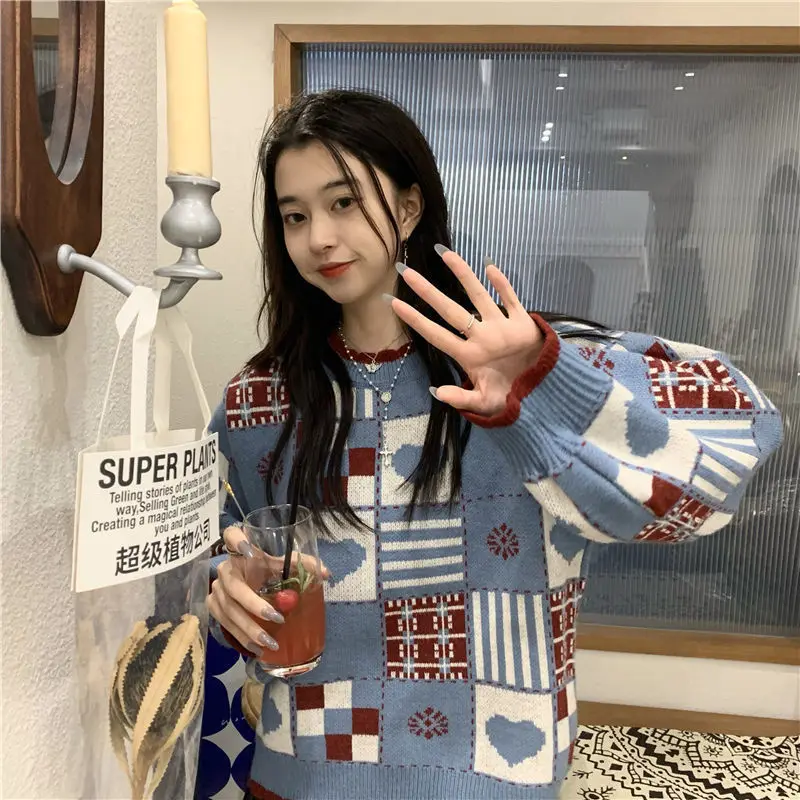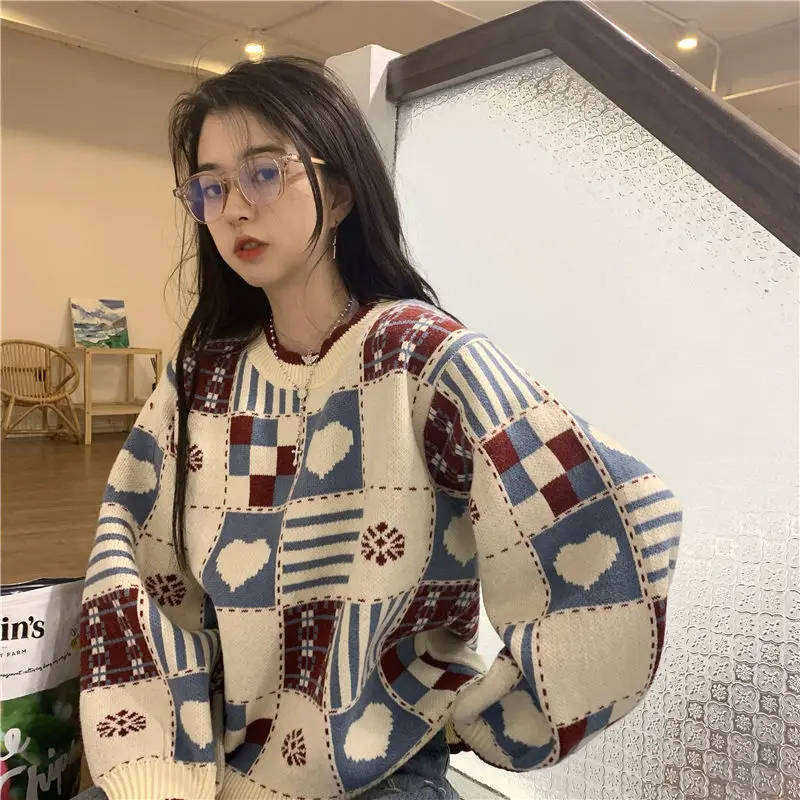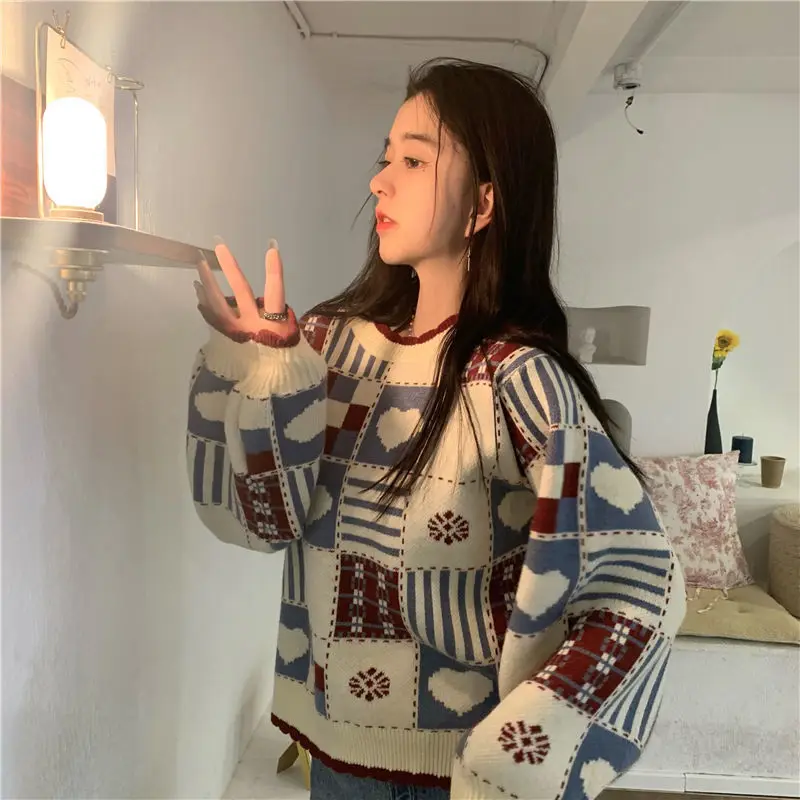 Thickened stitching love sweater women's loose fitting outer wear autumn and winter New Retro Plaid long sleeve T-shirt color co
