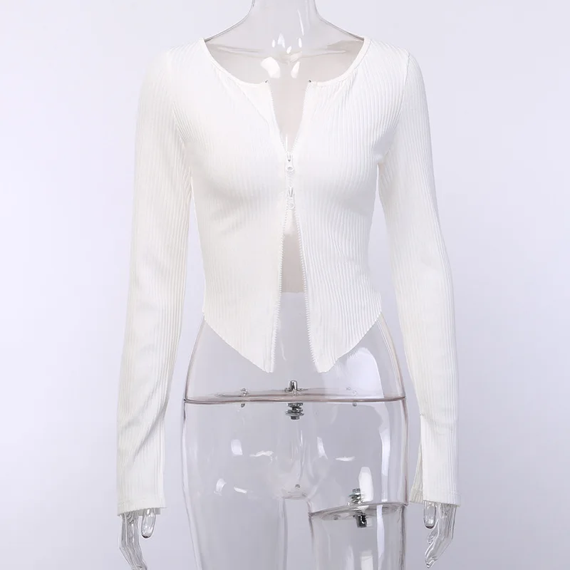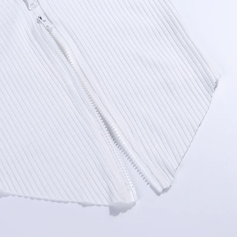 White Black Zip Up T-shirt Ribbed Knitted Long Sleeve Strech Lrregular Casual Sexy Women Spring Autumn Tops 2021 New Streetwear