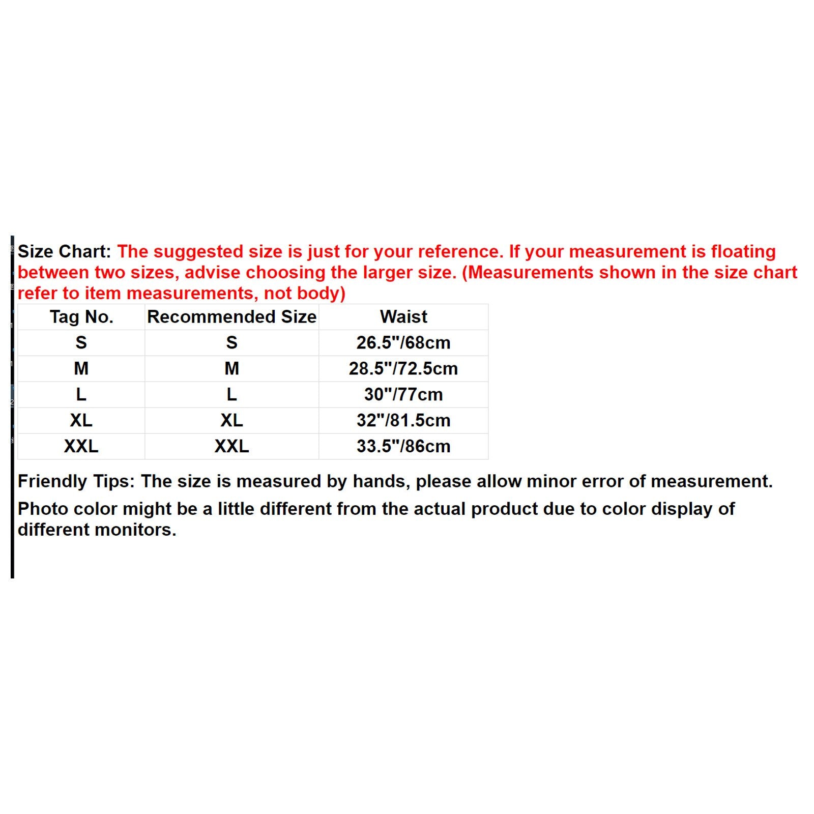 Friendly Tips: The size is measured by hands, please allow minor error of measurement.