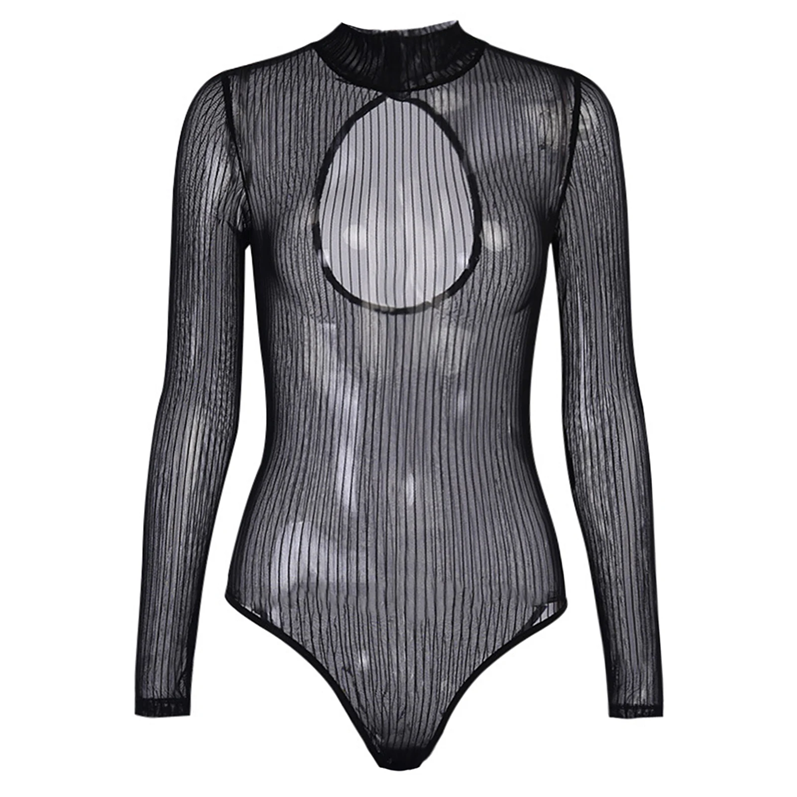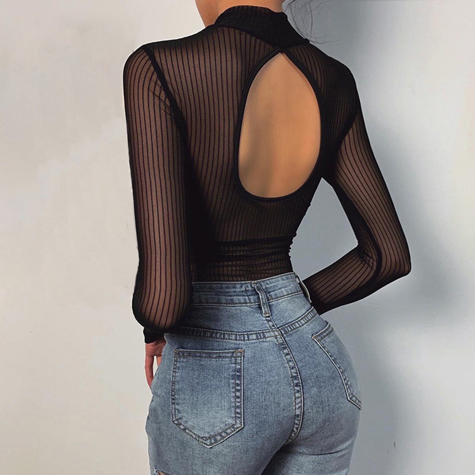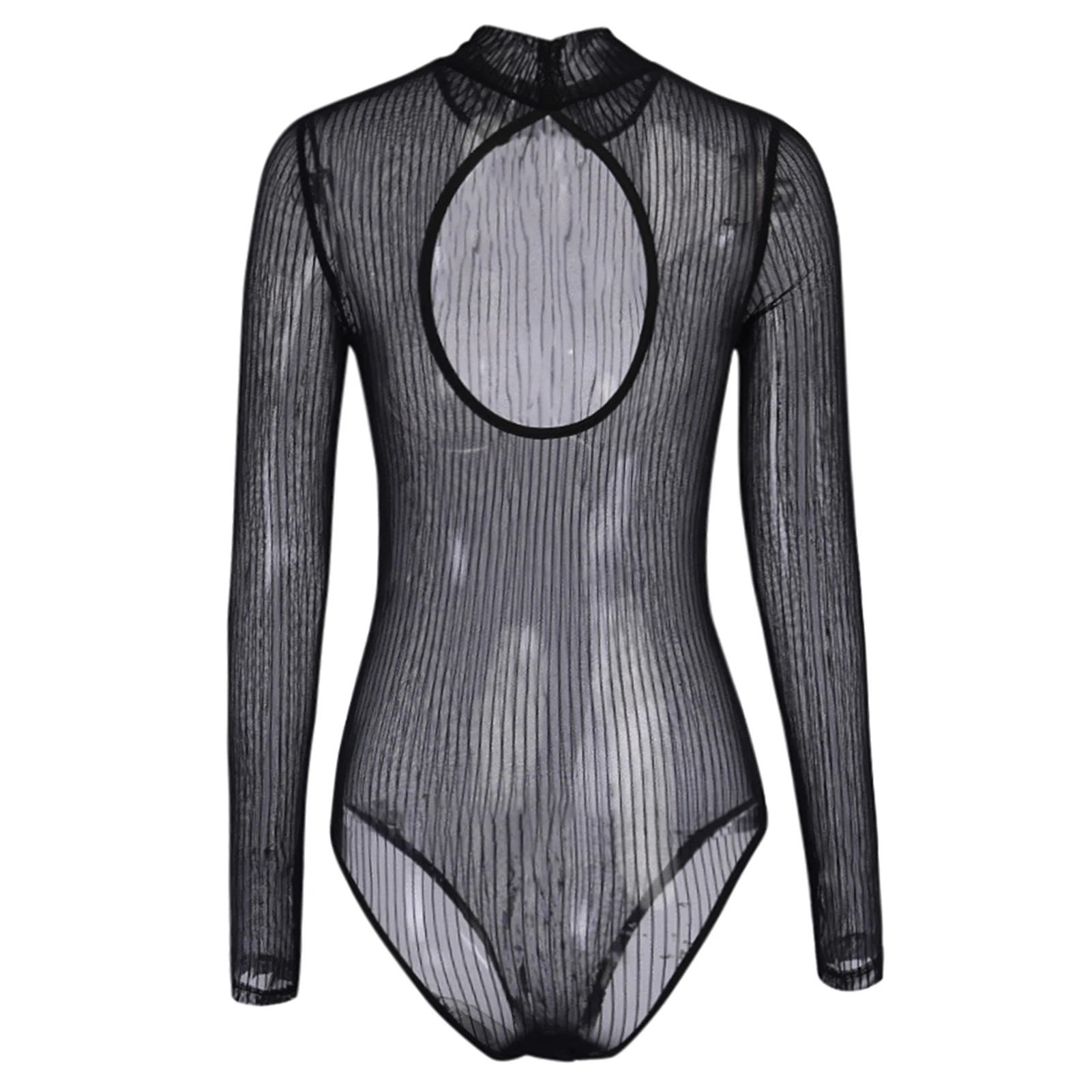 Women Bodysuit Backless Sexy See-through Mesh Stripes Slim Stand Collar Long Sleeves Jumpsuit Tops Fashion Bodysuit Clubwear