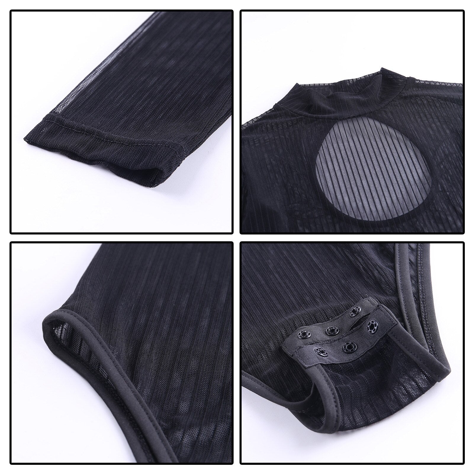 This bodysuit is of fine fabric, very soft to your skin. Featuring see-through mesh with stripes, a backless design, and a stand collar, it is chic and eye-catching. Also, it prevents sides to come up and the bumps when wearing skirts or leggings. This chic bodysuit is a nice choice for you.