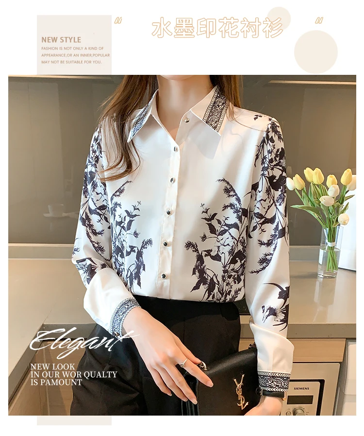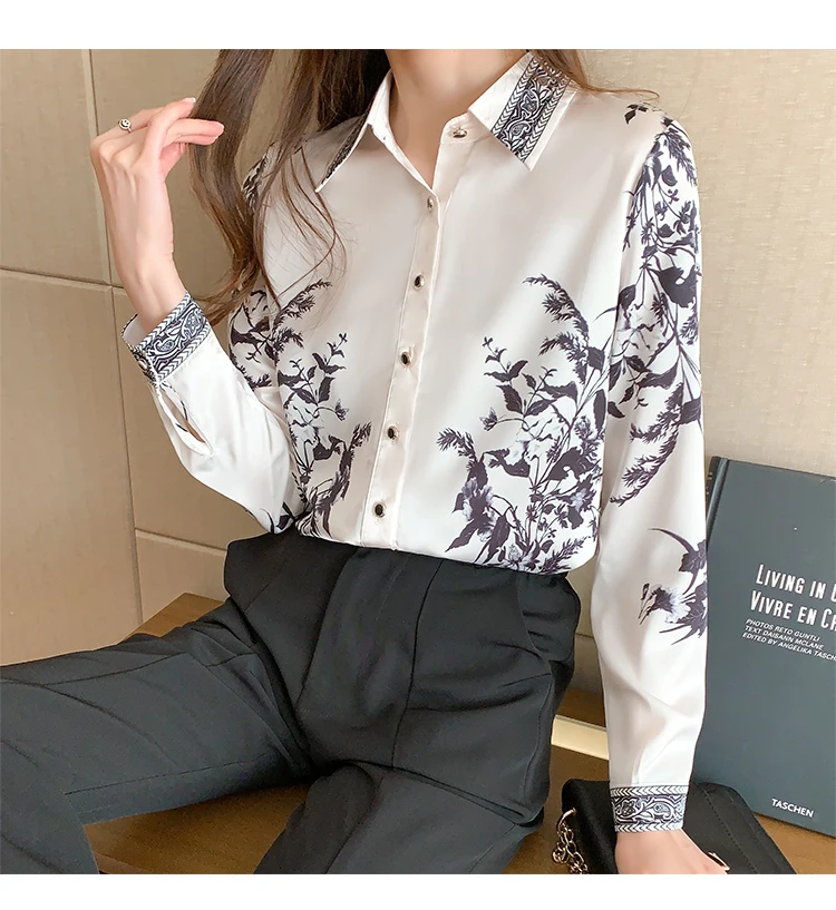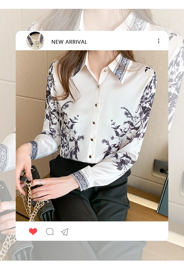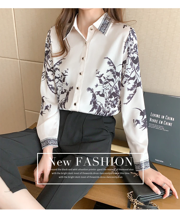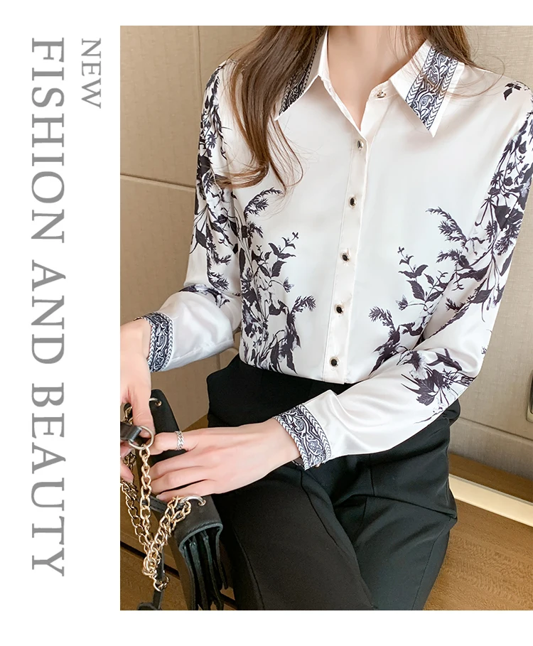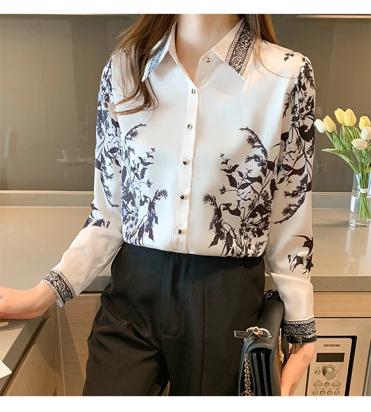 Women Chiffon Shirt New 2021 Spring Autumn Long Sleeve Blouse Shirt Elegant Slim Print Ofice Lady White Tops