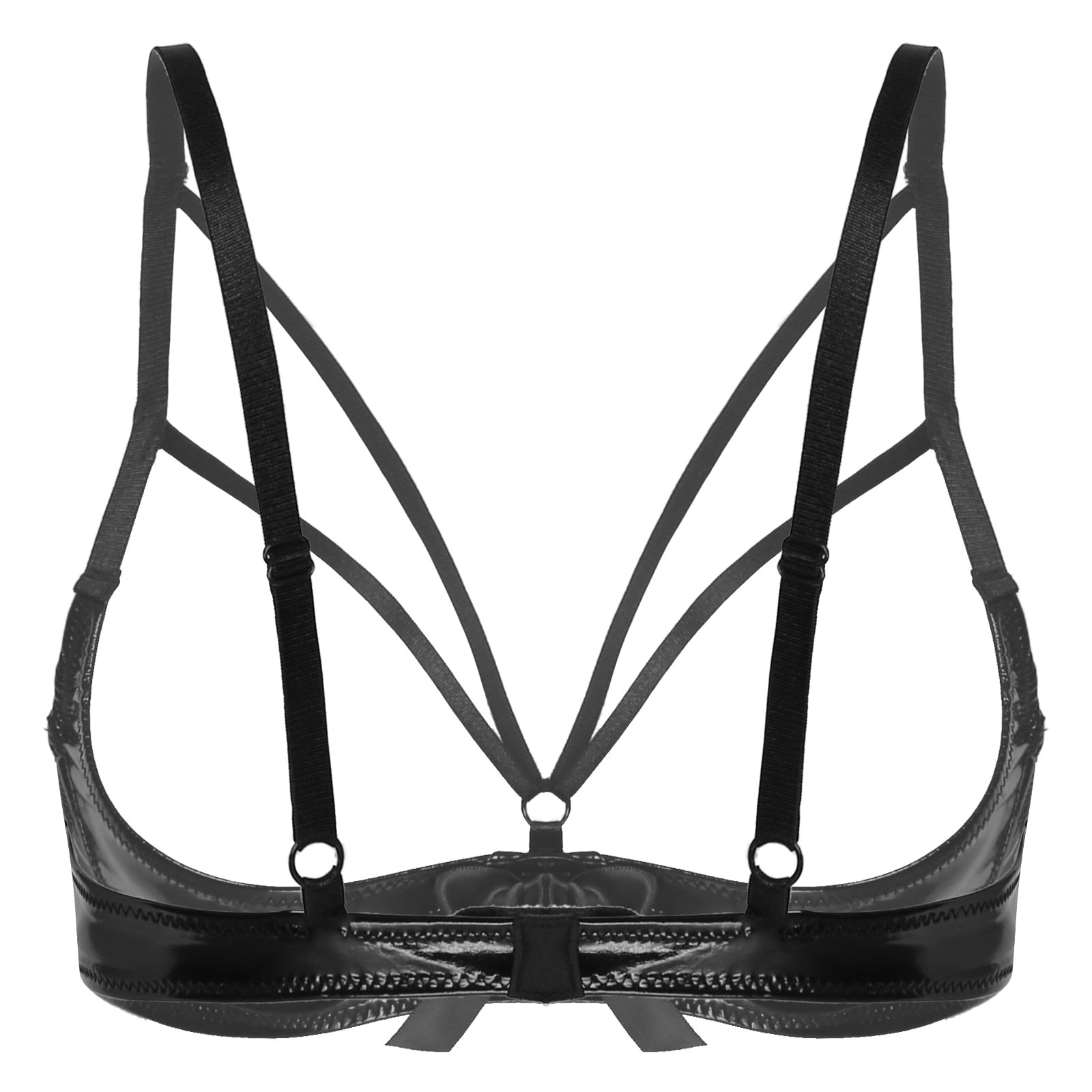 Women Strappy Open Cup Patent Leather Bowknot Underwired Bra Tops.