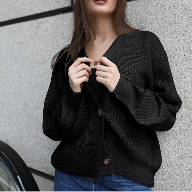 Women Knitted Cardigans Sweater Fashion Autumn Long Sleeve Loose Coat Casual Button Thick V Neck Solid Female Tops 2021
