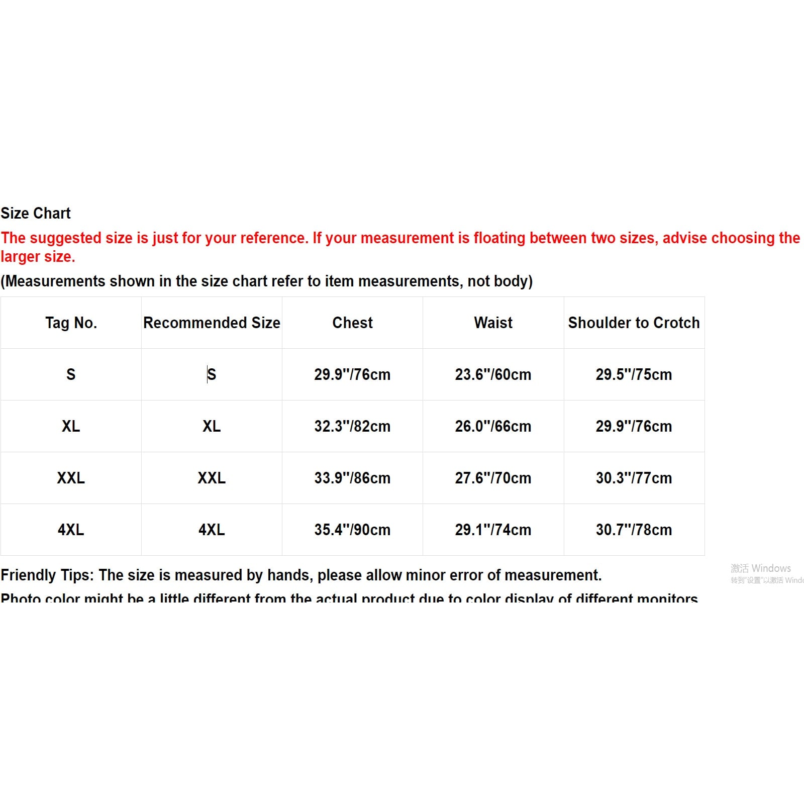 | Tag No. | Recommended Size | Chest | Waist | Shoulder to Crotch |