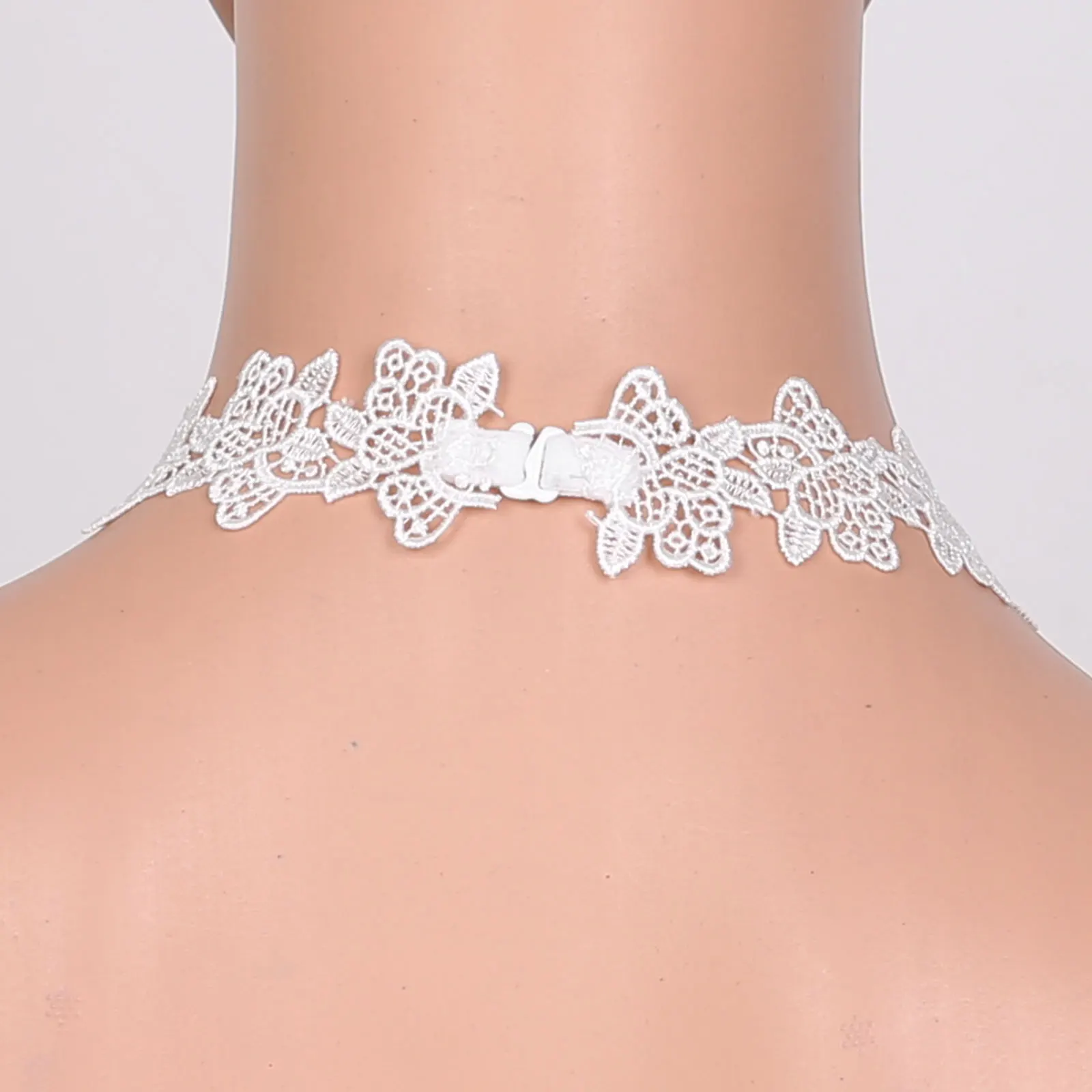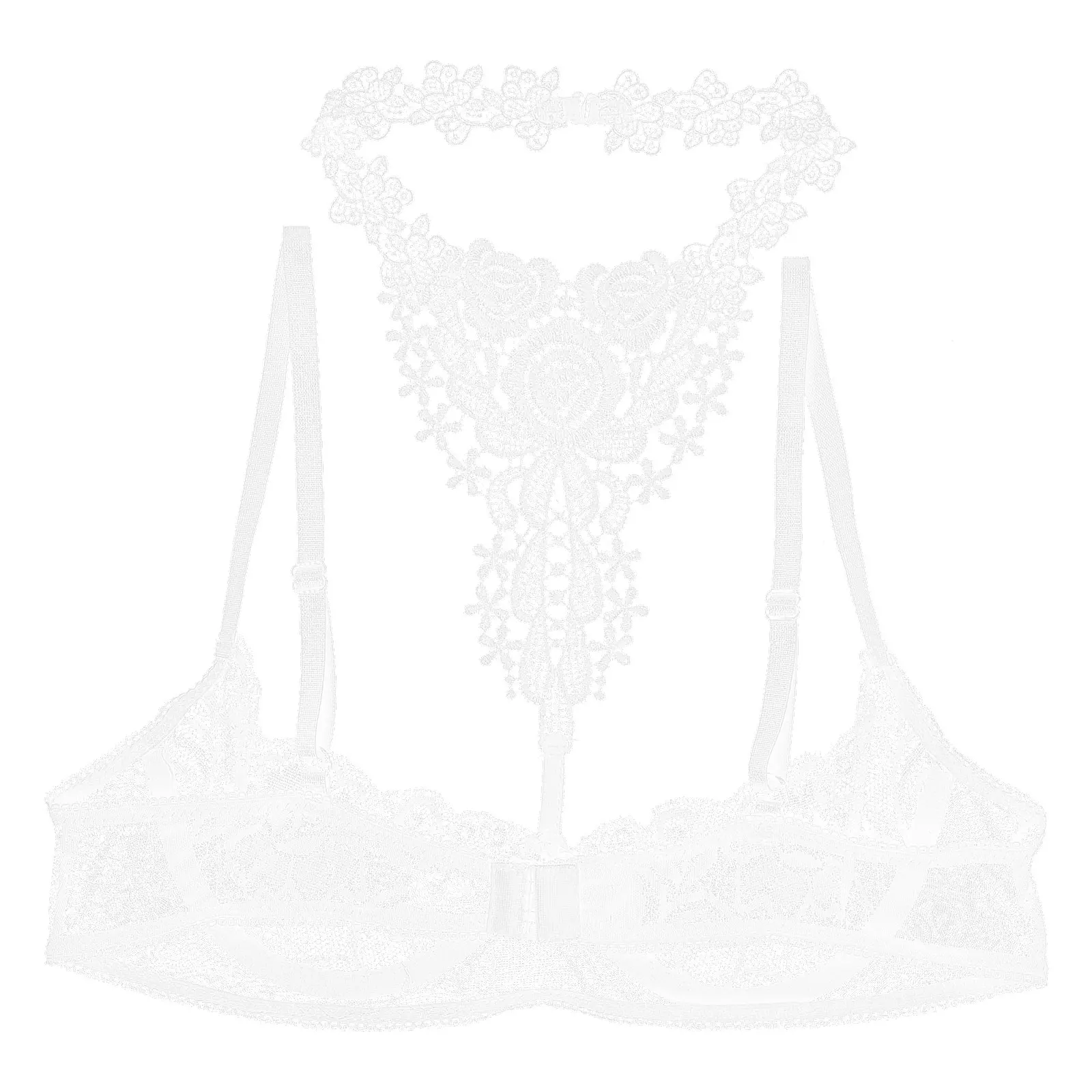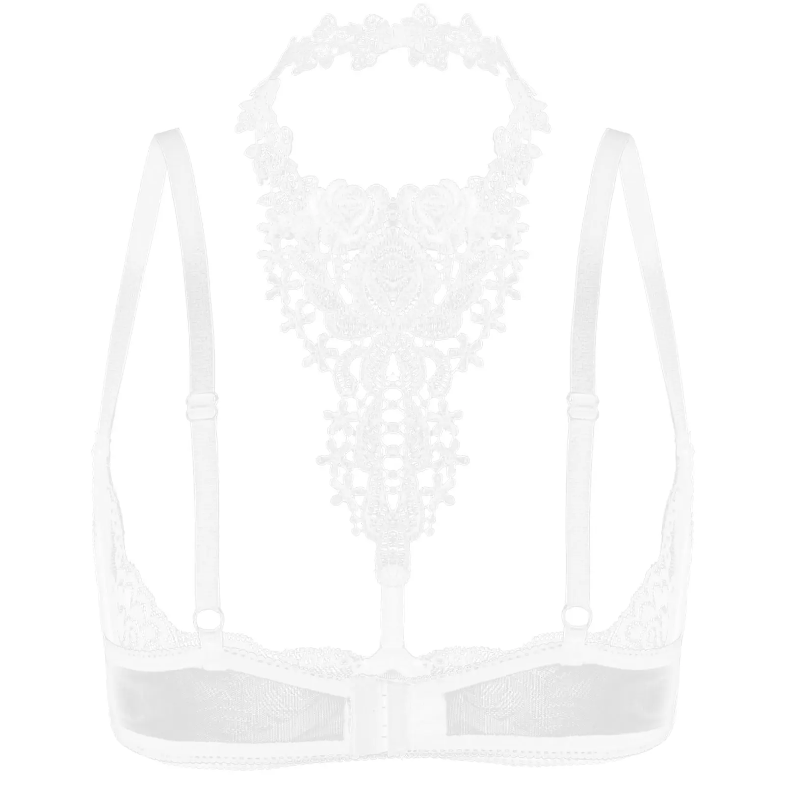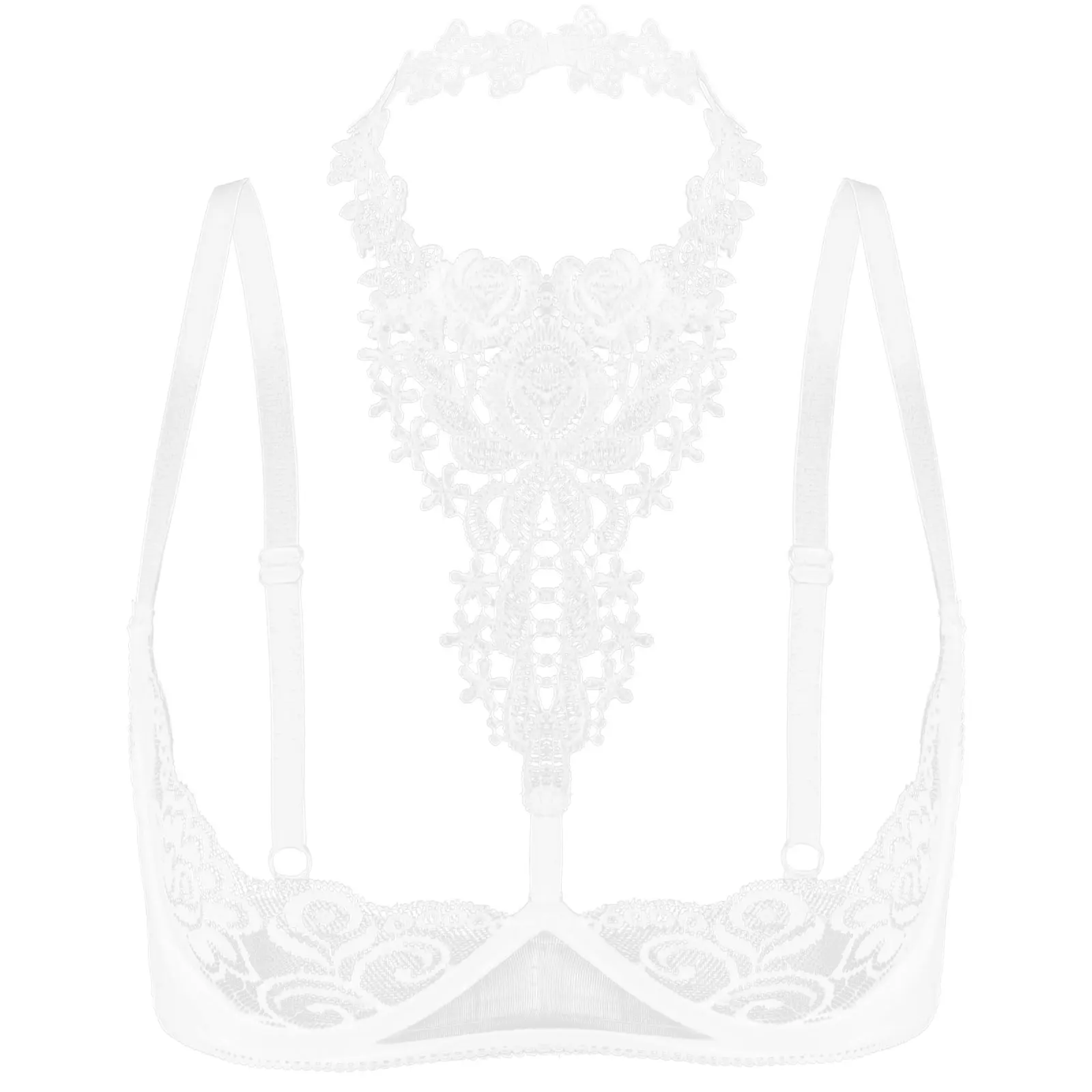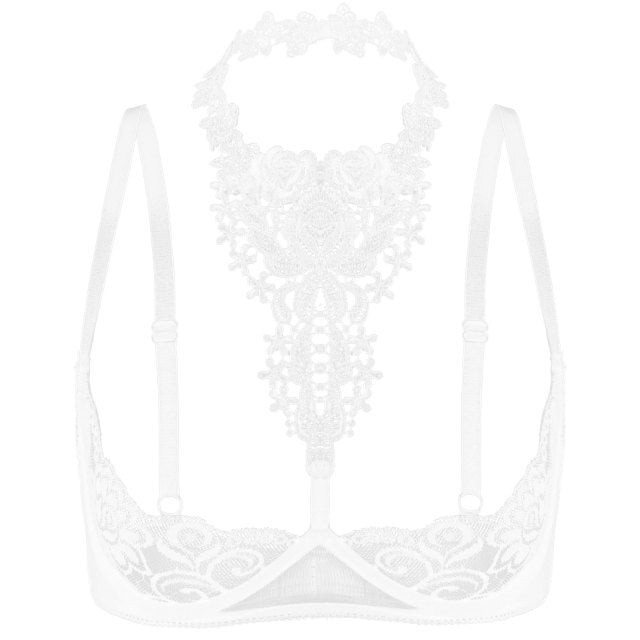 Halter neck, bare breast, see-through floral lace, looks hot and alluring.