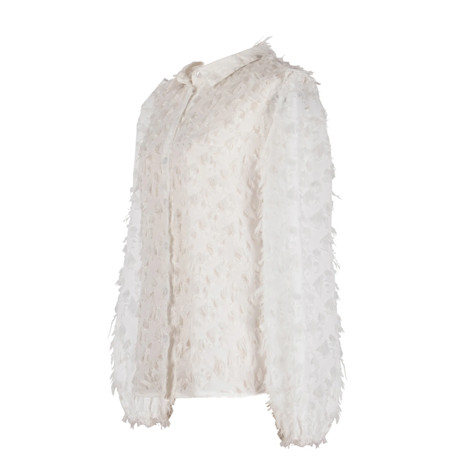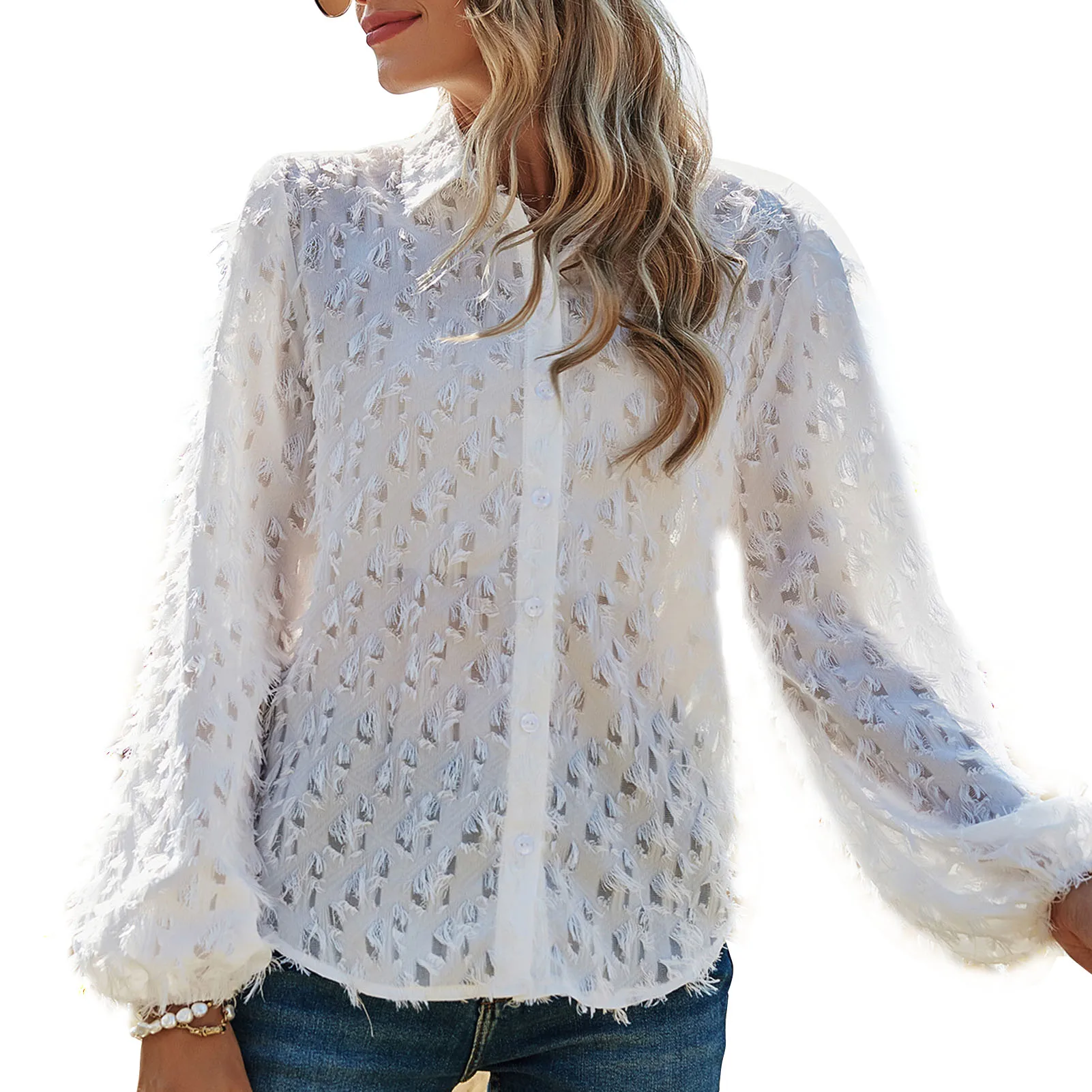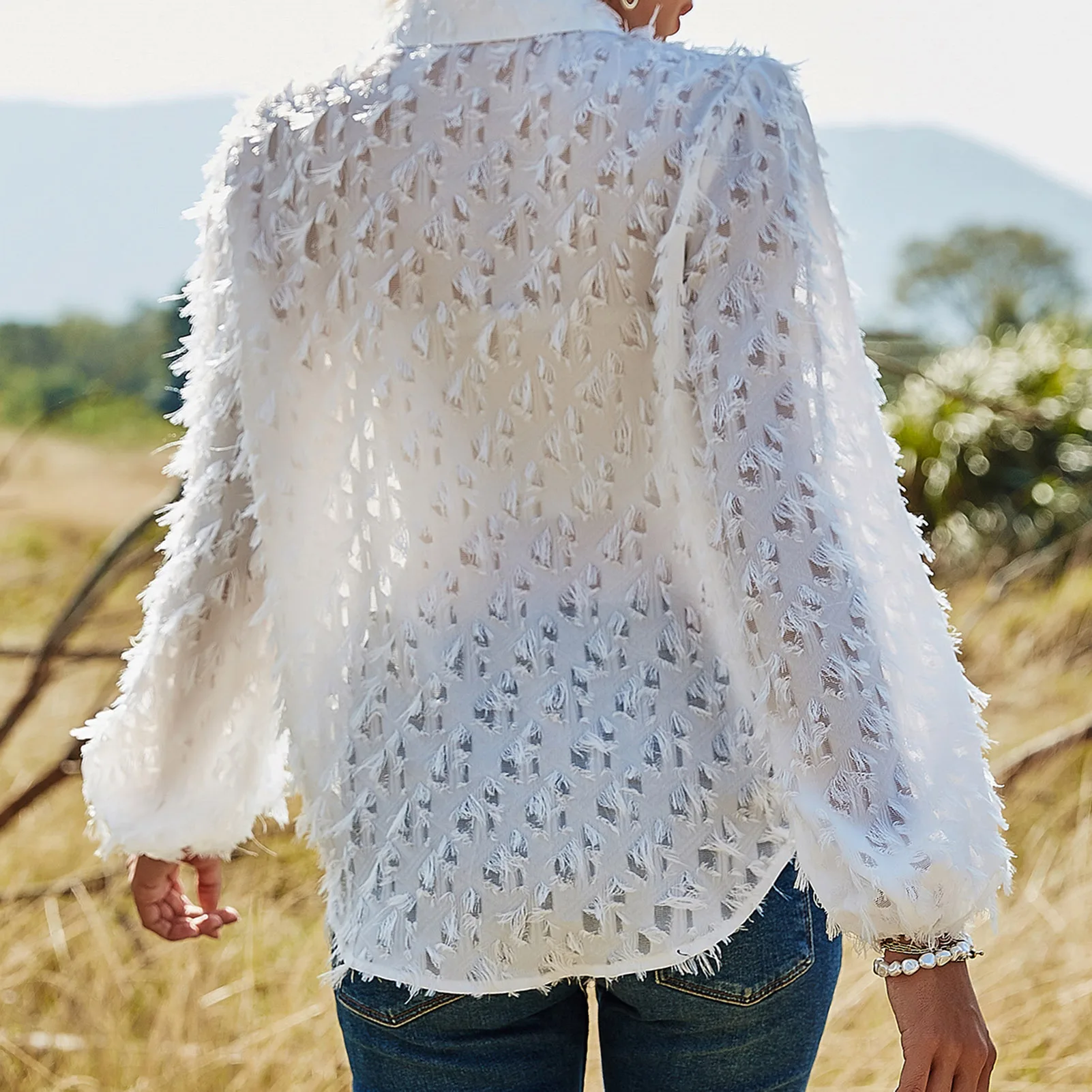 This shirt in white tassel design is beautiful and sweet. It has turn down collar, lantern sleeve and loose silhouette. Have it for spring or summer.