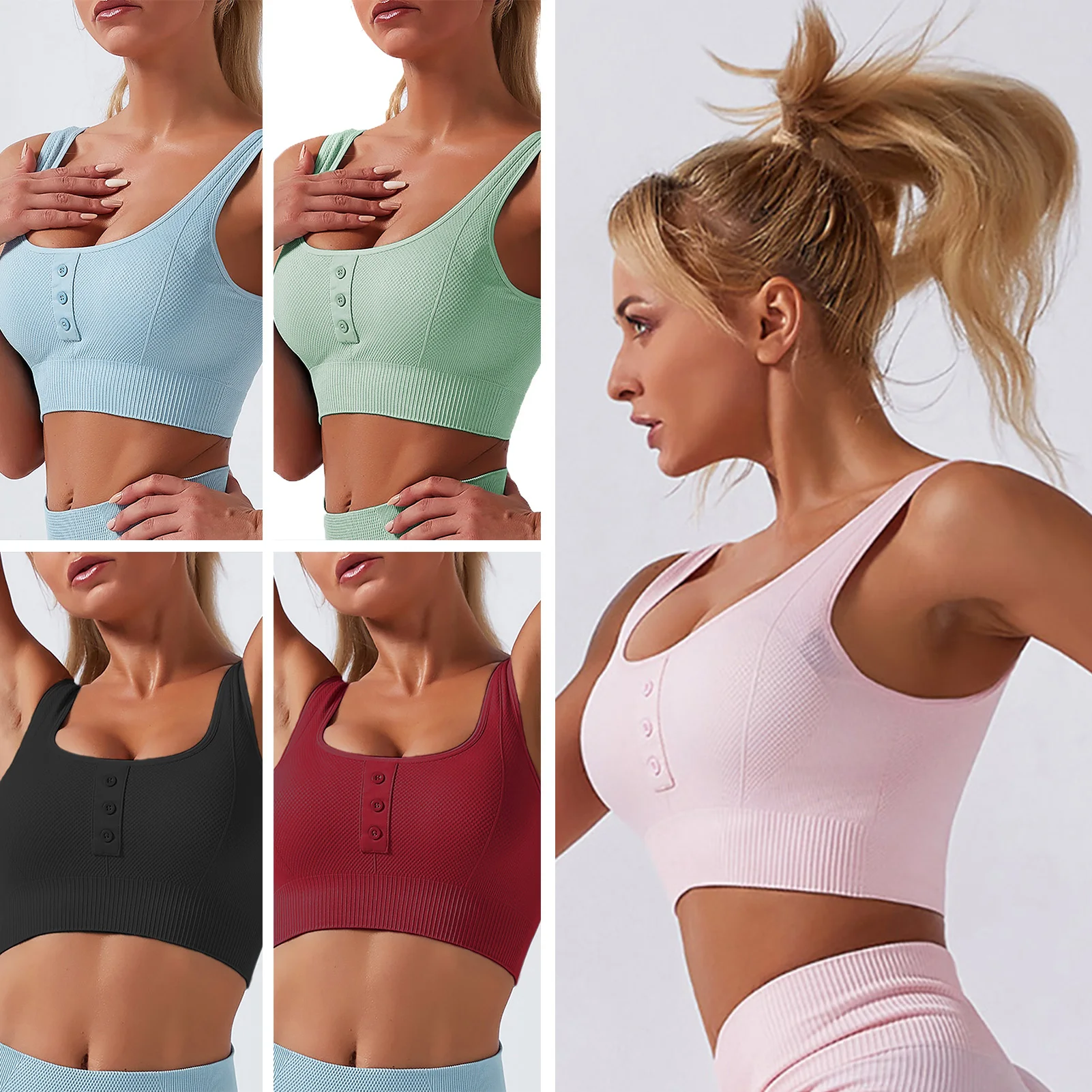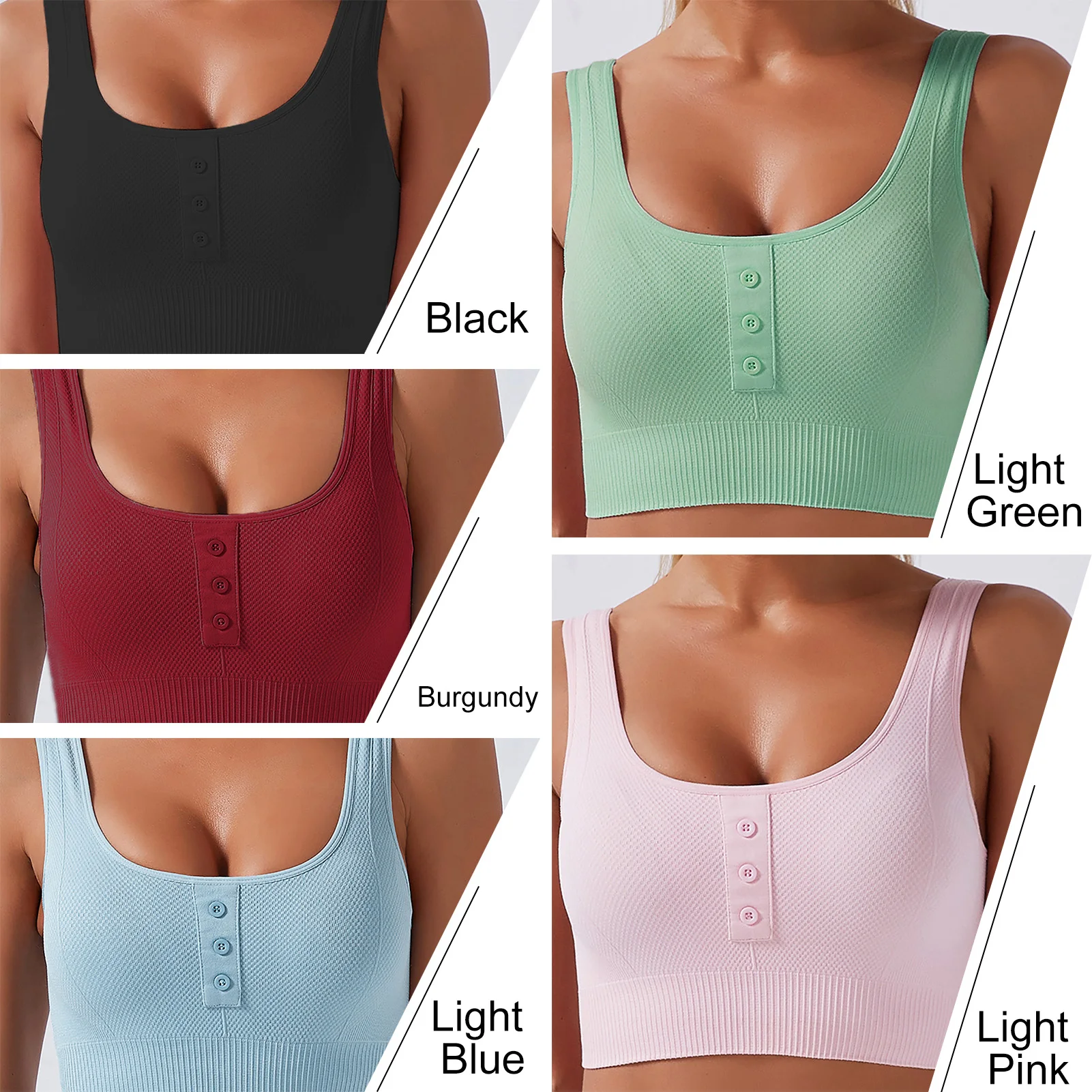 This sports bra is soft and elastic to wear. It has buttoned front, U-neck, removable pad and wide straps. A perfect bra for sports including running, yoga, fitness and dancing.