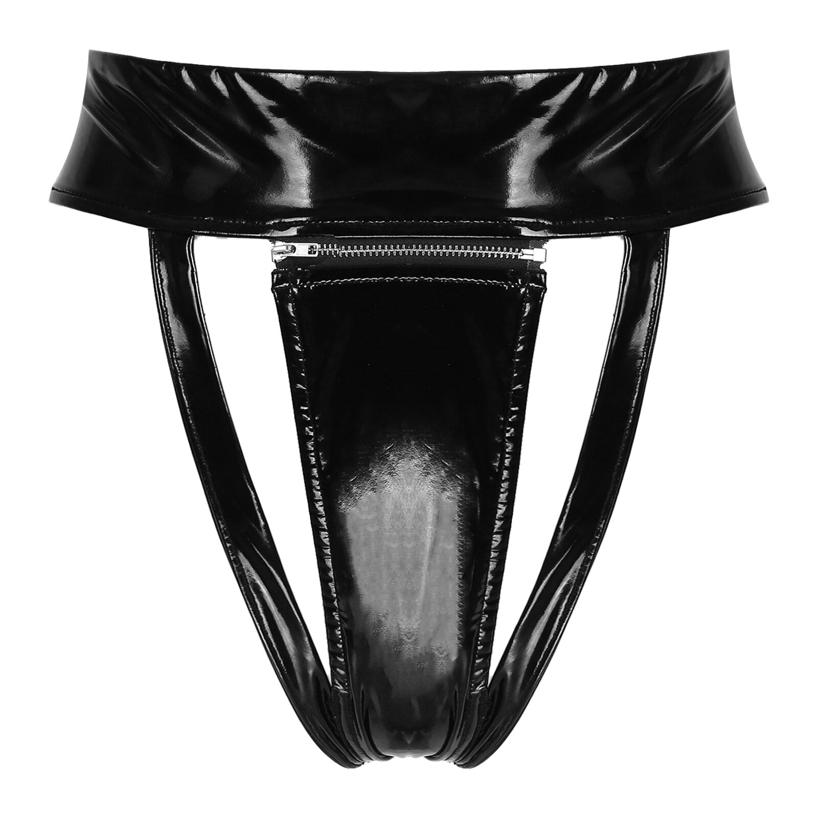 Womens Wetlook Patent Leather Thongs High Waist Zipper T-back.
