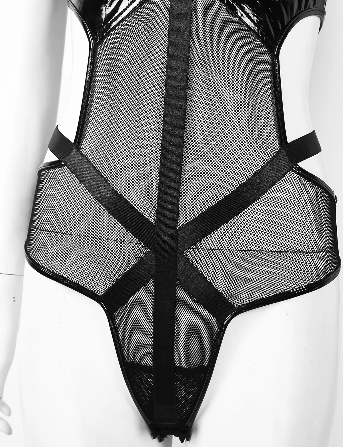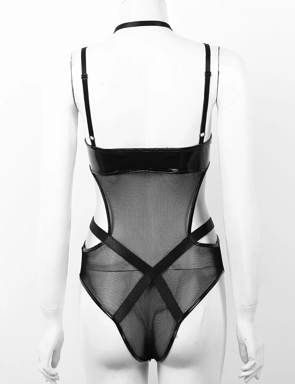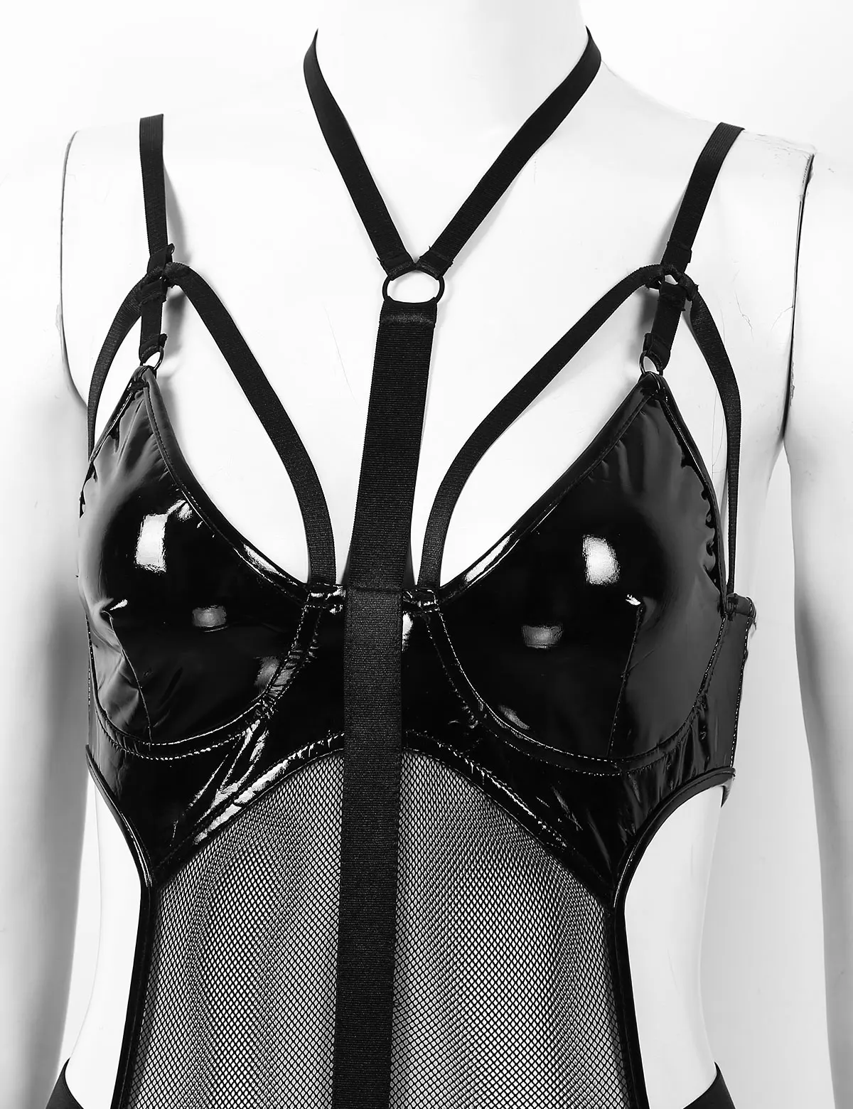 Women Wetlook Leather Mesh Leotard Bodysuit Latex Catsuit V-neck Adjustable Straps Open Crotch Body Suit Pole Dance Jumpsuit