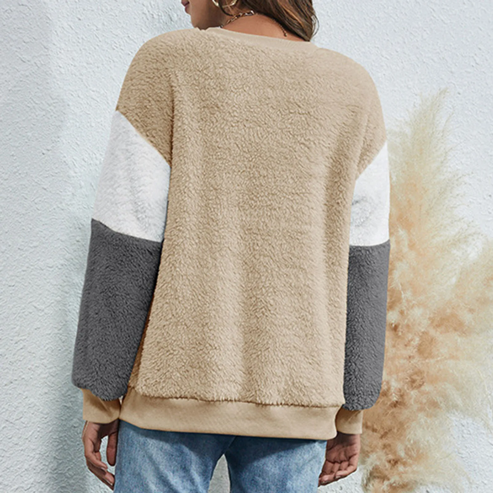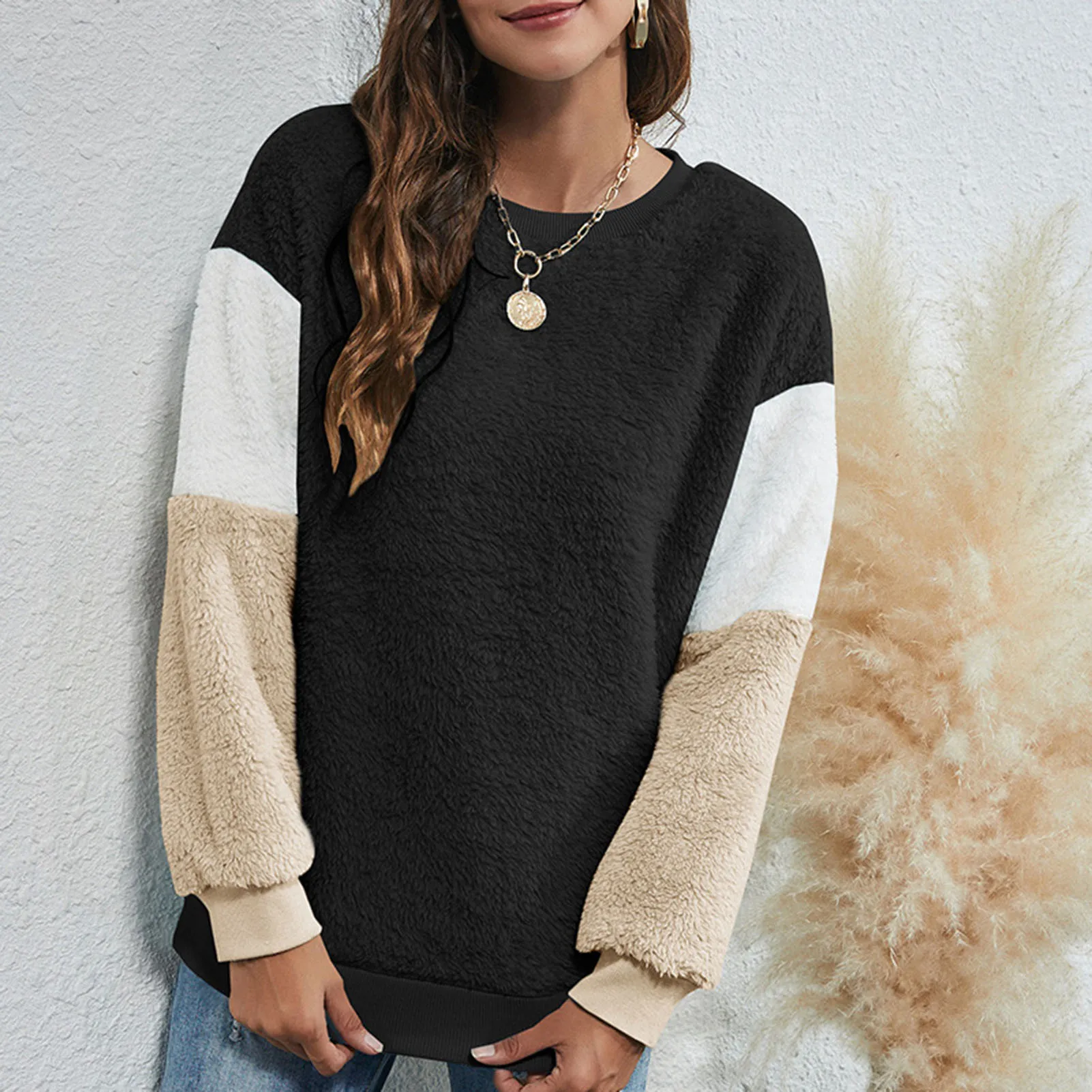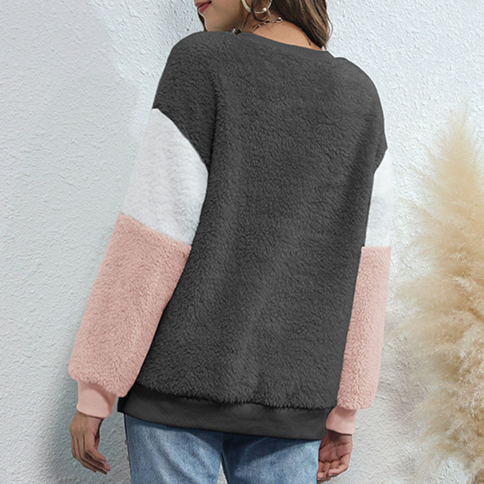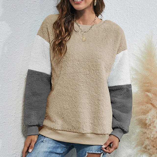 Soft and furry sweatshirt keeps you warm and chic in this winter. It has fleece fabric, dropped shoulder and long sleeves. Splicing color design fits for lounging and outdoor. Have it to pair jeans.