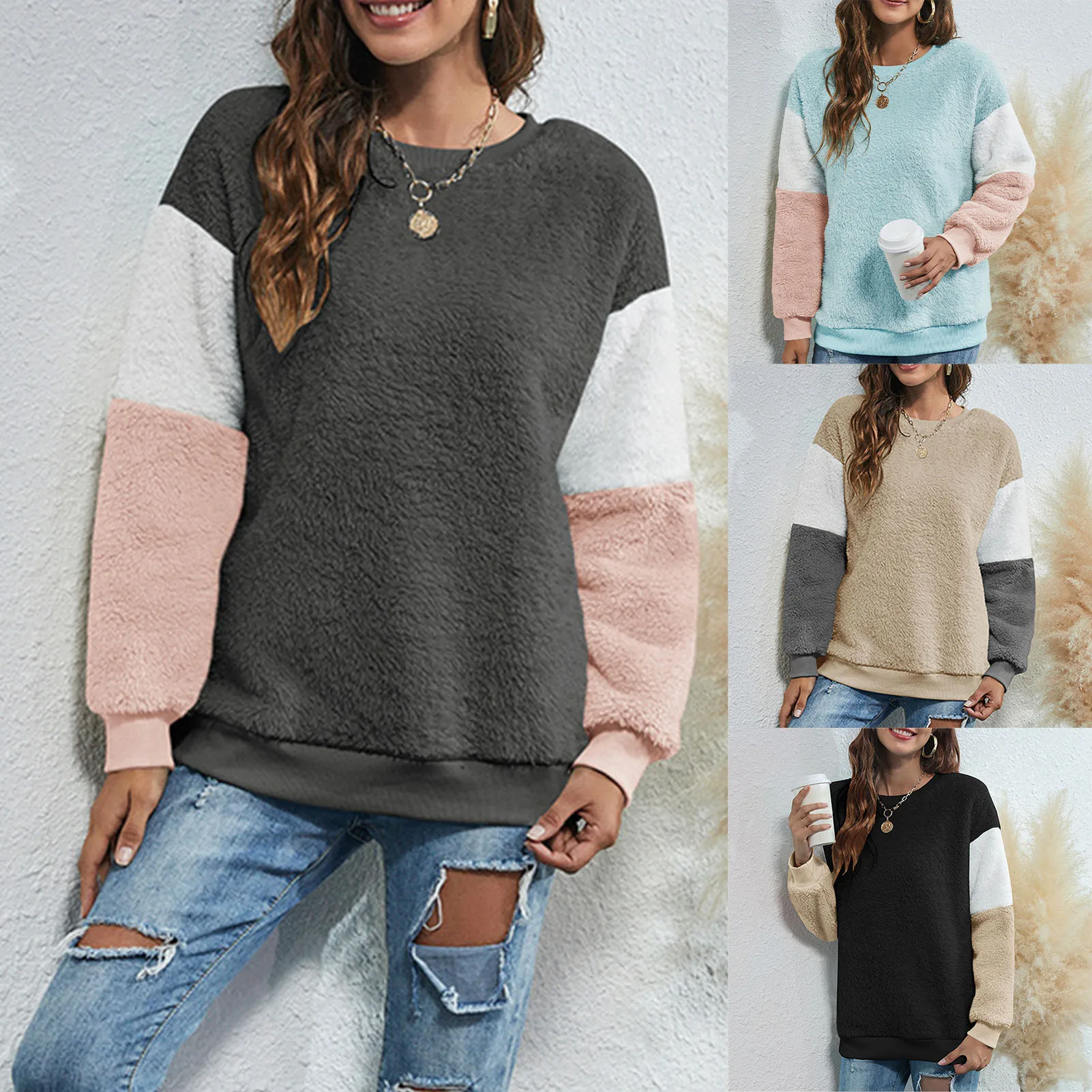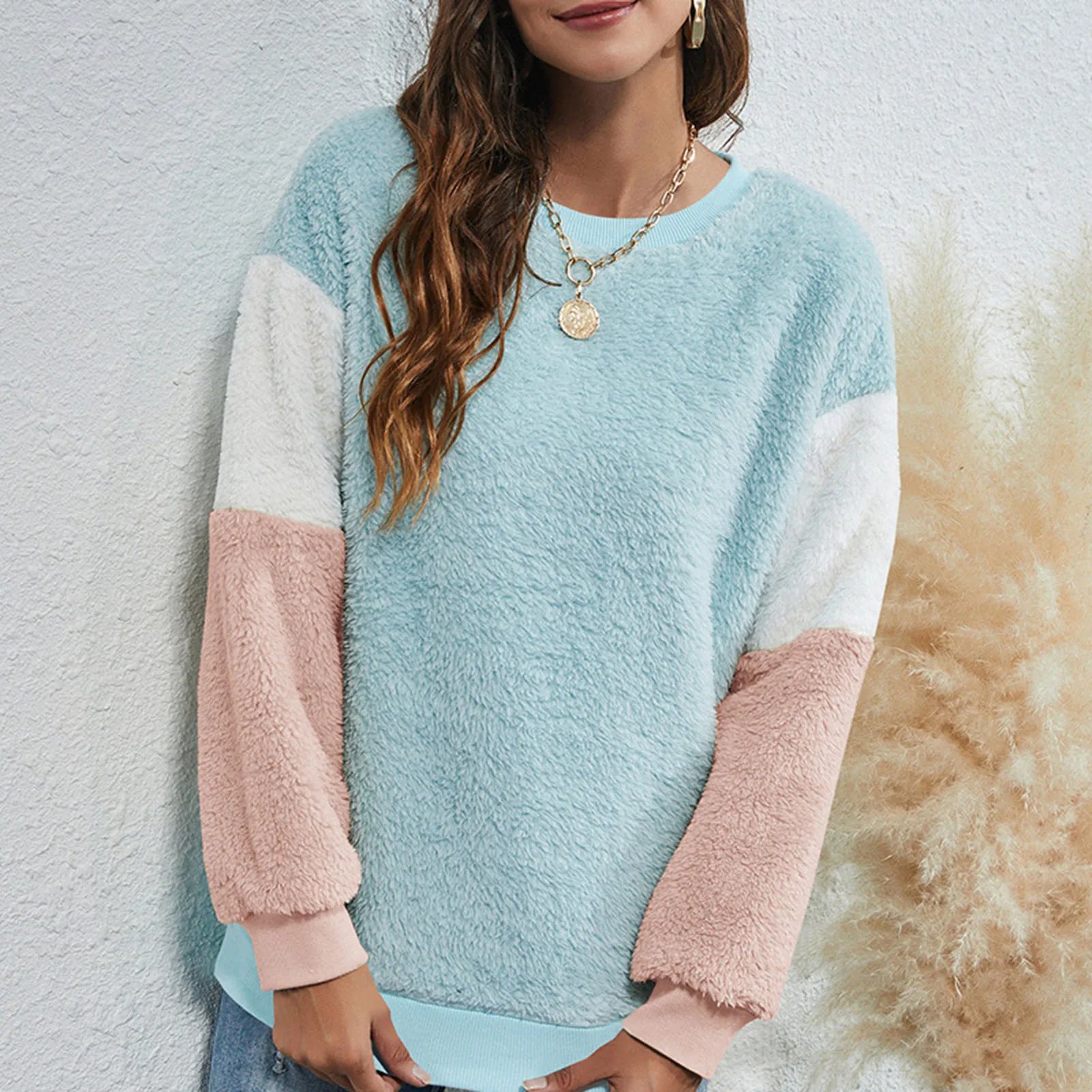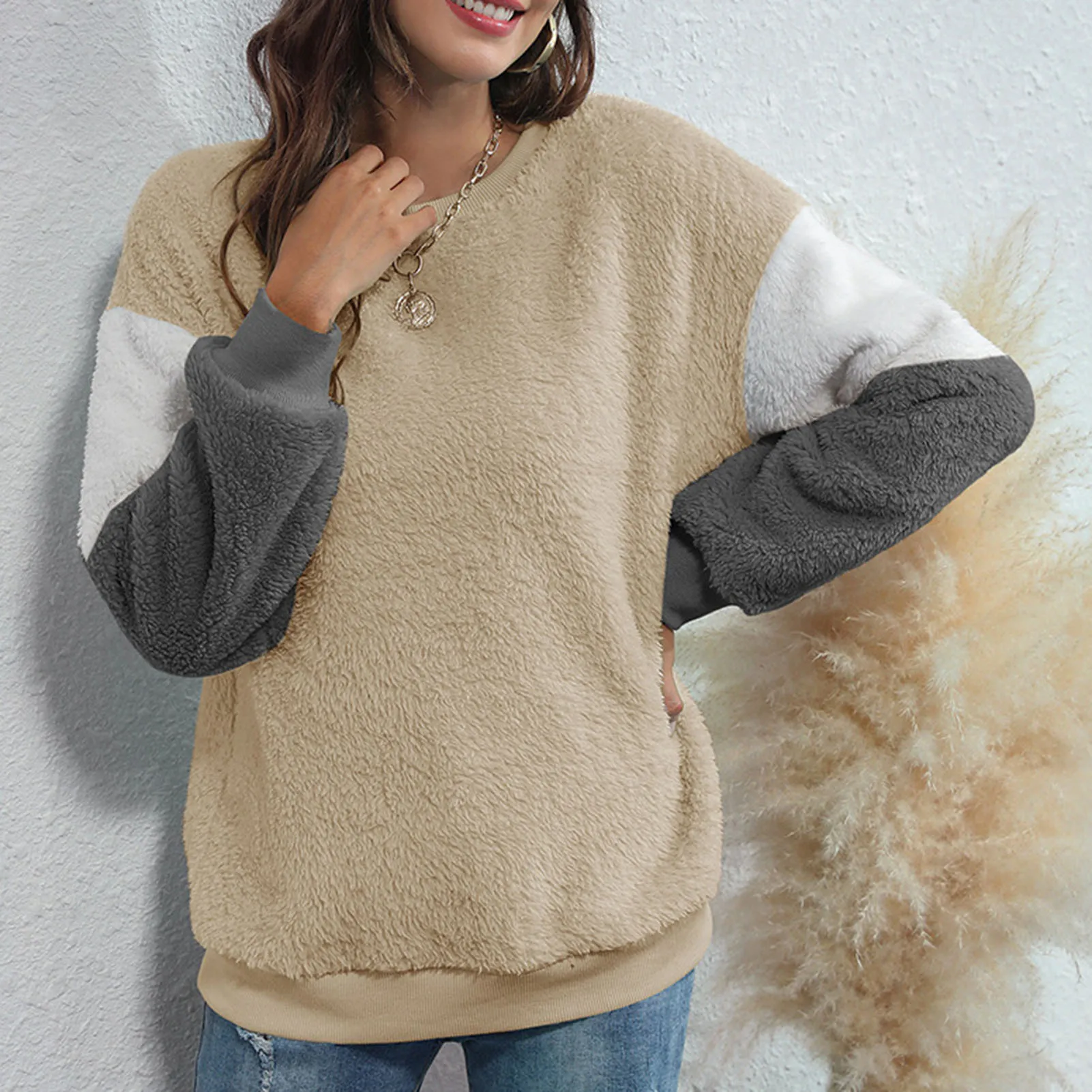 Soft and furry sweatshirt keeps you warm and chic in this winter. It has fleece fabric, dropped shoulder and long sleeves. Splicing color design fits for lounging and outdoor. Have it to pair jeans.