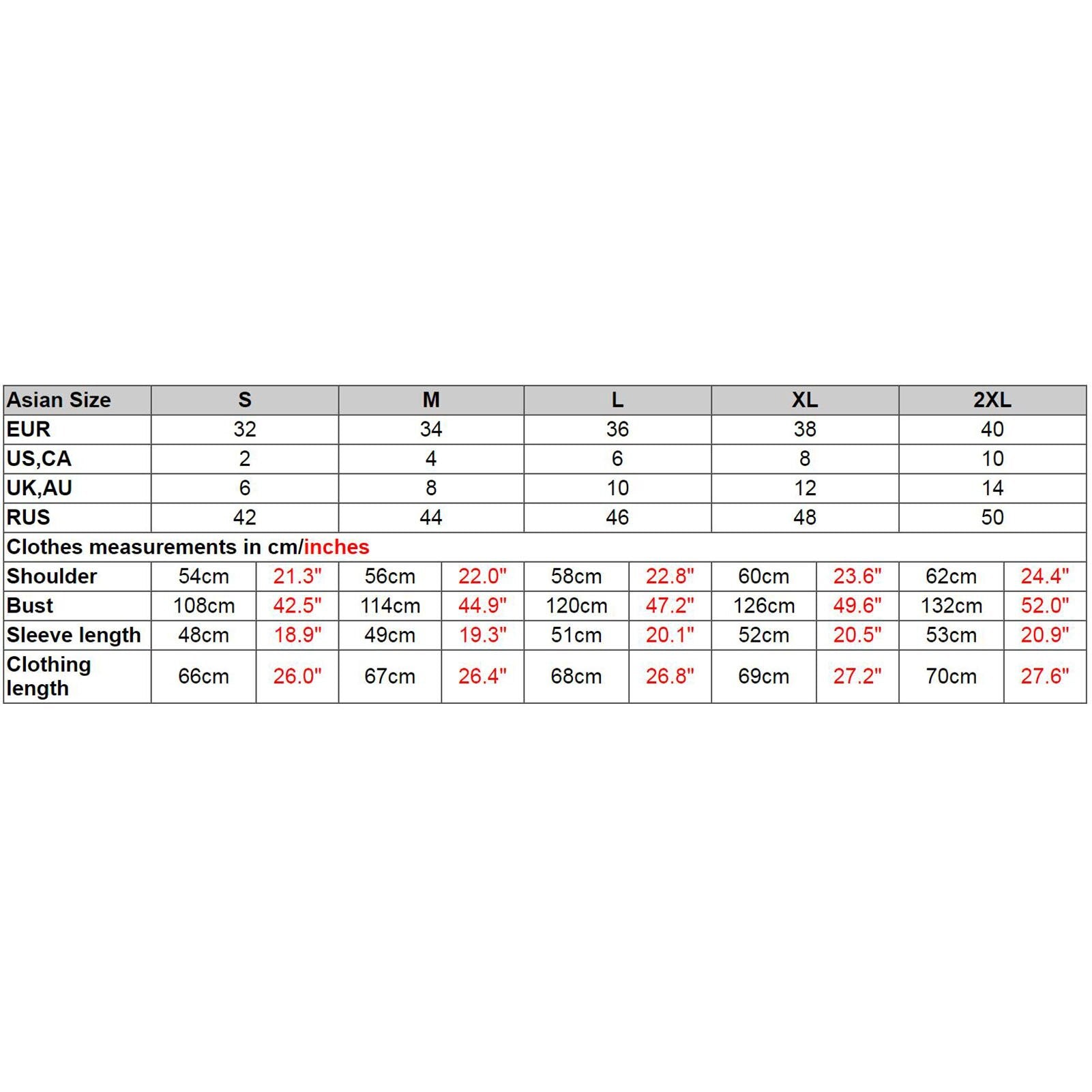 | Asian Size | S | M | L | XL | 2XL | |||||