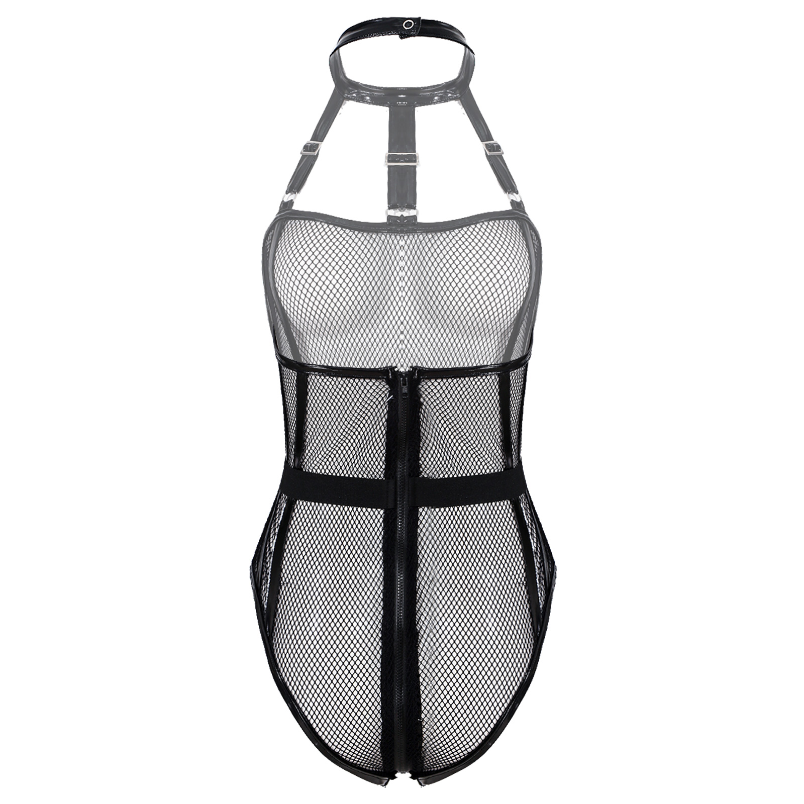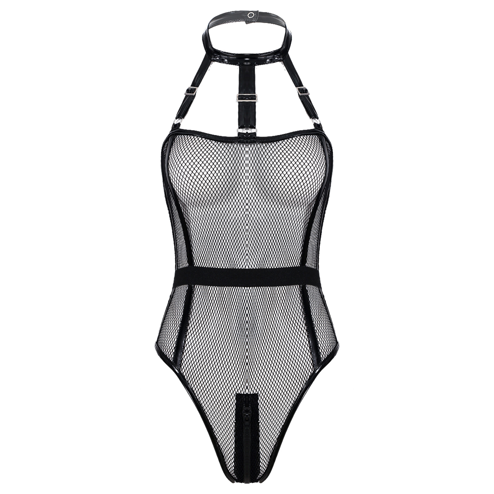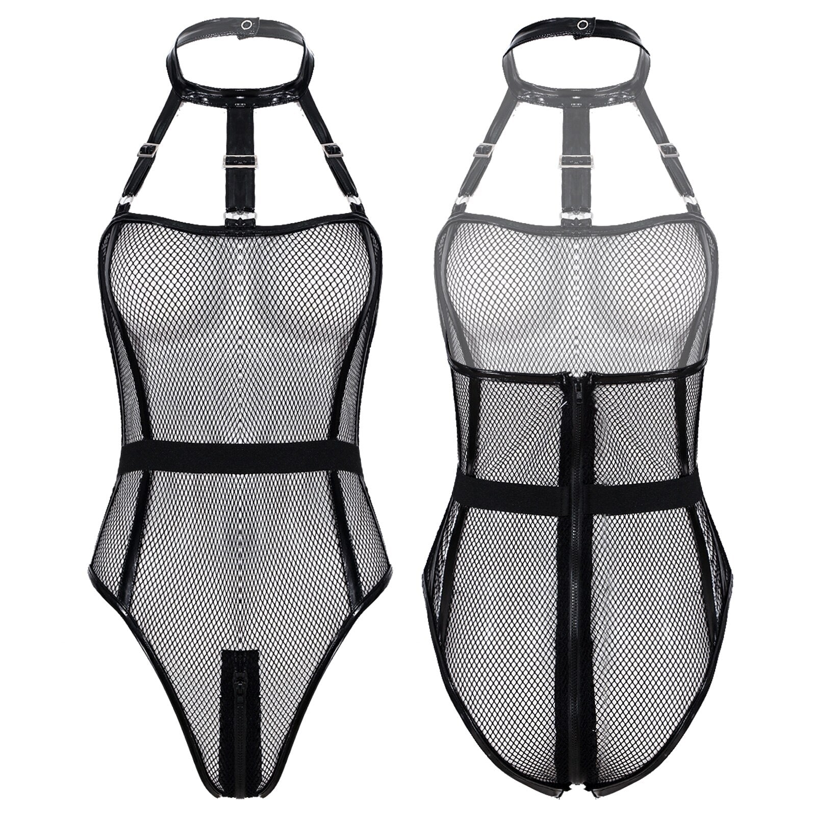 See-through Hollow Out Fishnet Bodysuit Halter Zipper Leotard for Women.