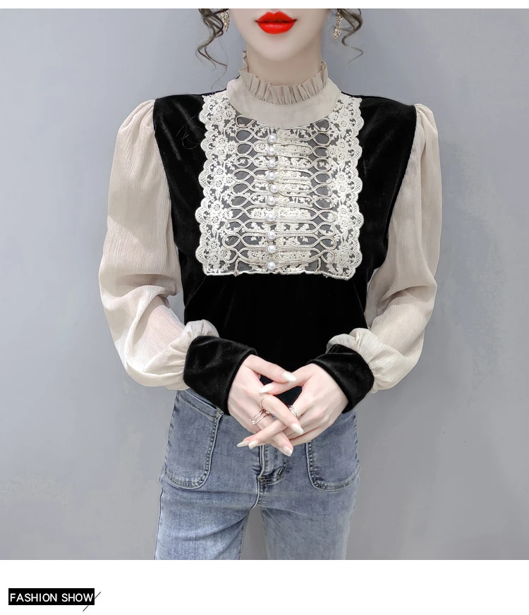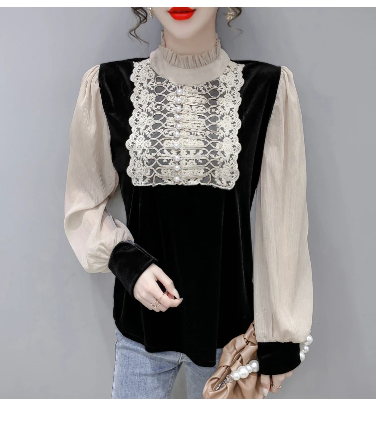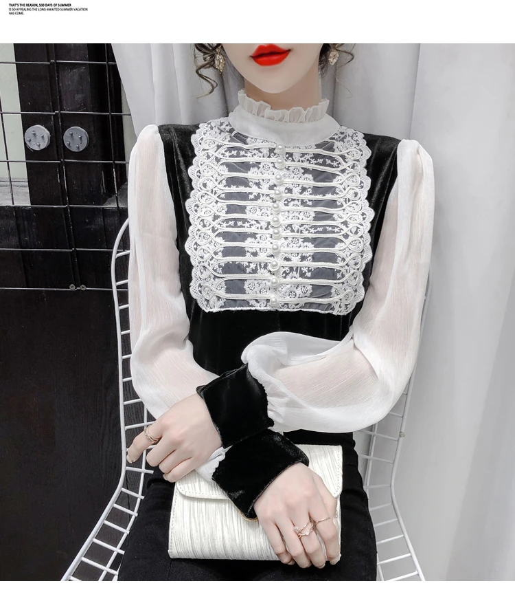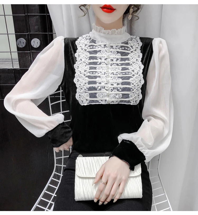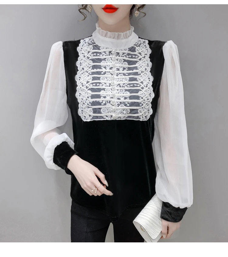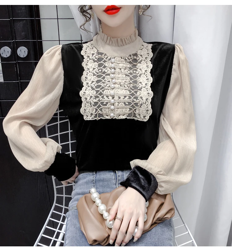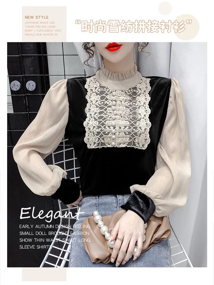 Women's Gold Velvet Stitching Lace Bottoming Shirt New 2021 Spring Long Sleeve Chiffon Blouse Elegant Vintage Blusas Tops