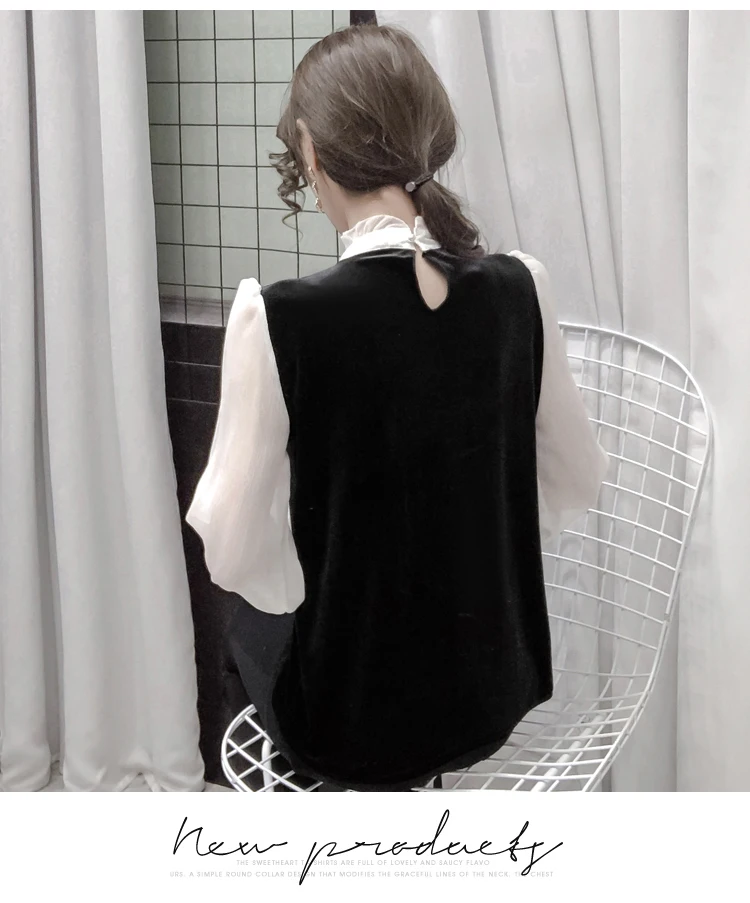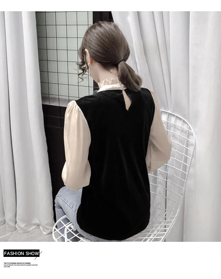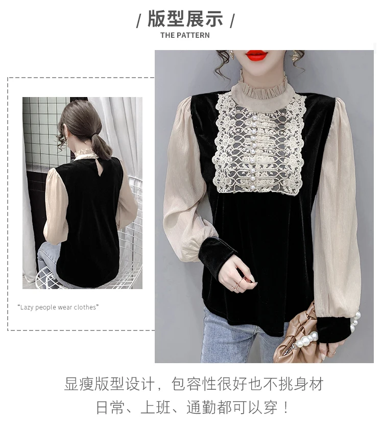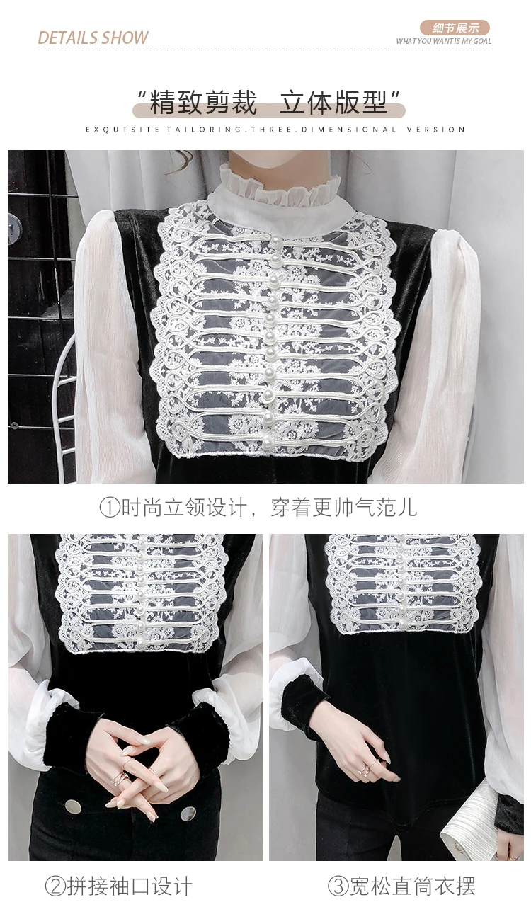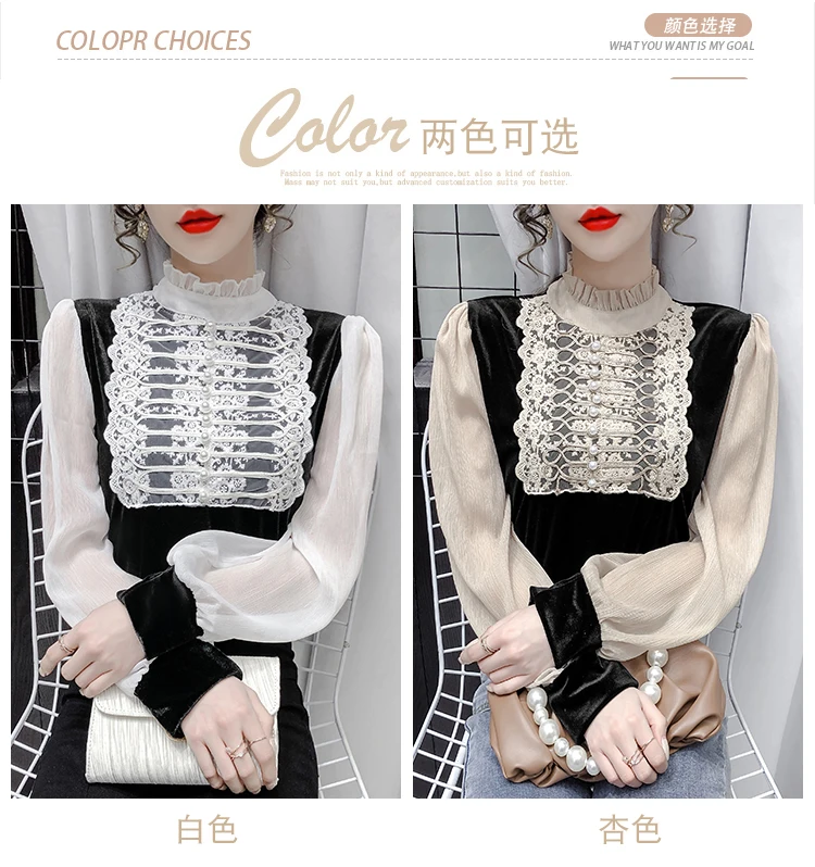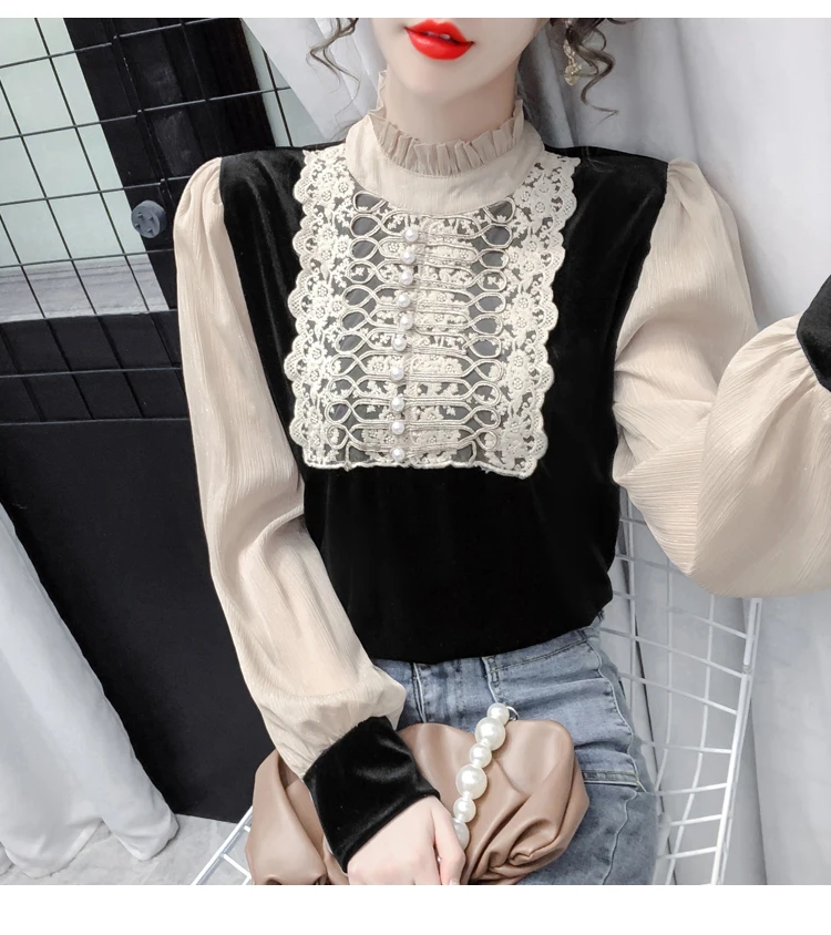 Women's Gold Velvet Stitching Lace Bottoming Shirt New 2021 Spring Long Sleeve Chiffon Blouse Elegant Vintage Blusas Tops