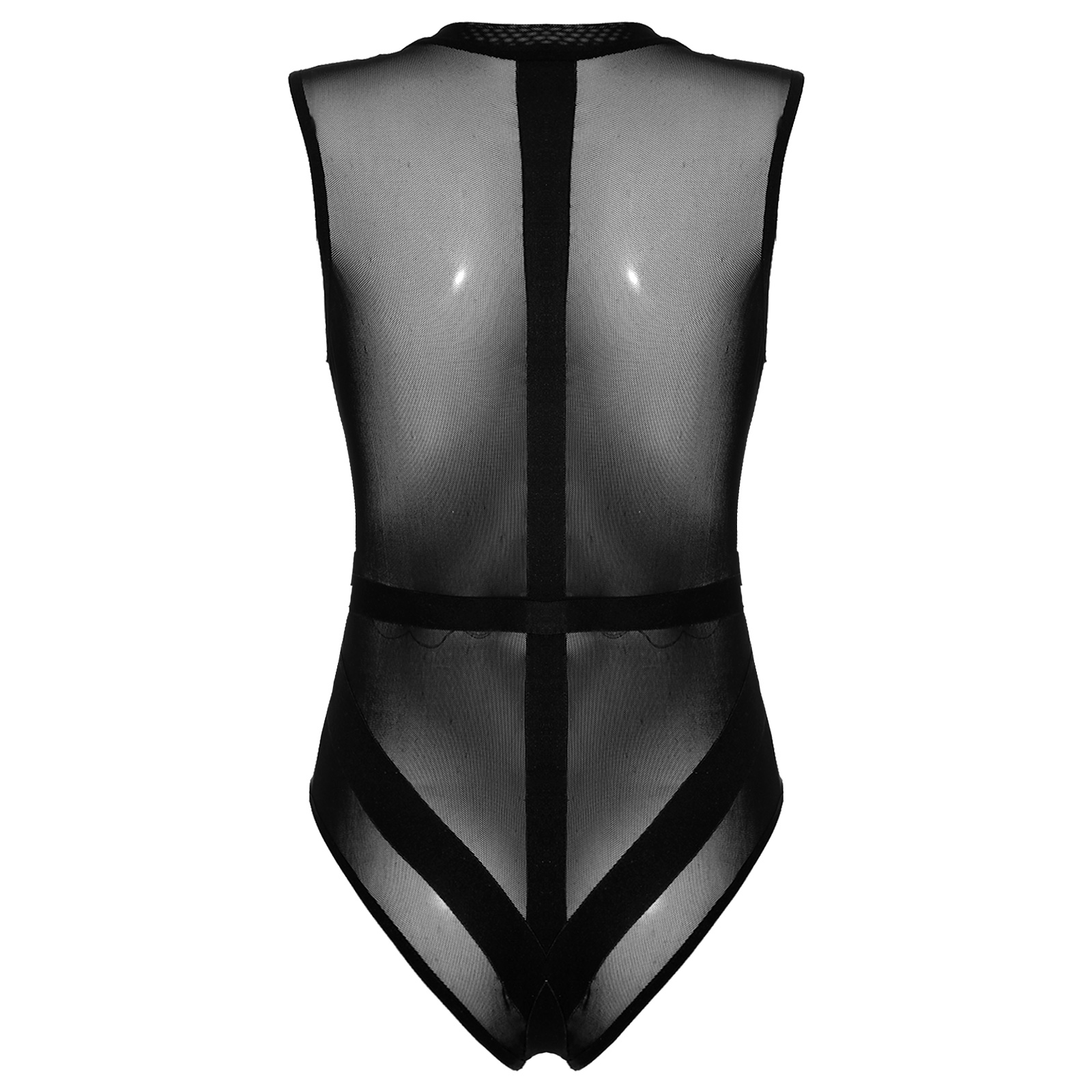 Women Sheer Mesh Sleeveless Bodysuit O Neck Elastic Band Patchwork Leotard Zipper Front Catsuit.
