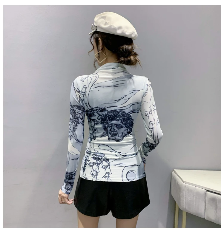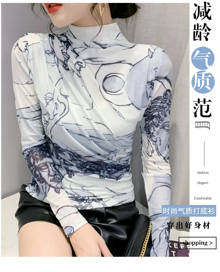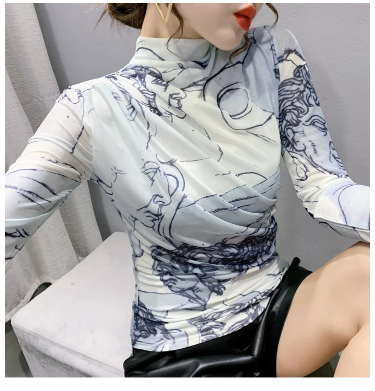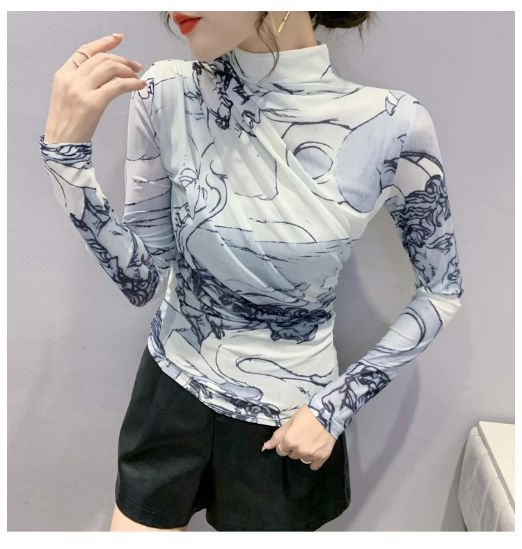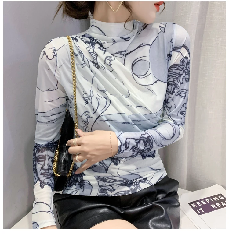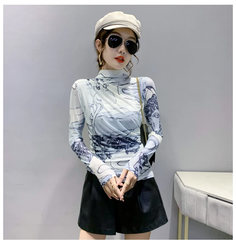 Women's T-Shirt Autumn 2021 New Fashion Print Mesh Tops Elegant Slim Turtleneck Long Sleeve Women Clothing