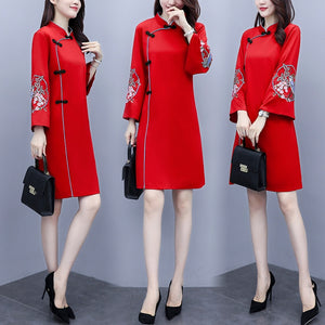 Chinese Style New Year Improved Cheongsam Women Autumn Long Sleeve Stand Collar Retro Buckle Elegant Slim Mini Dress Lady Qipao