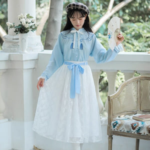 Chinese Style Improved Sweet Retro Hanfu Suit Women Autumn Embroidery Chic Blue Shirt Top+White Lace Fairy Skirt Shorts Sets