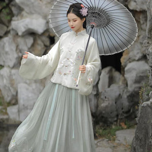 Chinese Style Embroidered Retro Hanfu Three Piece Set Women Diagonal Lace-up V-neck Blouse+Crop Vest+Streamer Pleated Dress Suit