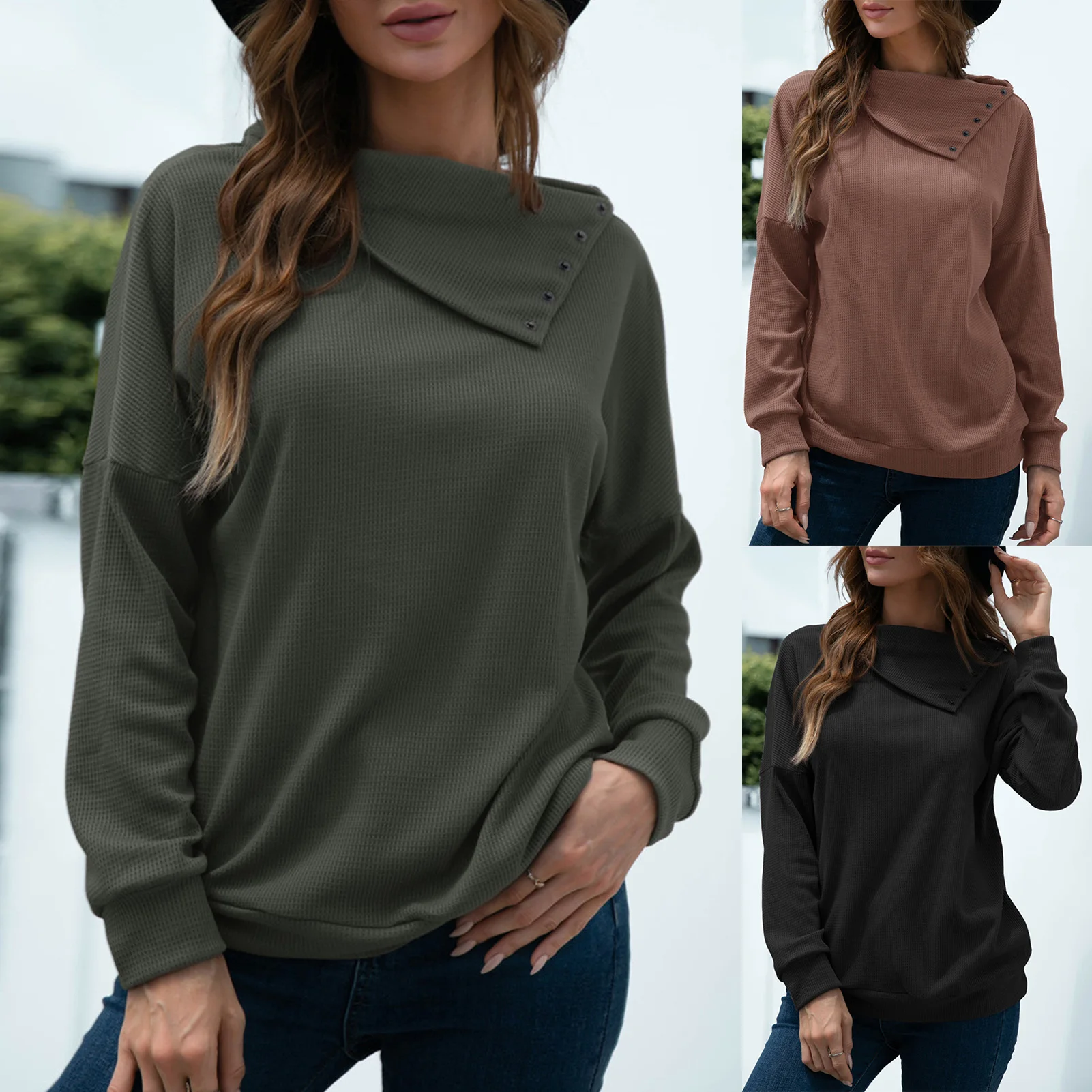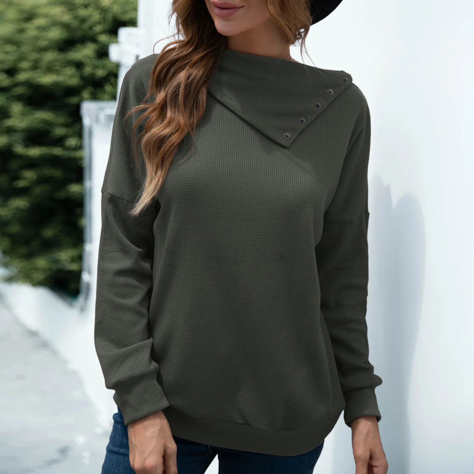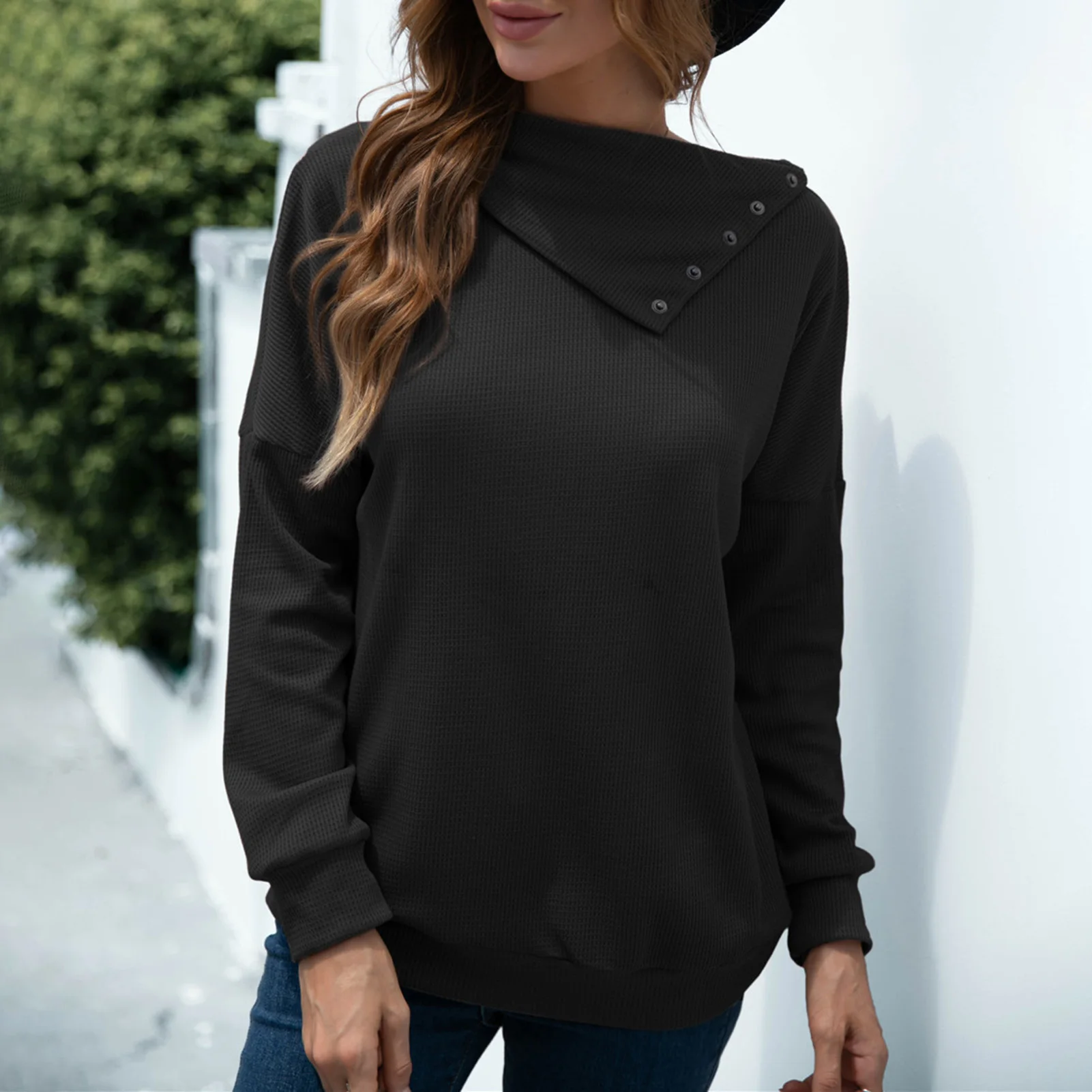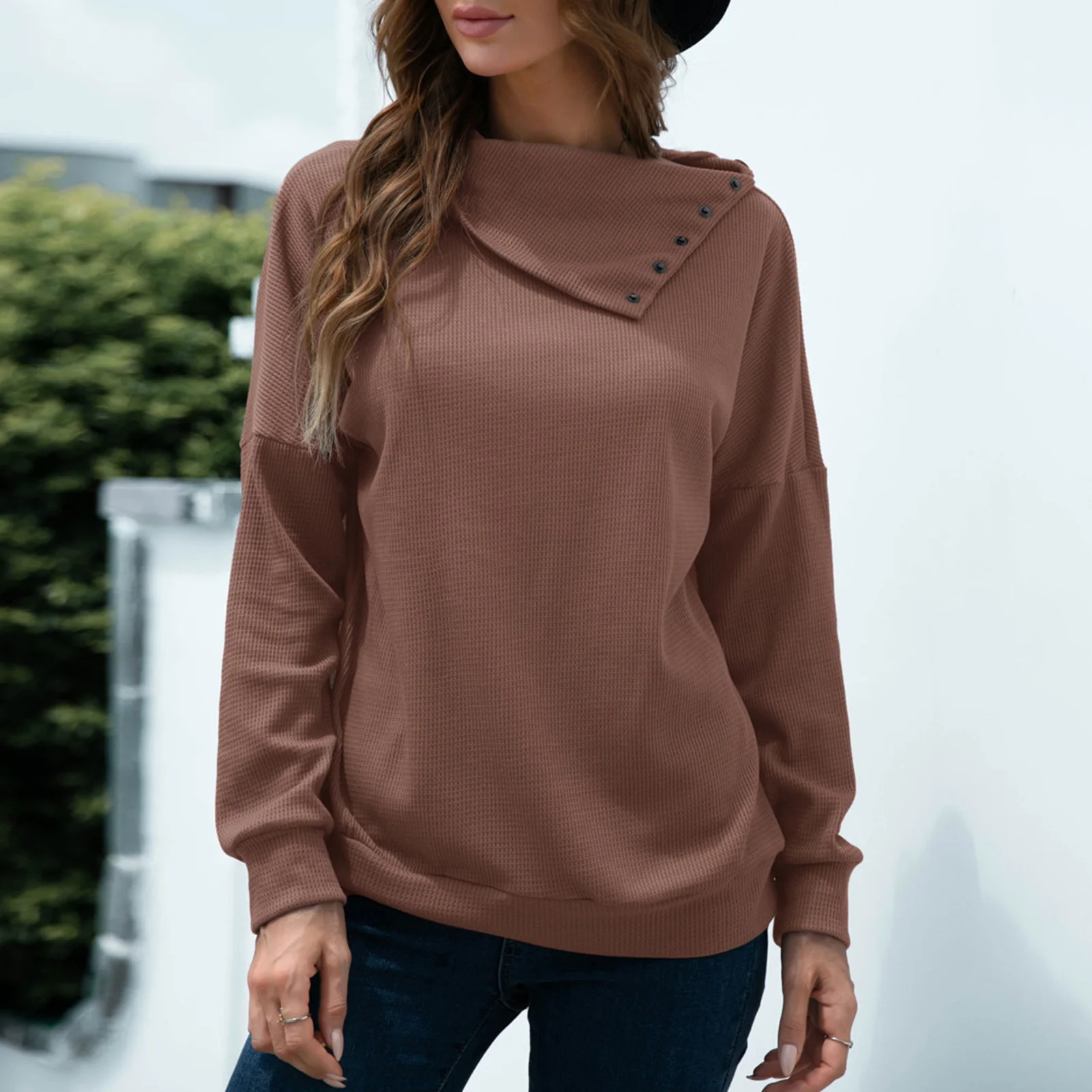 Loose casual tops in waffle-knit feature an asymmetric turn-down collar, long sleeves, and solid color, soft and comfy to wear on fall and winter days. Add it to your wardrobe for a new look.