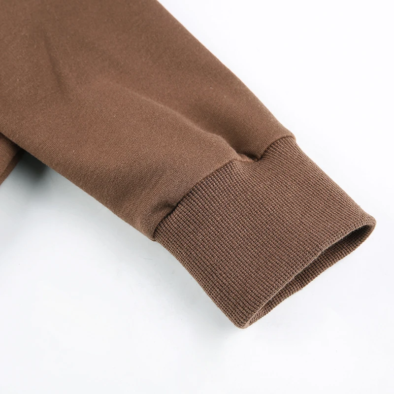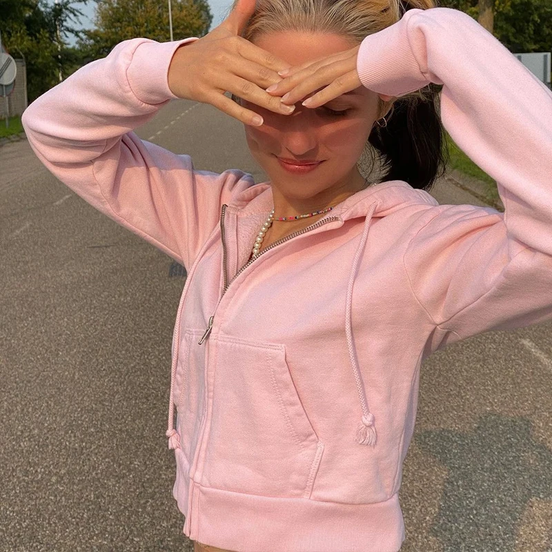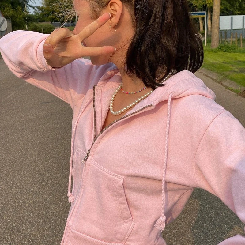 Brown Zip Up Cropped Hooded Sweatshirts Women Autumn Pink O Neck Long Sleeve Harajuku Kawaii Anime Hoodies Vintage Y2k Tracksuit