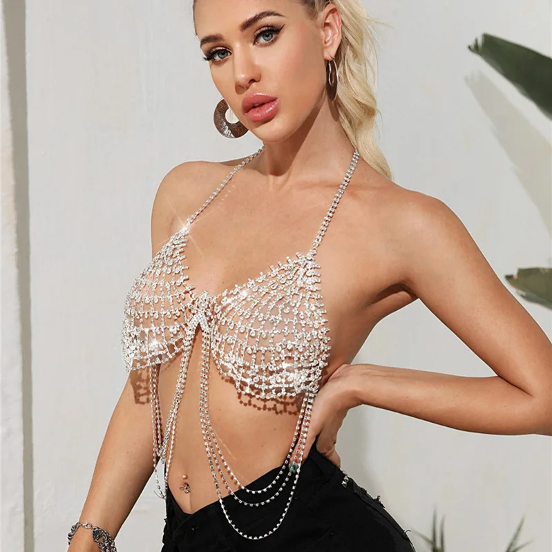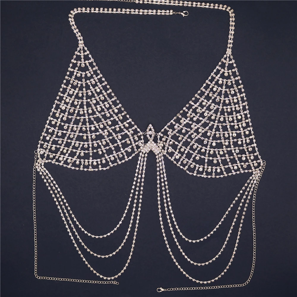 Bright rhinestone body chain jewelry for women sexy adjustable crystal tassel bra chain bikini lingerie nightclub party jewelry