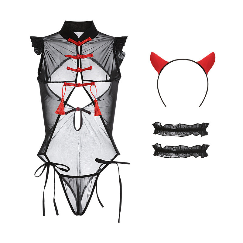 Cosplay Little Devil Onesie Suit Women Sexy Lingerie Set Porno Retro Hollow Net Transparent Bodysuit Erotica Stripper Clothes