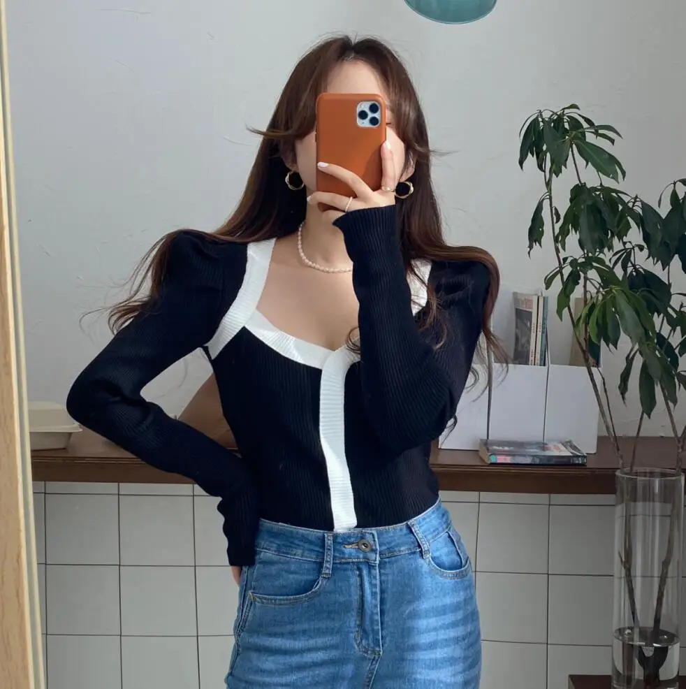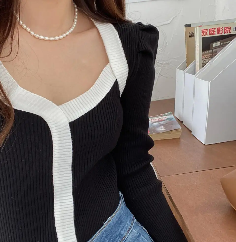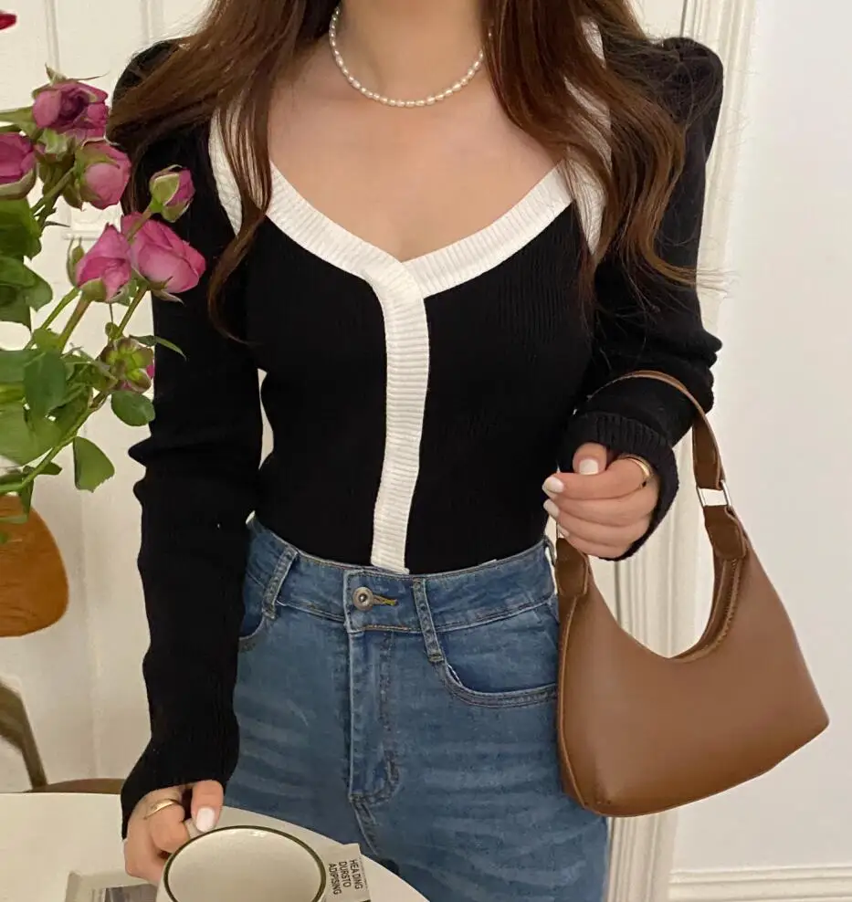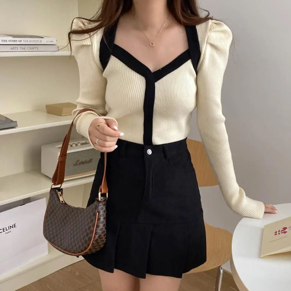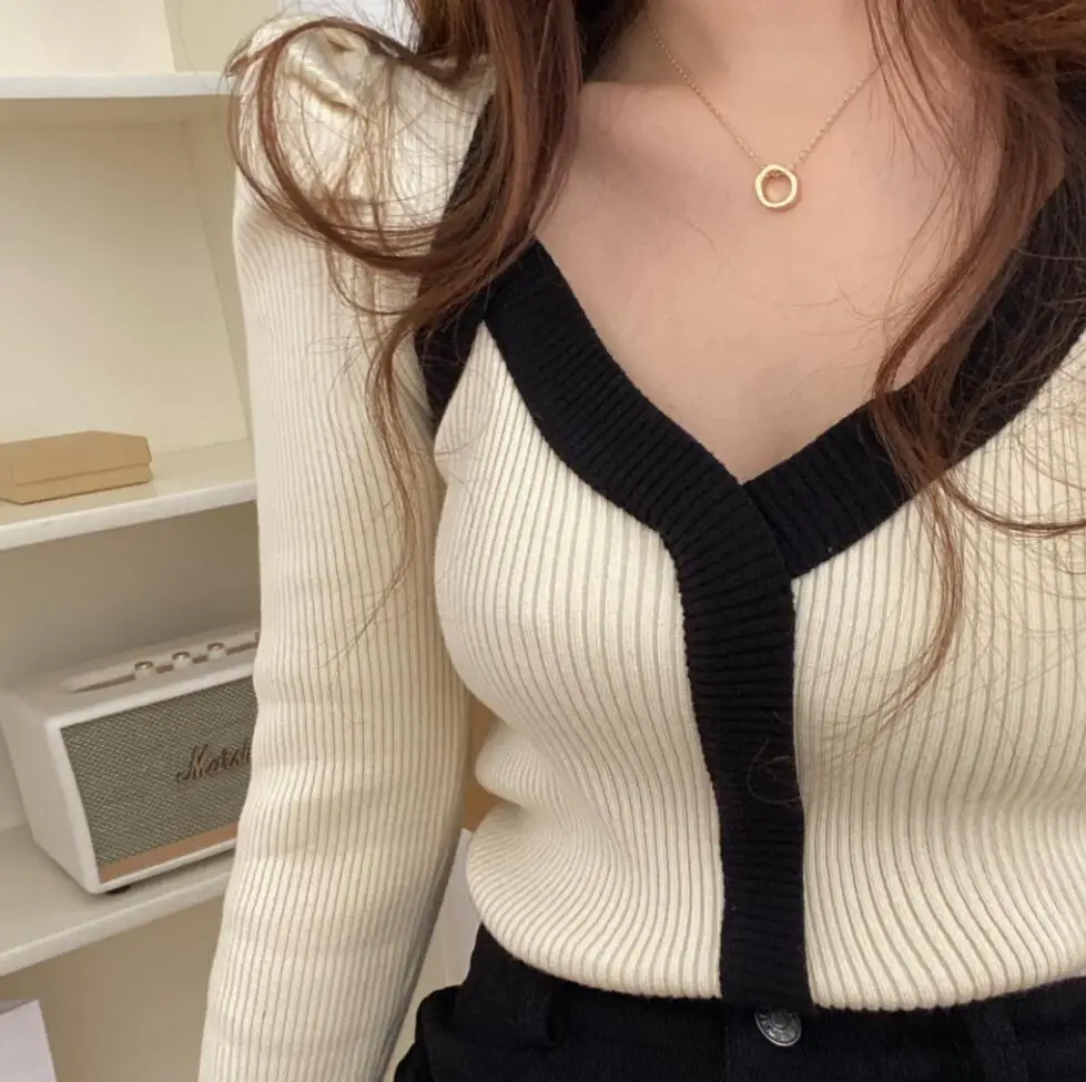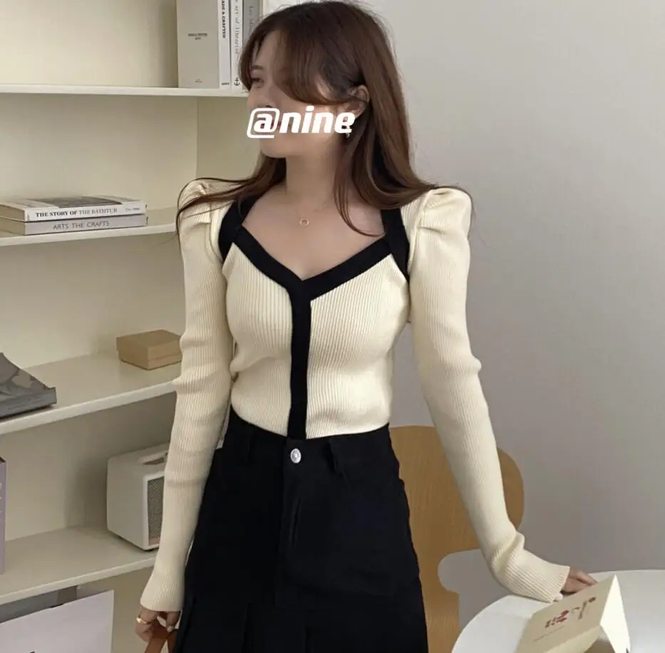 Elegant Square Collar Puff Sleeve Knitted Cardigans Women Slim Fit Skinny Sweater Coat Korean Style Autumn Winter Pull Femme
