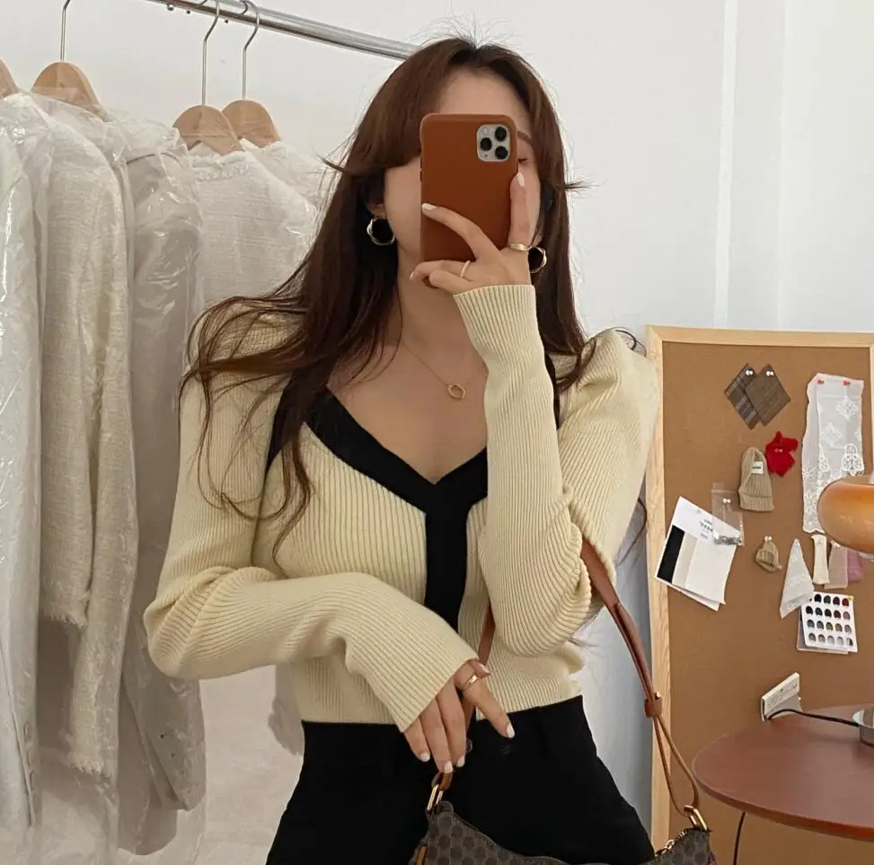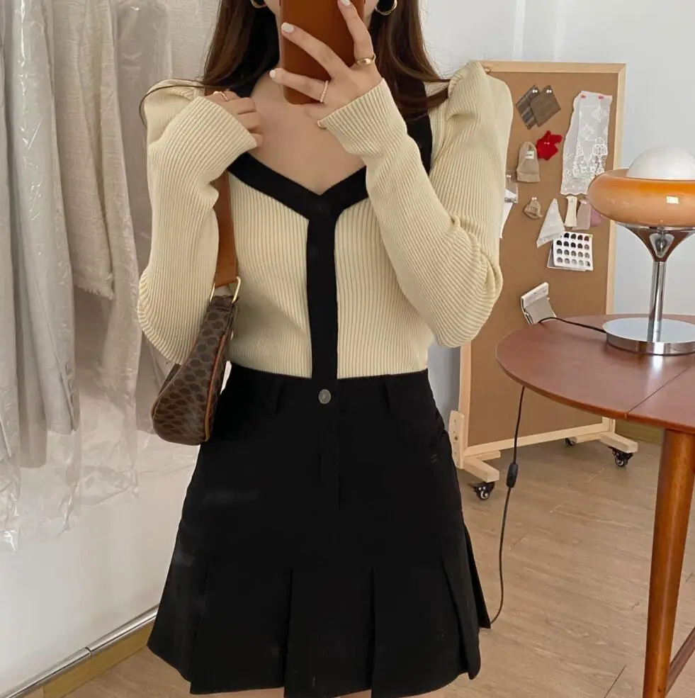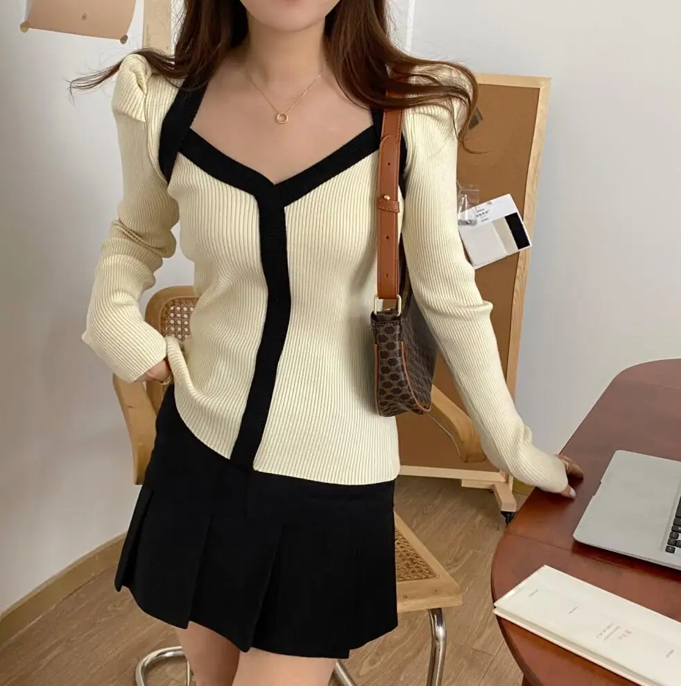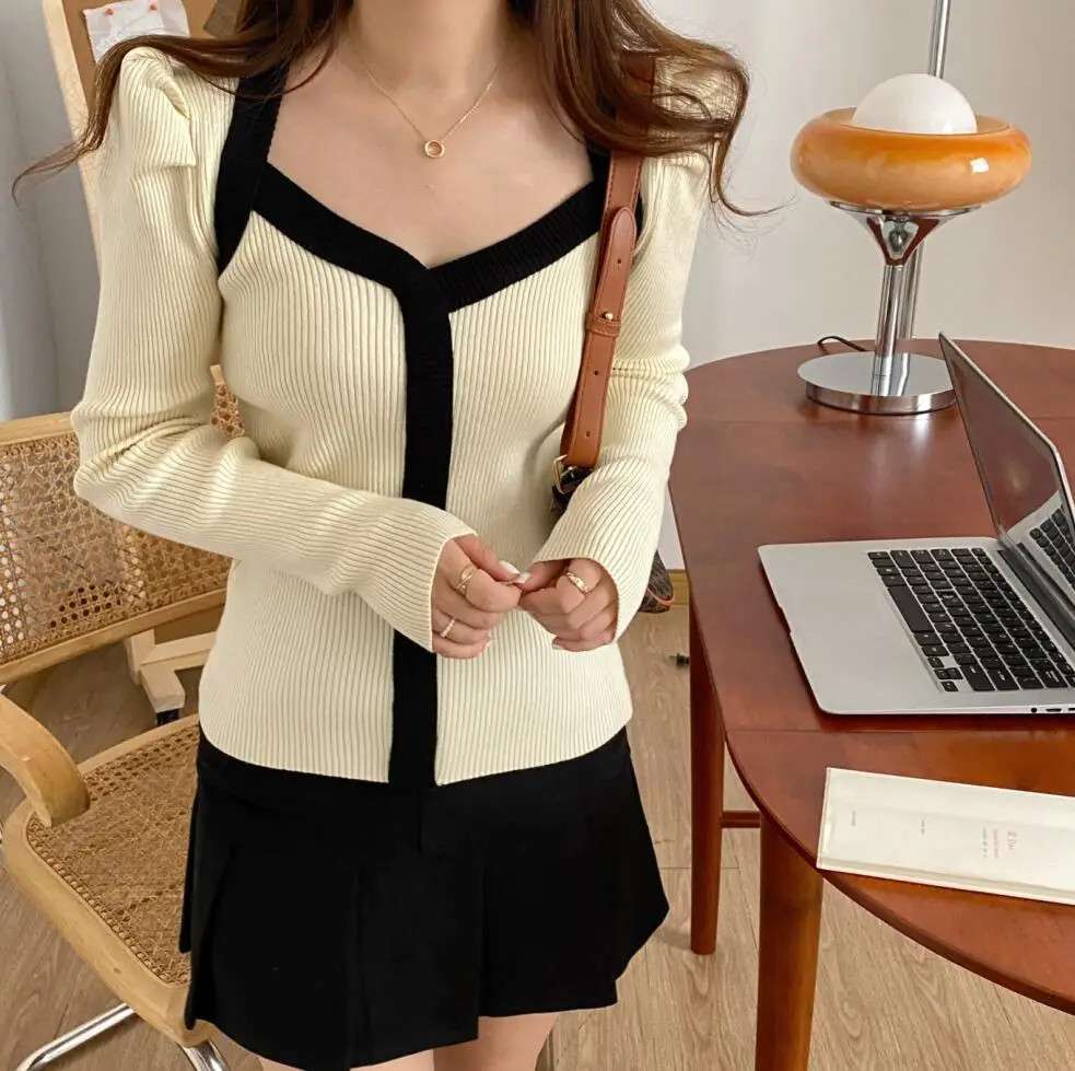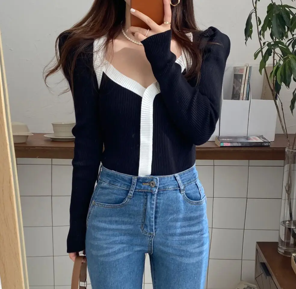 Elegant Square Collar Puff Sleeve Knitted Cardigans Women Slim Fit Skinny Sweater Coat Korean Style Autumn Winter Pull Femme