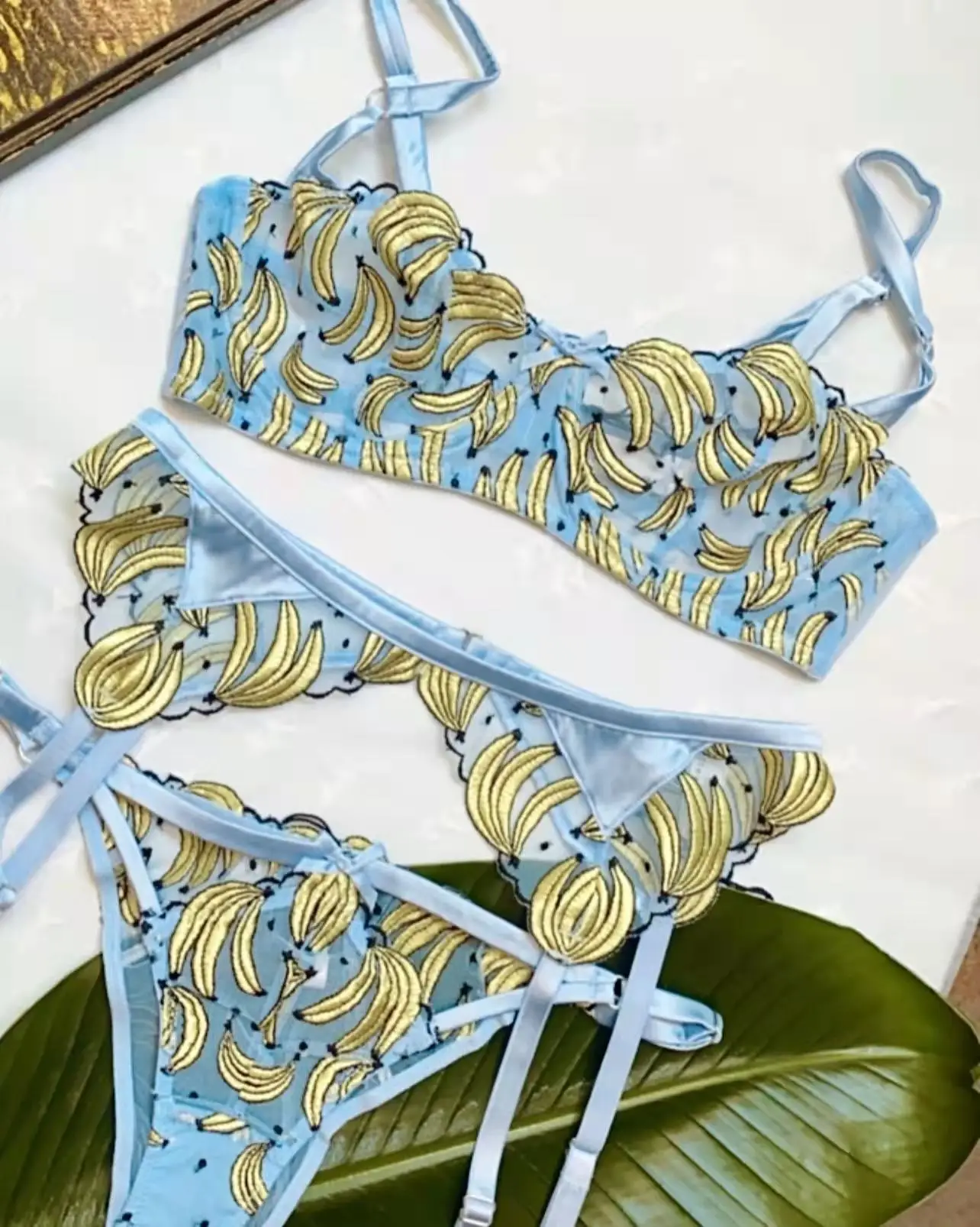 Erotic Lingerie Banana Embroidery Lace Outfits Garters Luxury 3 Pieces Set Transparent Bra and Briefs Set Hot Sexy Underwear