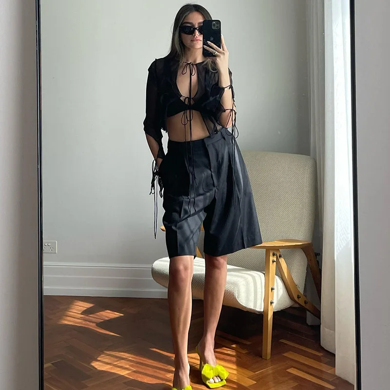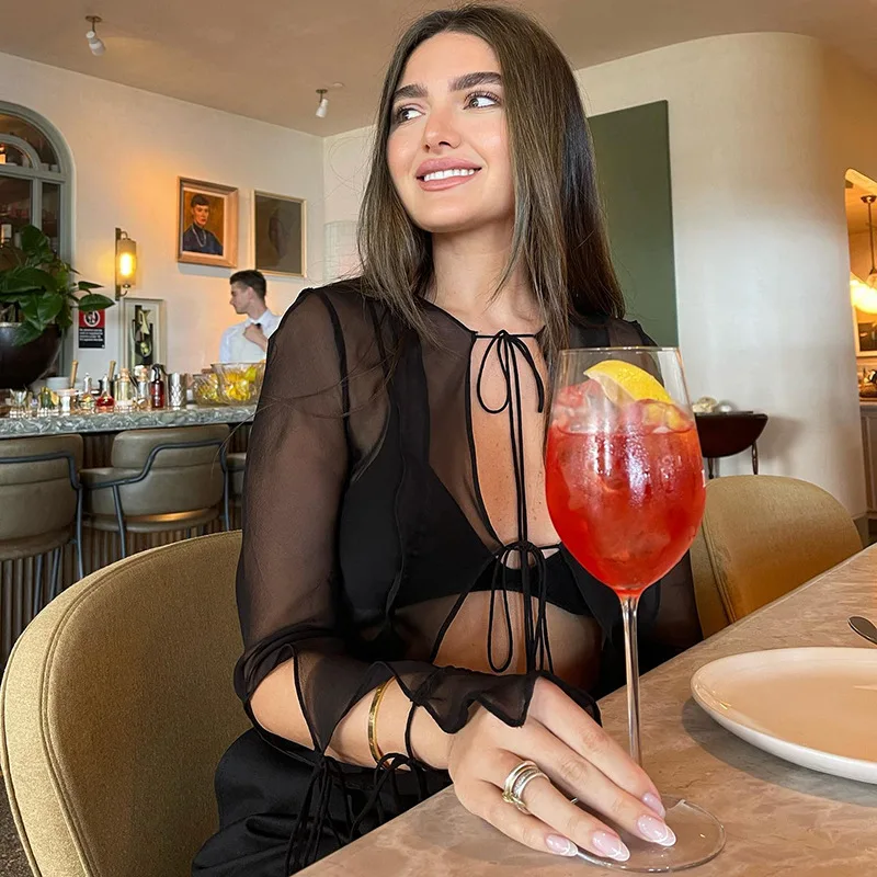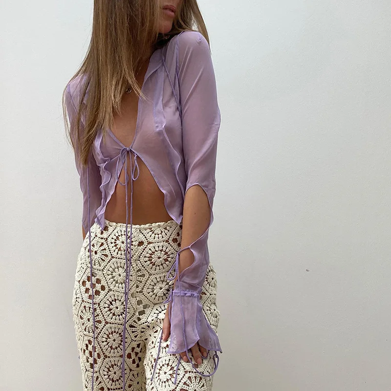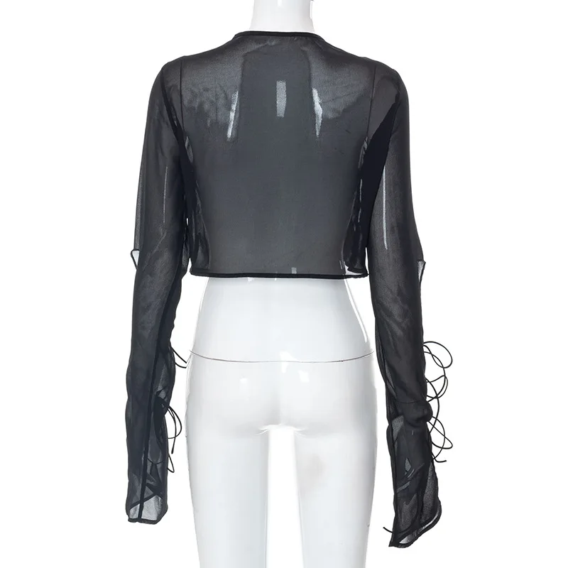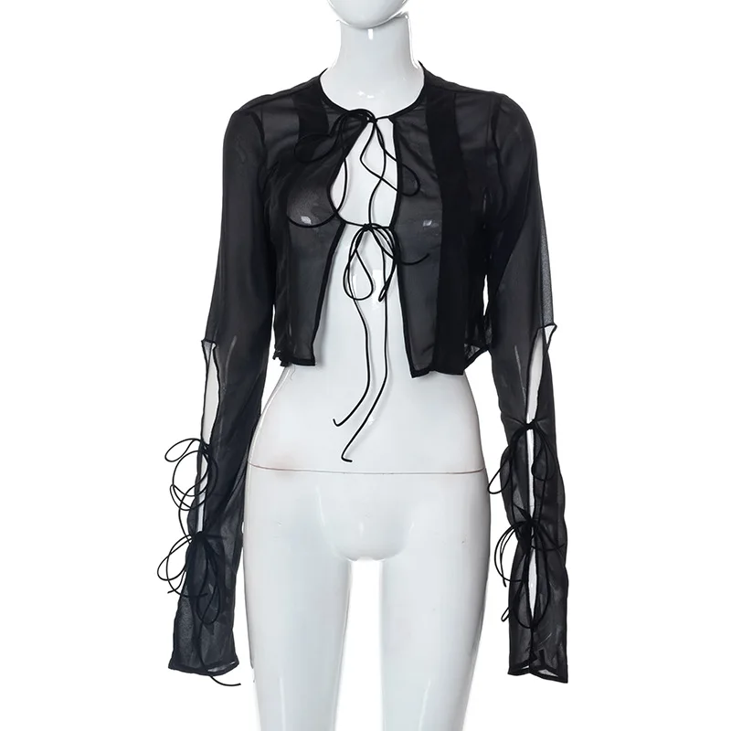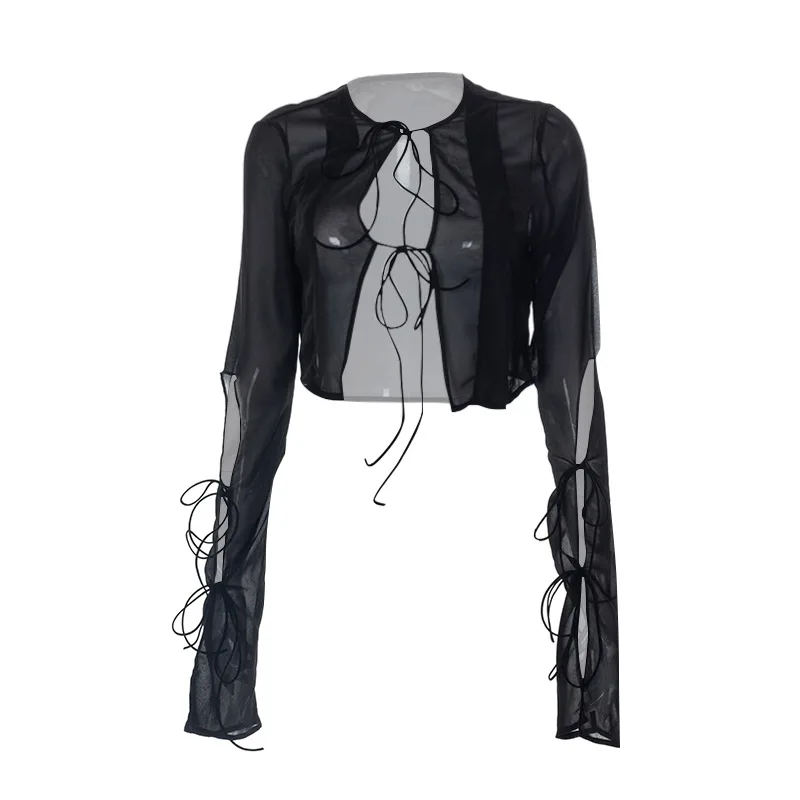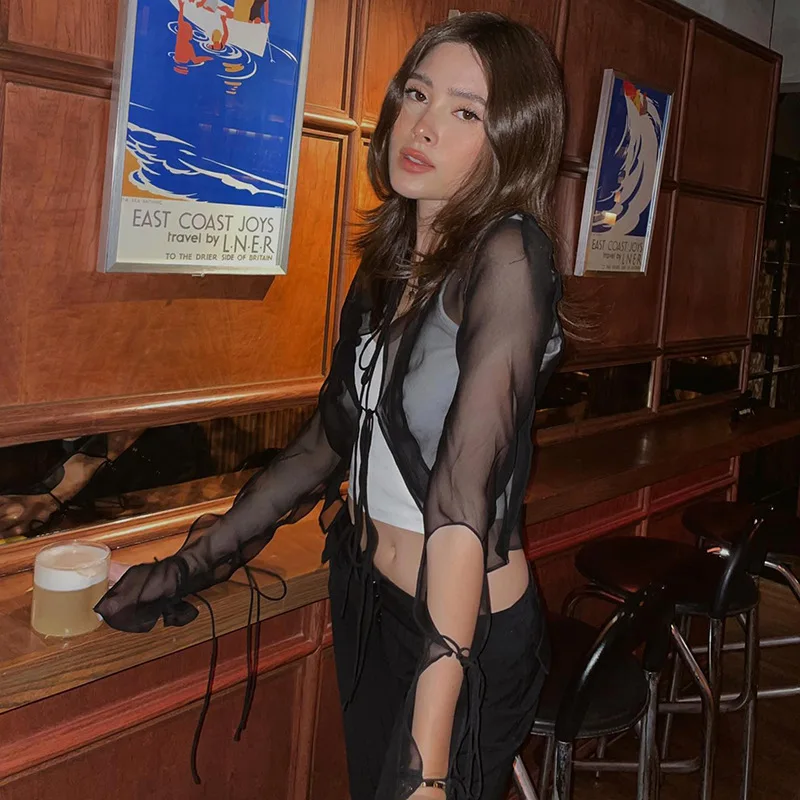 Fashion 2022 Summer Chic Black Perspective Cardigan Women's Clothing Crop Top Rave Festival Sexy Long Sleeves Tops Streetwear